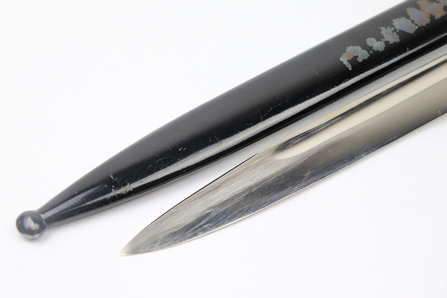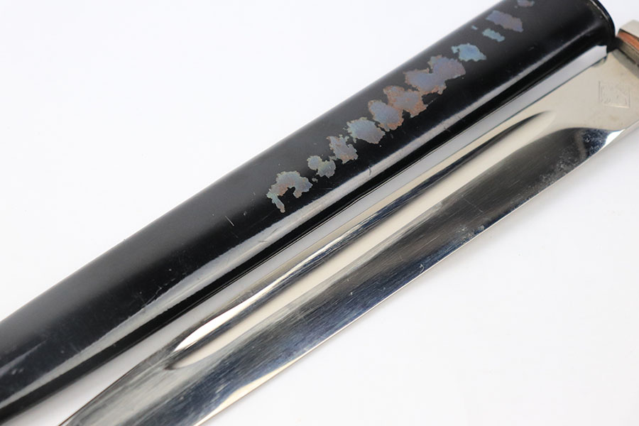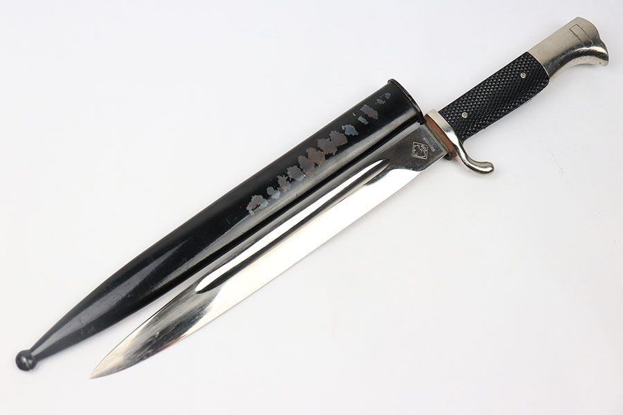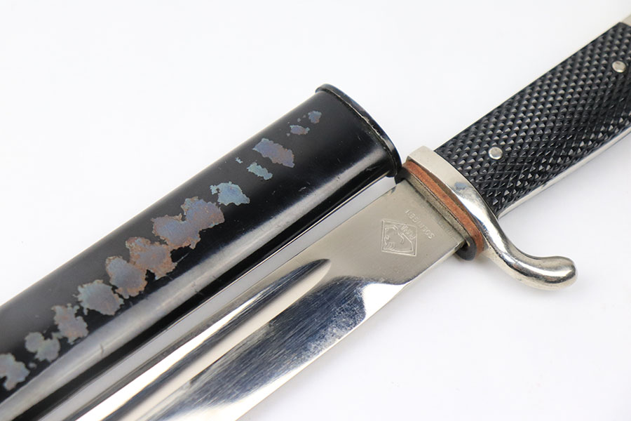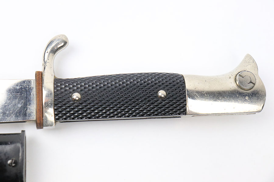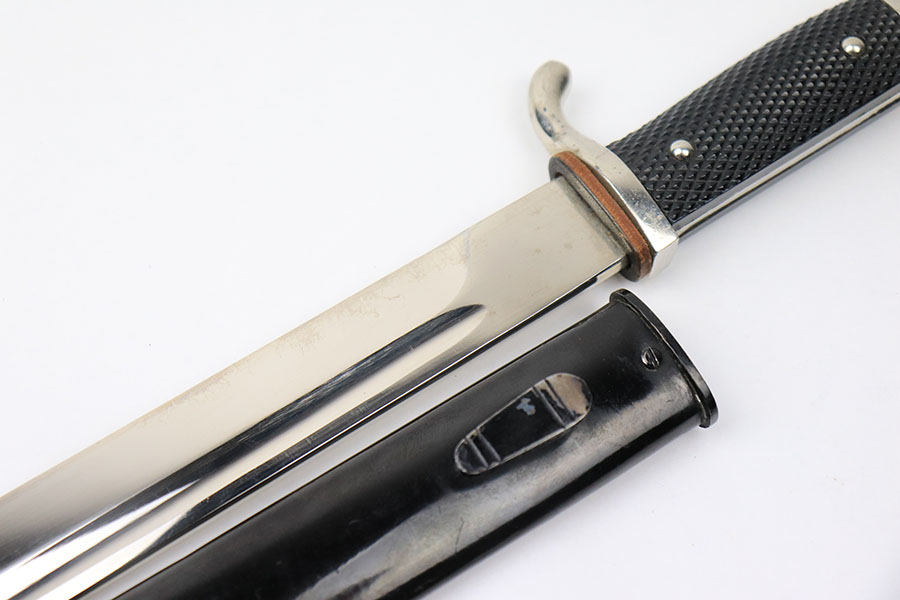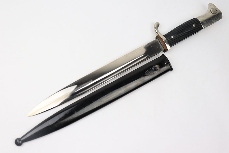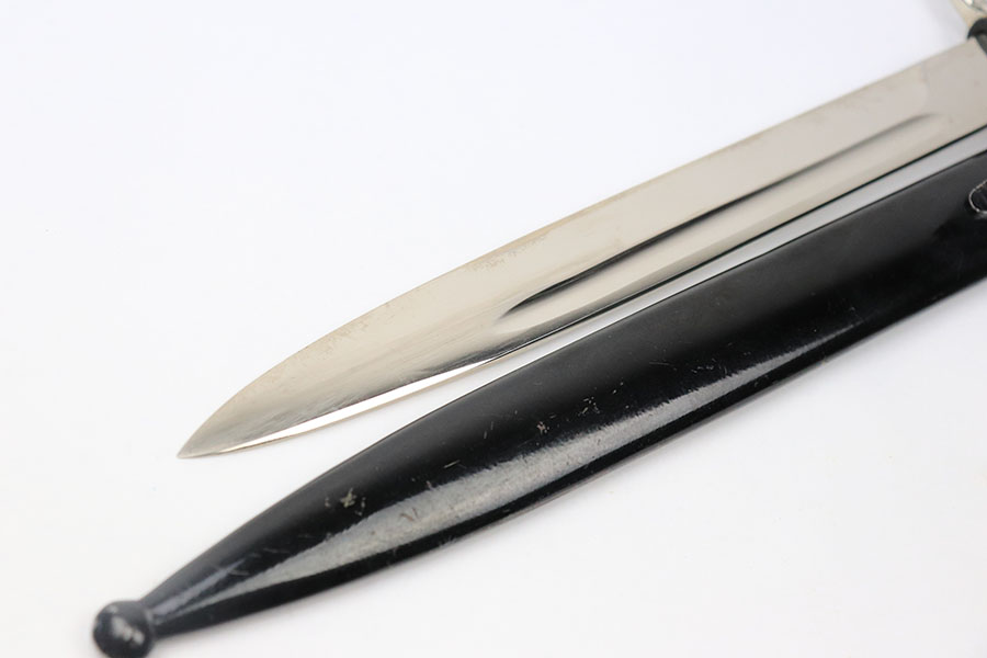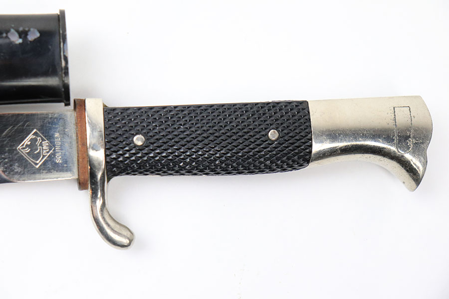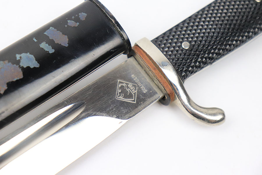 6/23/21 – This is an original WW2 K98 dress / parade bayonet. Maker stamped by Puma on one side. The blade is shiny and excellent with no signs of sharpening. Only a few very small spots of slight discoloration. The grips are excellent without any cracks or chips. The bayonet has some missing paint, but no dents or major issues.