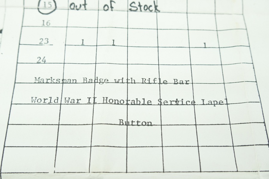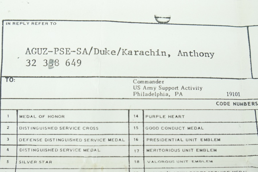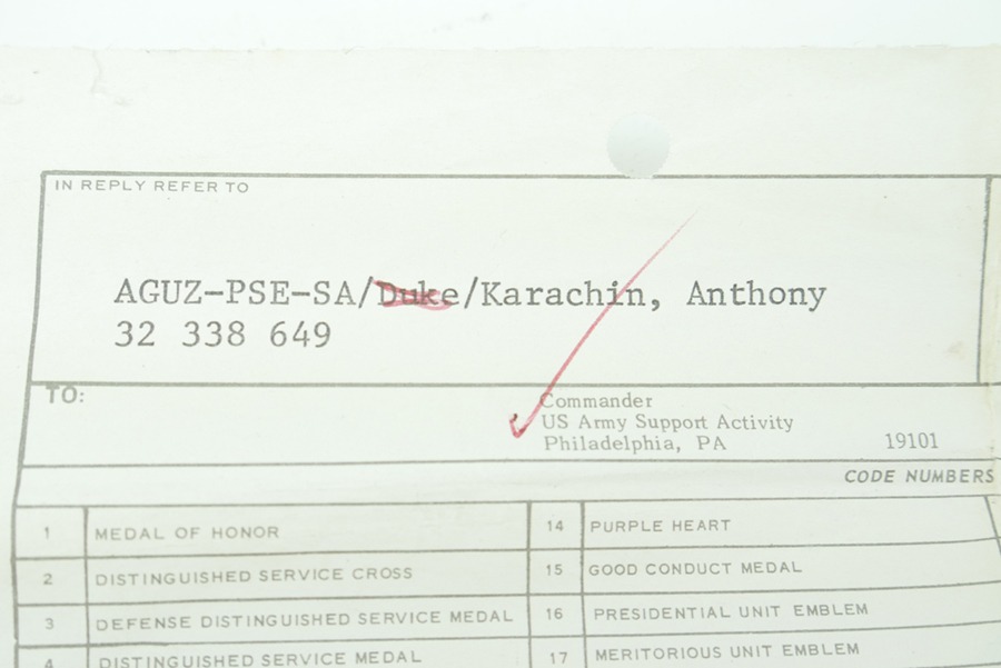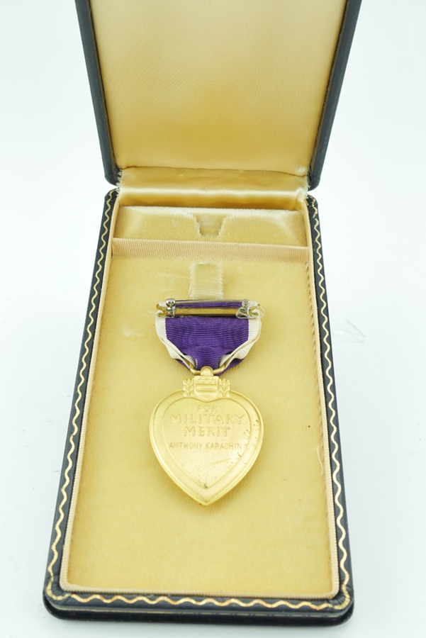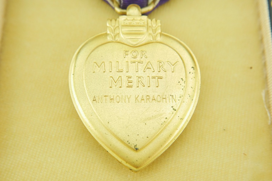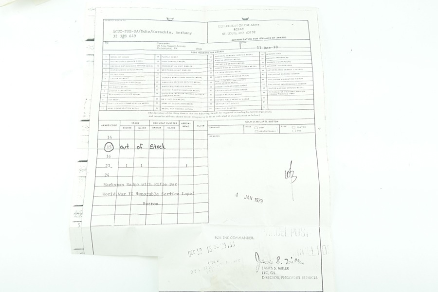 11/15/24 – This is an excellent example of a named Purple Heart Medal with documentation. This medal is from 1978 but was awarded to a veteran for his actions in WW2. This award was given to Anthony Karachin, who served with the U.S. Army in WW2. The documents with this medal indicate that on top of the Purple Heart, Anthony was also awarded the Marksman Badge with Rifle bar, the WW2 Honorable Service button and the European – African – Middle Eastern Campaign medal with one Silver and one Bronze campaign star, as well as an arrow head device. These devices indicate that Anthony took part in 6 campaigns during the war and took part in either an amphibious or parachute landing/invasion, such as D-Day or the invasion of Italy or Africa. The medal itself has some spotty patina, but overall is in excellent condition. This medal additionally comes in it’s original presentation case, the ribbon bar however, is no longer in the case, and only the medal is inside.