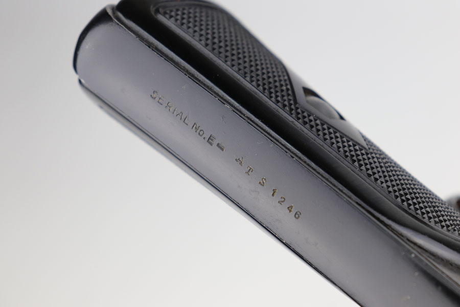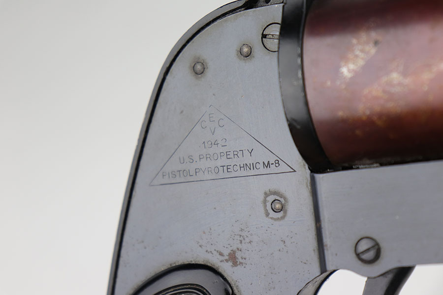 10/6/20 – This is an original 1942 US Flare pistol by CEVC. Known as a “pyrotechnic” M8 pistol. The single barrel has a plumb colored finish and some surface wear / discoloration as shown, but no rust or pitting. Smooth action and fully functional. Maker stamped and dated on the right side of the frame. Bore is in excellent condition. Fires 37mm flares.