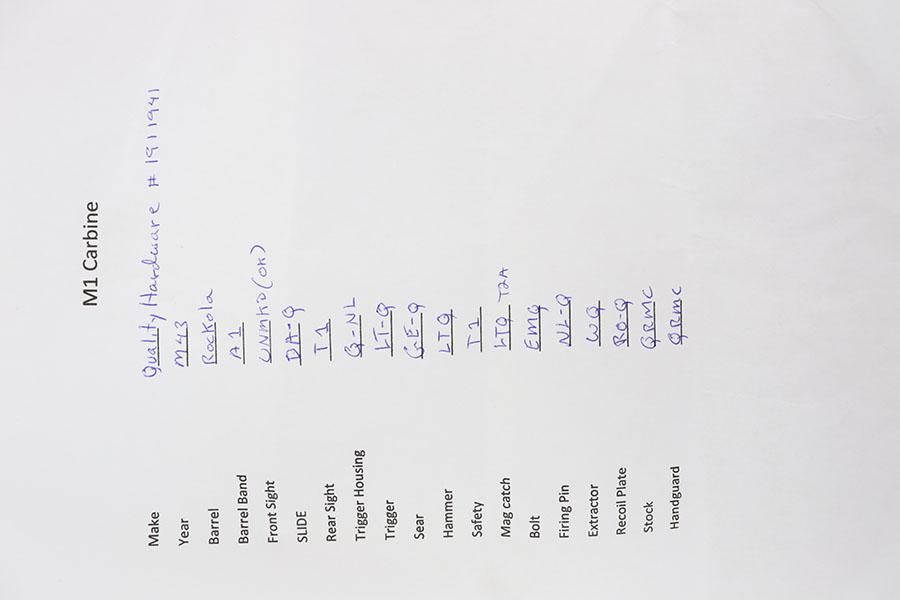 10/14/20 – This is an original and scarce Quality Hardware produced M1 Carbine from 1943. A full parts guide is included in the photos, but all parts are correct with Quality Hardware markings on most small parts, and correct Rock-Ola barrel. Original finish shows some minor thinning on the metal parts but nothing abnormal or standout. Excellent stock with no defects and crossed cannon cartouche on the right side. Excellent bore. Only about 6% of total M1 Carbine production was done at Quality Hardware.