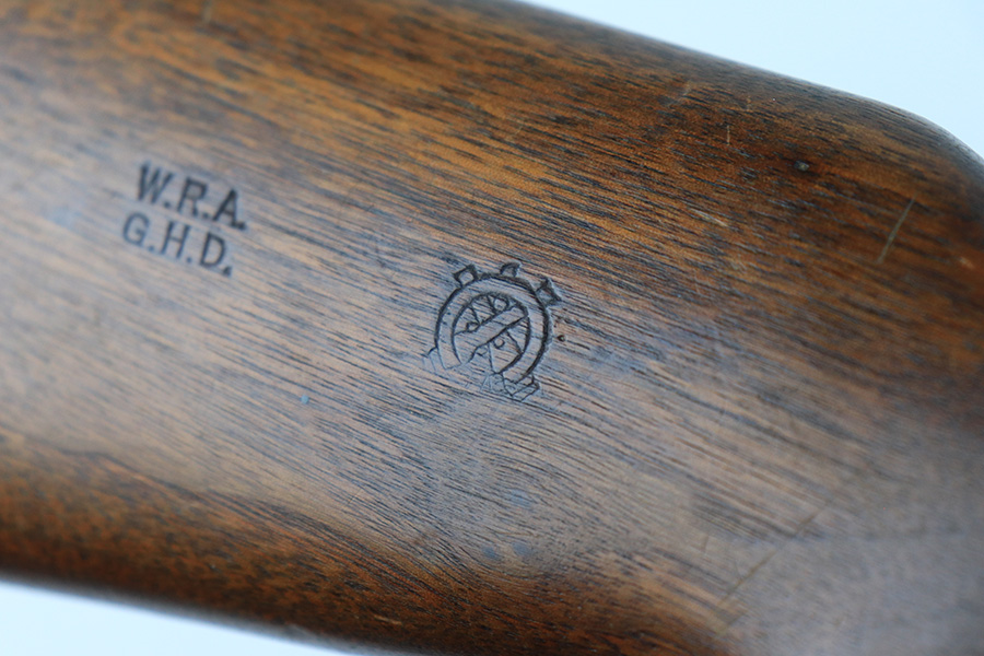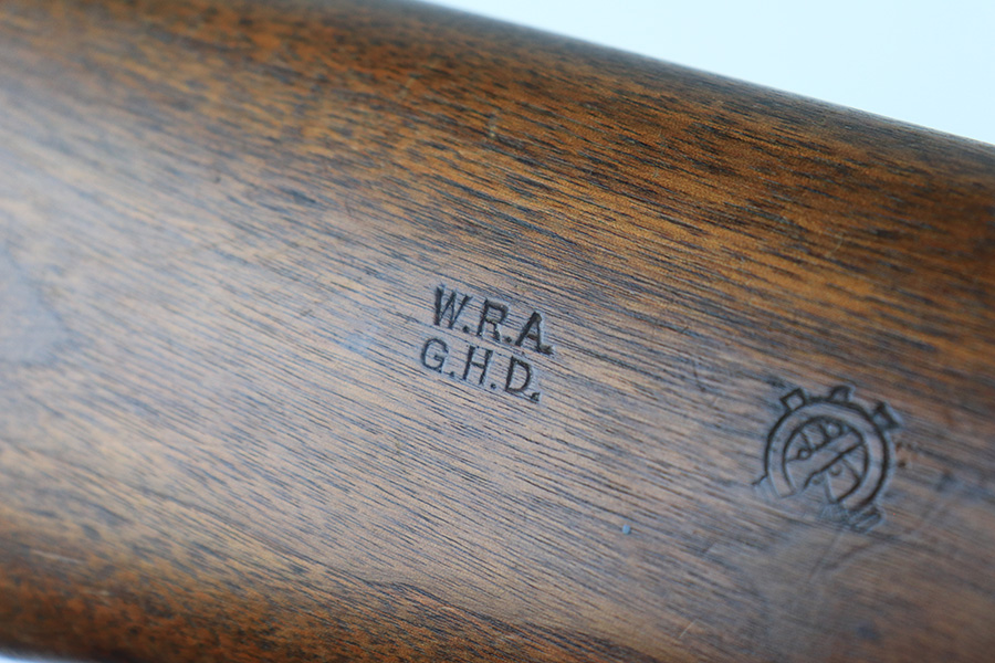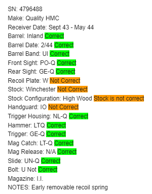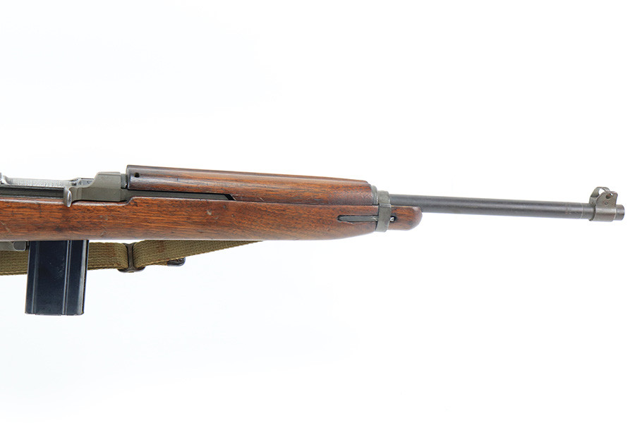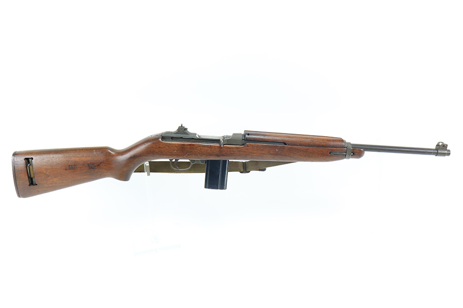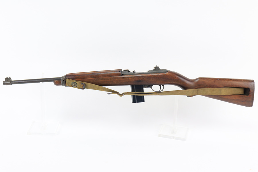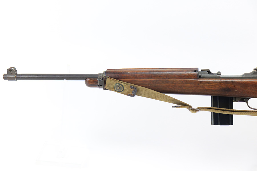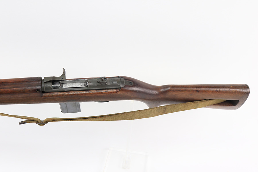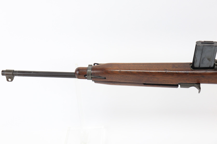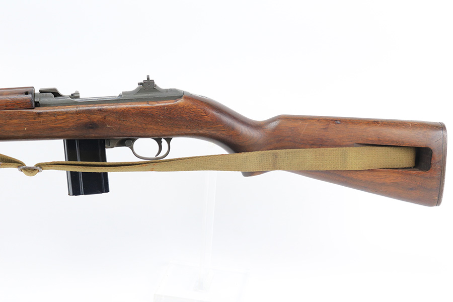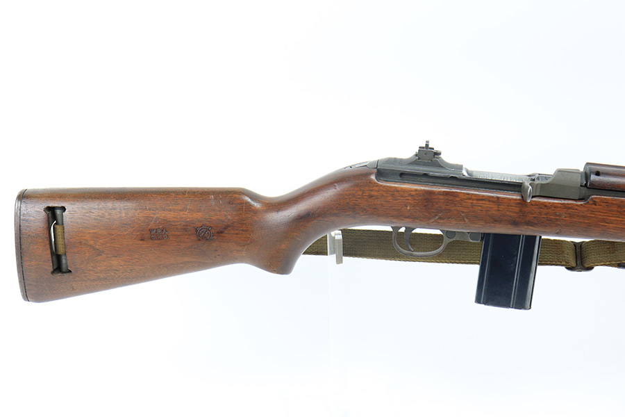 12/1/21 – This is a very nice example of a Quality Hardware M1 Carbine issued to the US military between September 1943 – May 1944. A full parts list with markings is included with the photographs. Overall, it is in very nice condition, retaining most of its parkerized finish. The bolt is blued, although its bluing is mostly worn away. There are some light handling marks around the muzzle and front sight. Scratchy wear along the barrel, especially on the underside. Some spotty oxidation on the barrel band and noticeable brown patina on the trigger guard. The stock has a cross-canon military cartouche and “W.R.A G.H.D” Winchester inspector initials. There are small dings and scratches throughout, most noticeable on the right side near the trigger. The gun comes with a period-correct magazine, canvas sling, and oiler. The bore is mint.