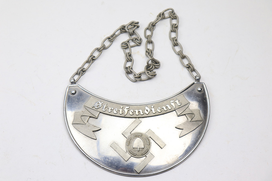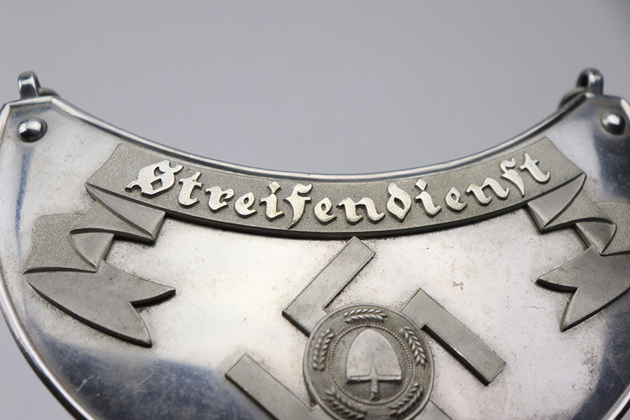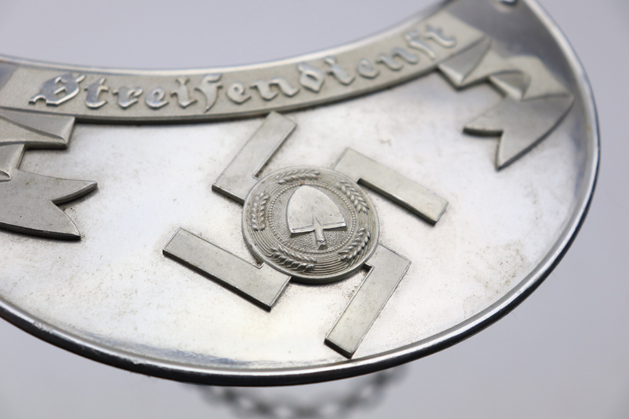 3/14/22 – This is an original RAD Gorget worn by standard bearers of the German Labor Service, also known as the RAD. The gorget is in excellent condition with lightweight aluminum construction. Measures about 5.5 inches long and 5 inches wide. Very nice felt backing has some mild edge wear but no significant wear. The front has some mild patina throughout but no rust or dark discoloration of note.
