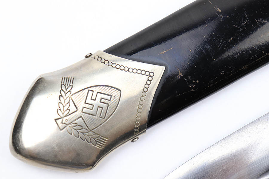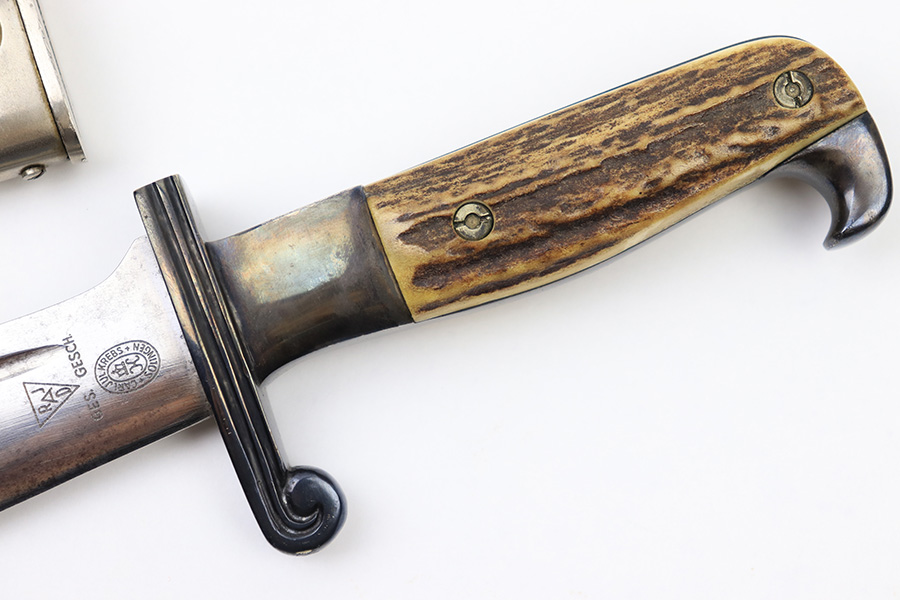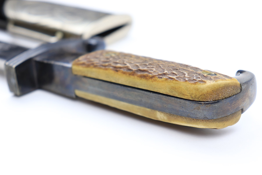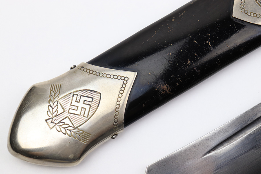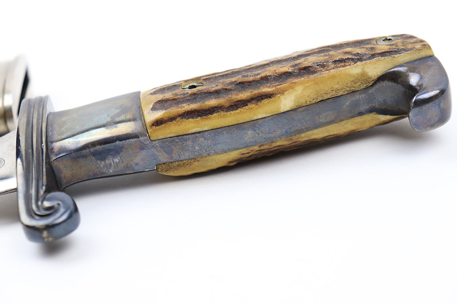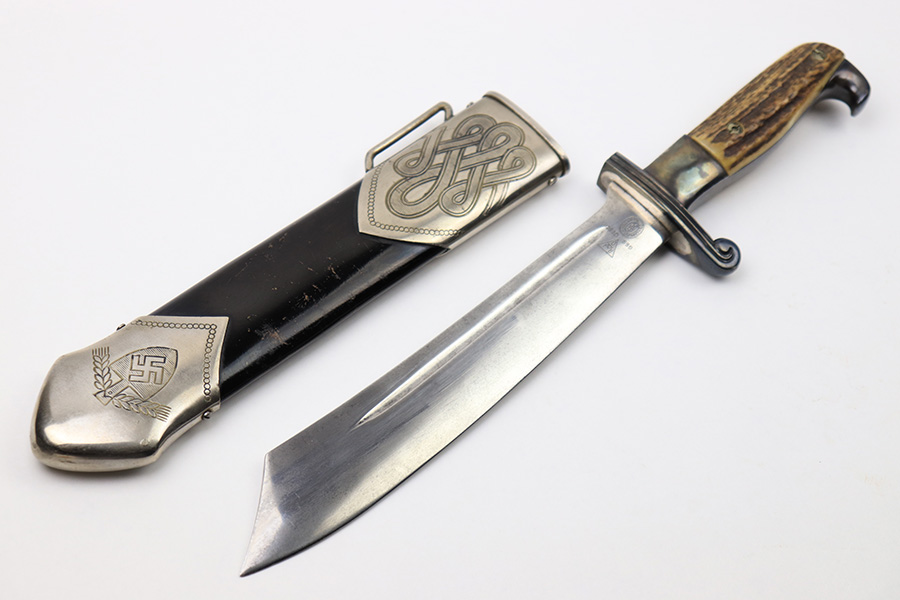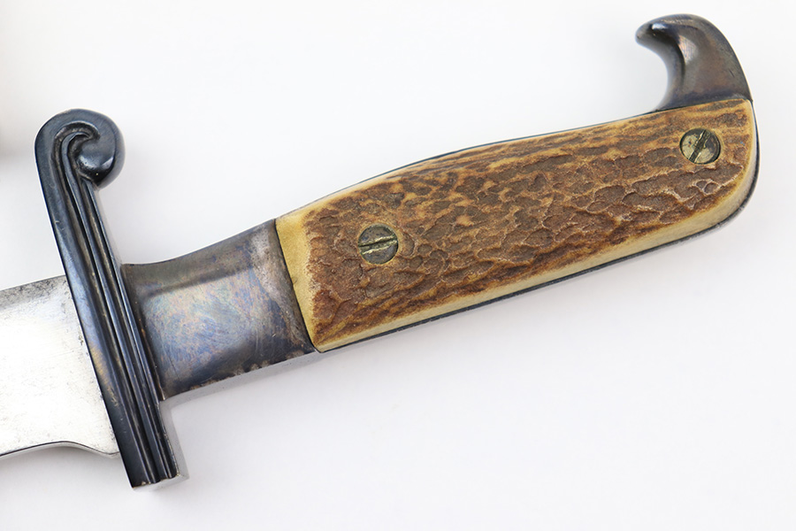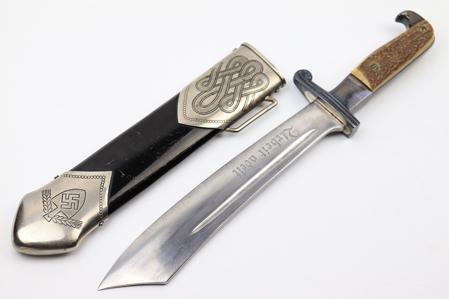 7/5/22 – This is an original WW2 German RAD (German Labor Service) Hewer knife. The Hewer is marked “Arbeit adelt” on one side, and maker stamped on the other, as shown. There’s mild speckling and spotty surface patina throughout the blade. This is typical aging wear. There’s no rust, pitting, or sharpening present. The handle still has the original finish in tact as shown. There’s some mild surface patina and discoloration but overall in great shape. The stag handle has no cracks or chips. Comes with an original scabbard that’s also in great condition with some mild aging patina but no major issues. A great, straightforward example.