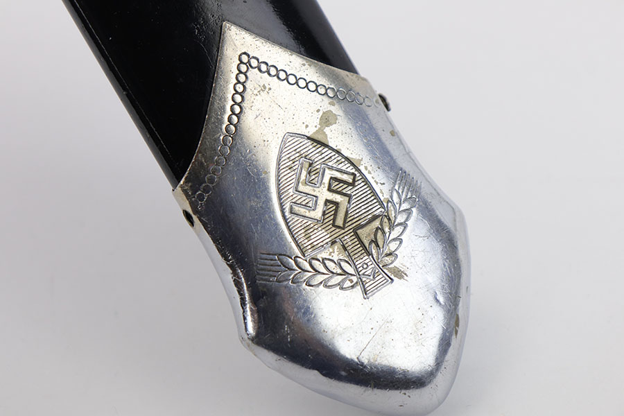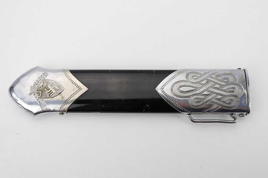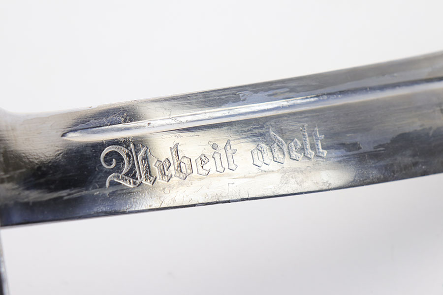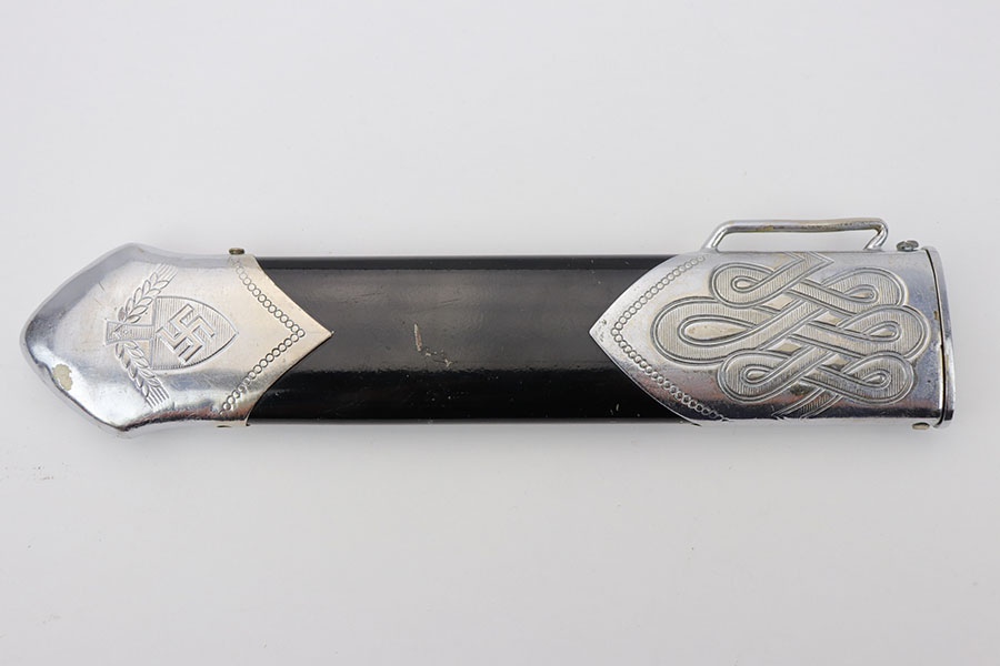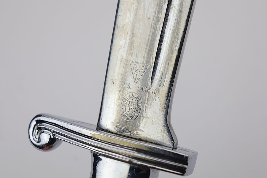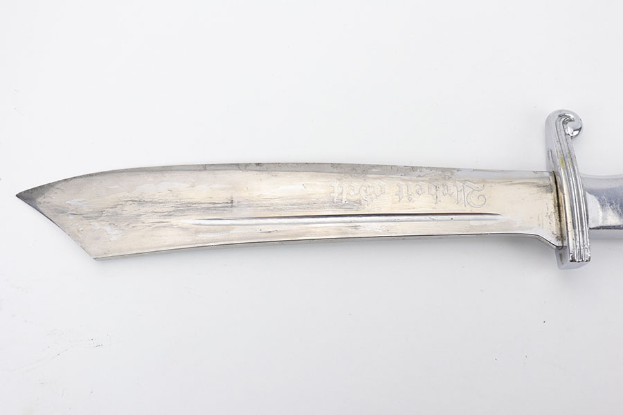 1/20/20 – This is a rare RAD Enlisted Rank’s Hewer dagger. Overall an original piece in great condition. The original nickel-silver plating on all fittings are excellent, but there is some minor chipping / plating loss on the hand guard and base of the scabbard. The forged steel blade of this dagger also has some plating / finish loss, as shown in photos. This plating loss is evident on both sides of the blade. One side is maker stamped, and the other is inscribed in German. The RAD motto, “Arbeit Adelt”, (Labor ennobles) is etched in modified Old English script into the surface of obverse of the blade. The blade also has some very light surface scratches and scabbard run marks. About 3-4 very minor nicks in the edge as well from light use. The scabbard has minimal paint loss, and is missing 1 screw in the base. Priced accordingly. All original and authentic.