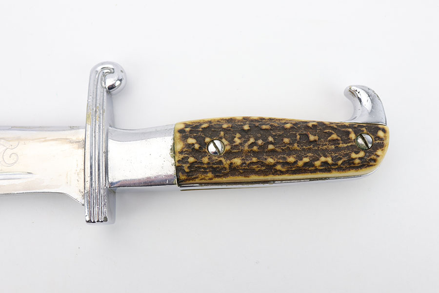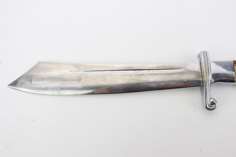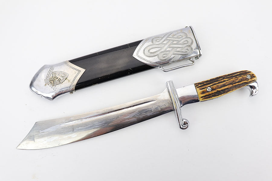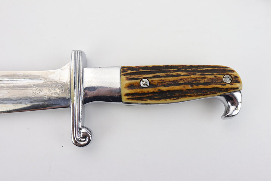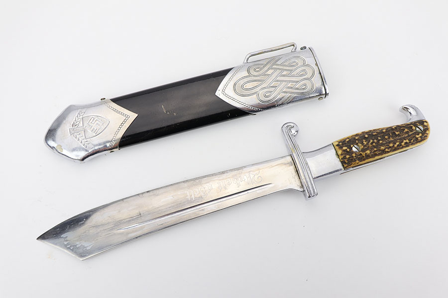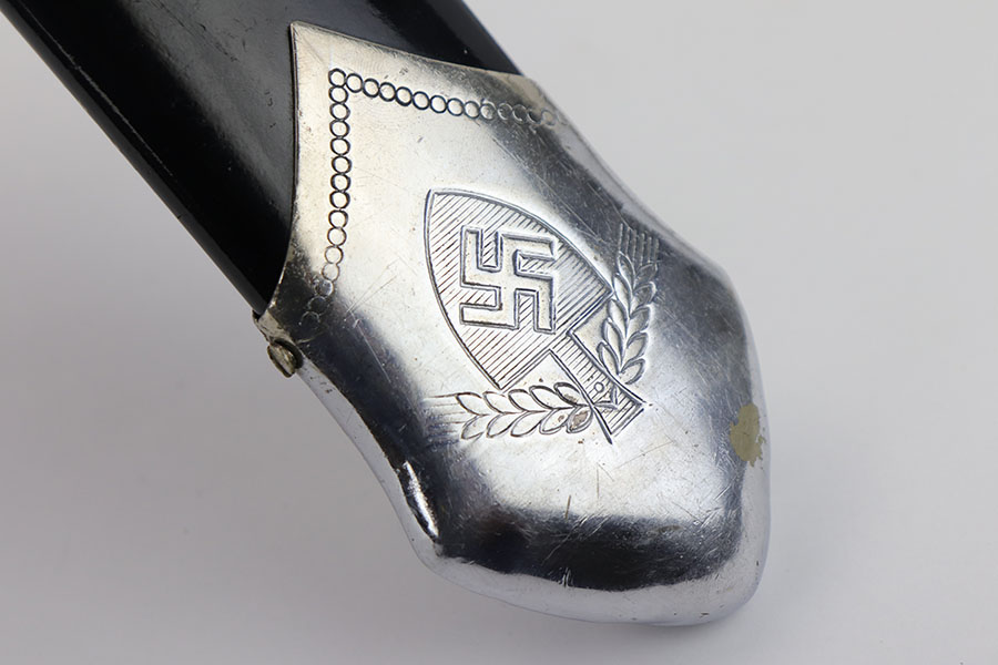 1/20/20 – This is a rare RAD Enlisted Rank’s Hewer dagger. Overall an original piece in great condition. The original nickel-silver plating on all fittings are excellent, but there is some minor chipping / plating loss on the hand guard and base of the scabbard. The forged steel blade of this dagger also has some plating / finish loss, as shown in photos. This plating loss is evident on both sides of the blade. One side is maker stamped, and the other is inscribed in German. The RAD motto, “Arbeit Adelt”, (Labor ennobles) is etched in modified Old English script into the surface of obverse of the blade. The blade also has some very light surface scratches and scabbard run marks. About 3-4 very minor nicks in the edge as well from light use. The scabbard has minimal paint loss, and is missing 1 screw in the base. Priced accordingly. All original and authentic.