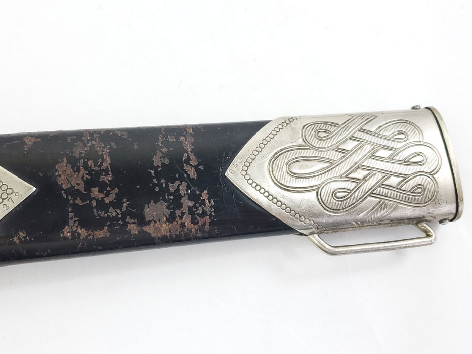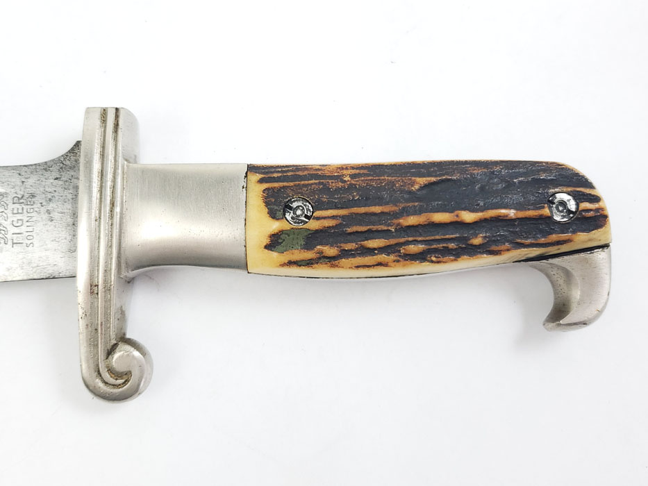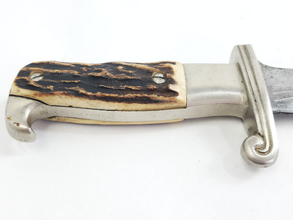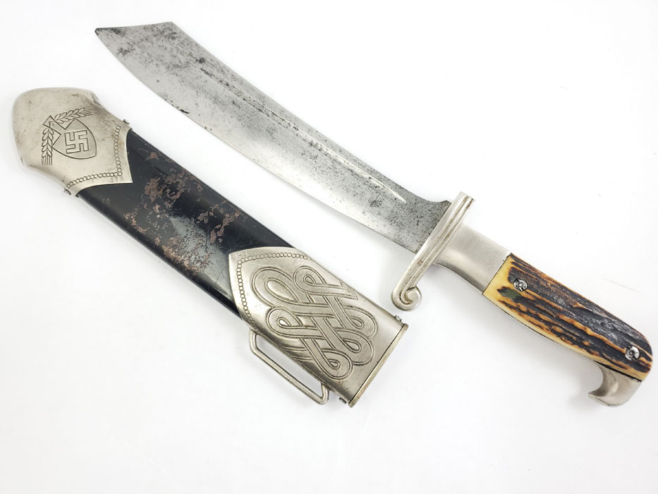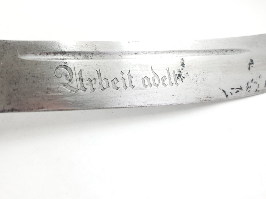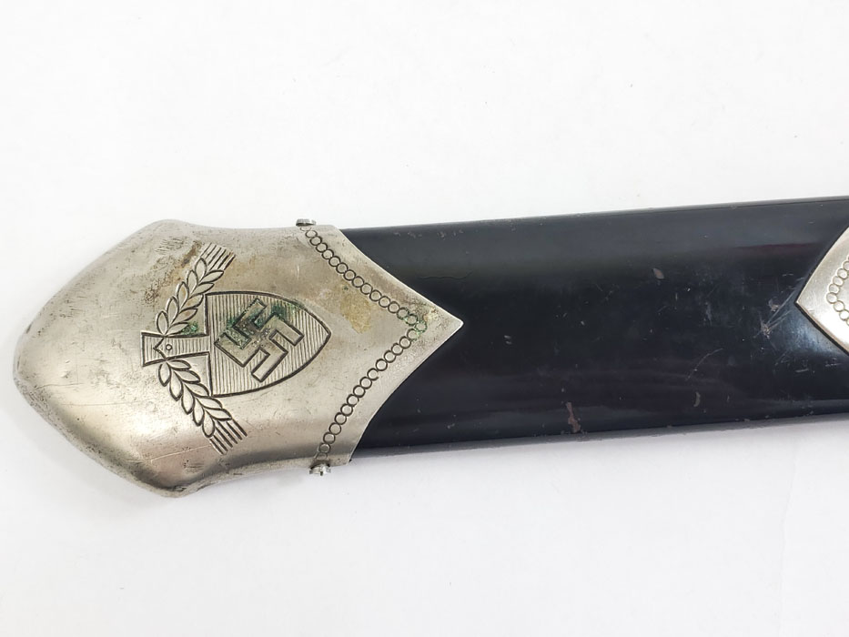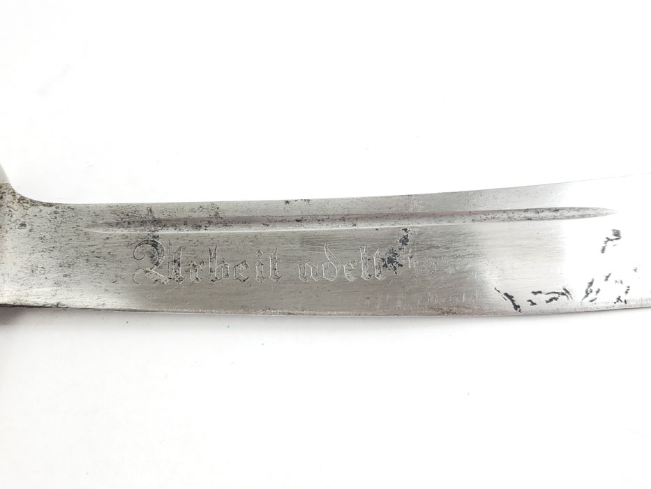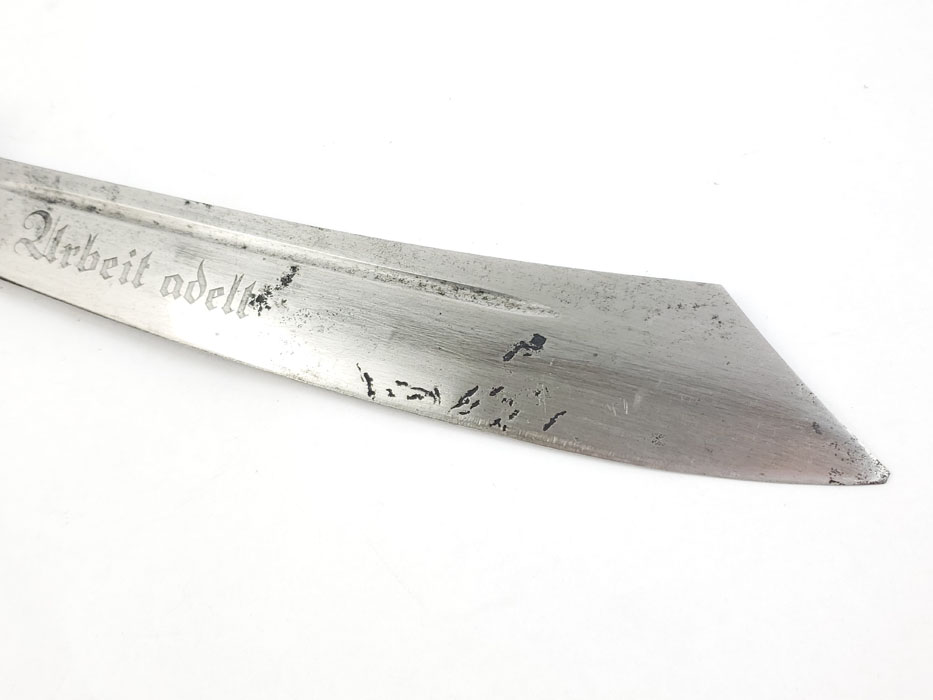 5/26/20 – This is a rare RAD Enlisted Rank’s Hewer dagger. Overall in good collectible condition with all original parts. The forged steel blade of this dagger is maker stamped by Tiger, and has a RJ RAD triangle above the maker stamp. There’s also light oxidation throughout the blade as shown in photos. The majority of the oxidation is light, and has no texture, but there are some darker spots that do dip into the steel and have texture when you run your finger over them. The RAD motto, “Arbeit Adelt”, (Labor ennobles) is etched in modified Old English script into the surface of obverse of the blade. The blade also has some very light surface scratches and scabbard run marks. The scabbard has minimal paint loss, but overall no dents and all screws in tact. All original and authentic.