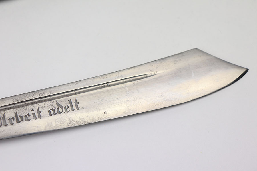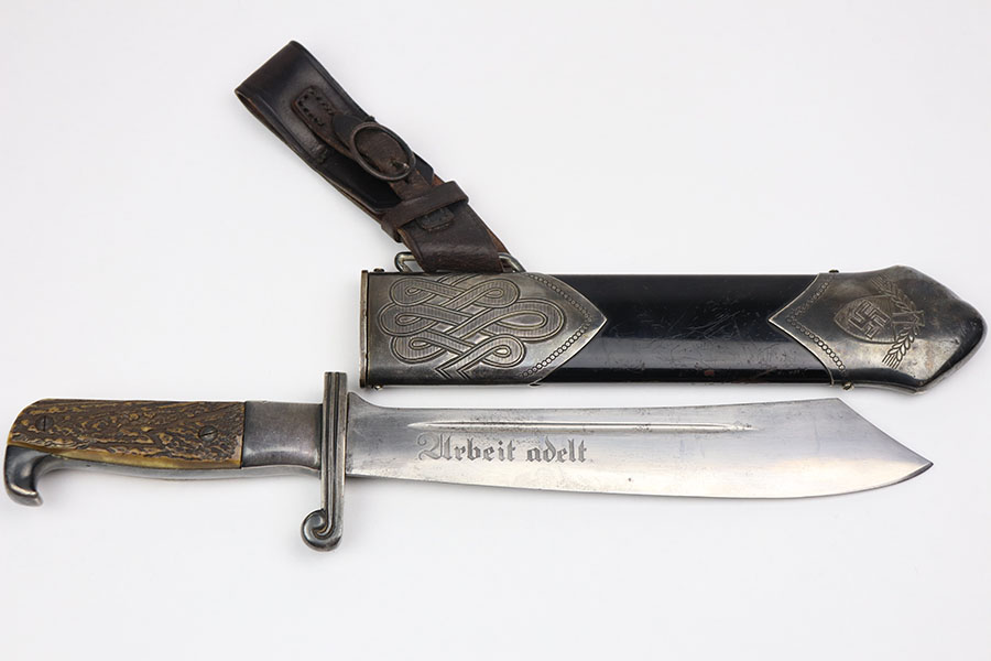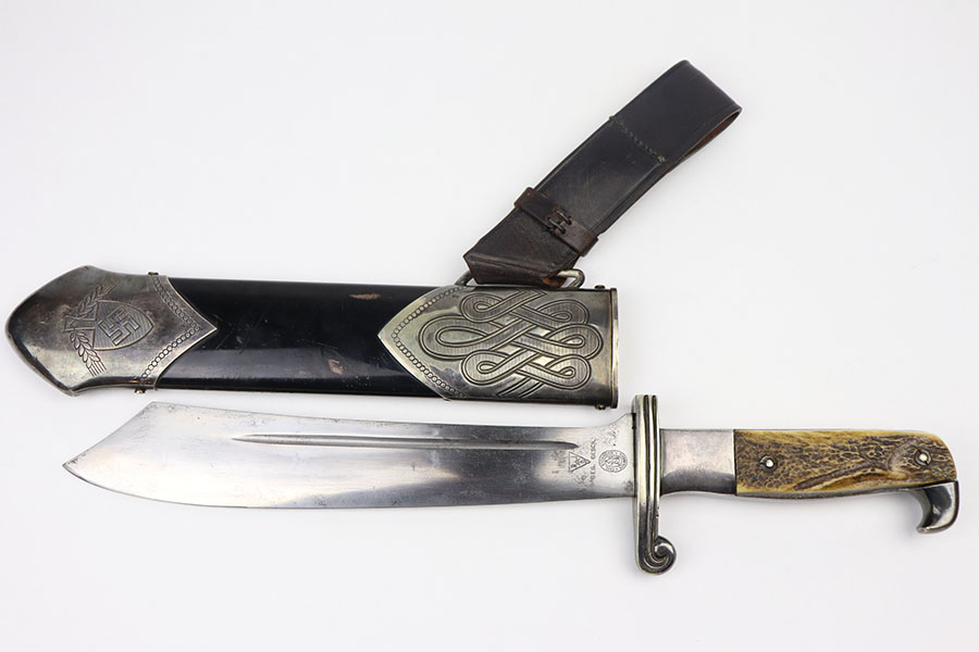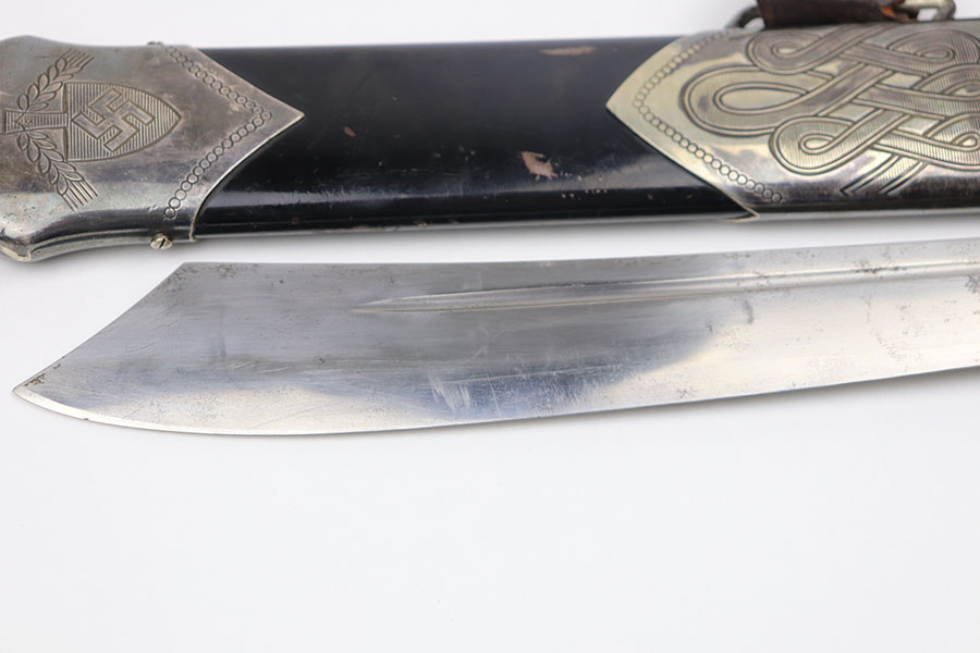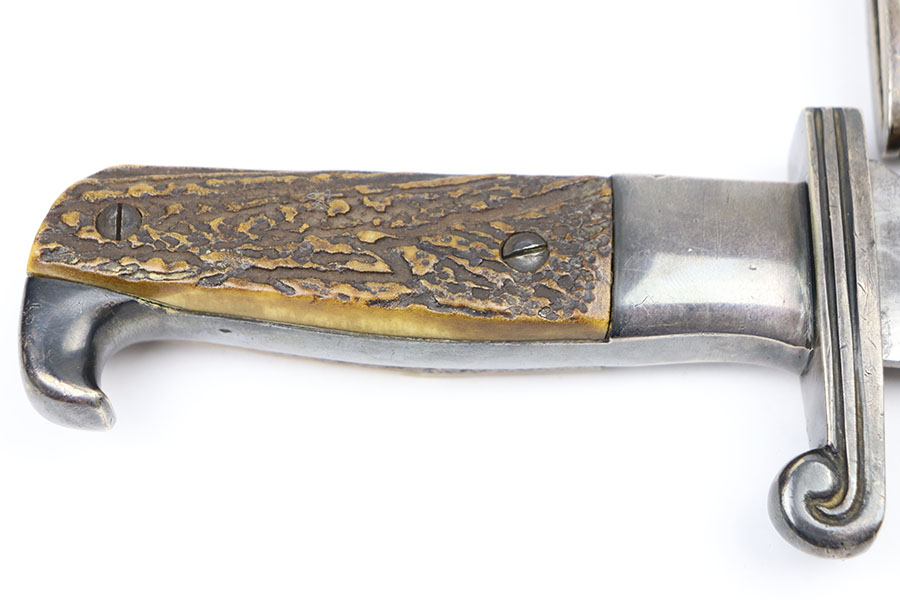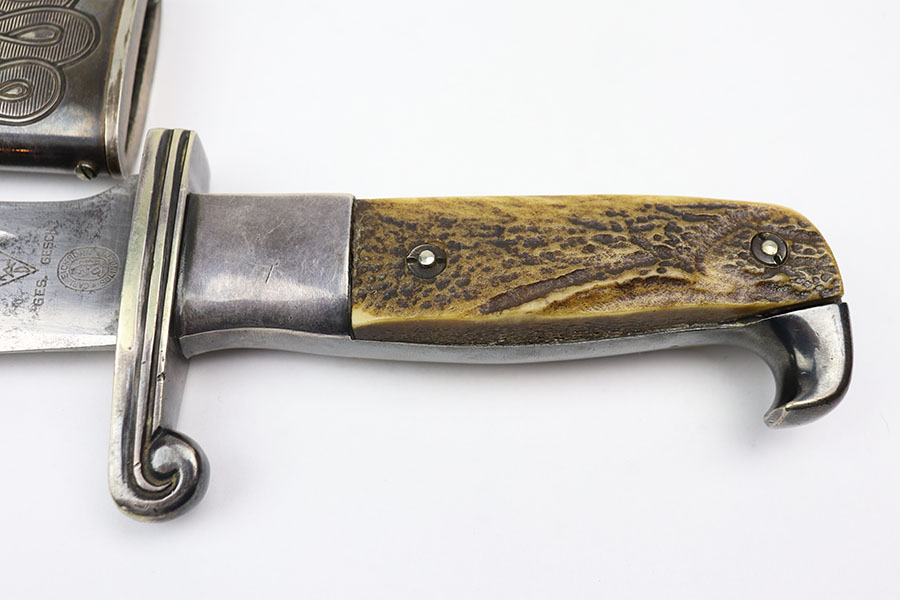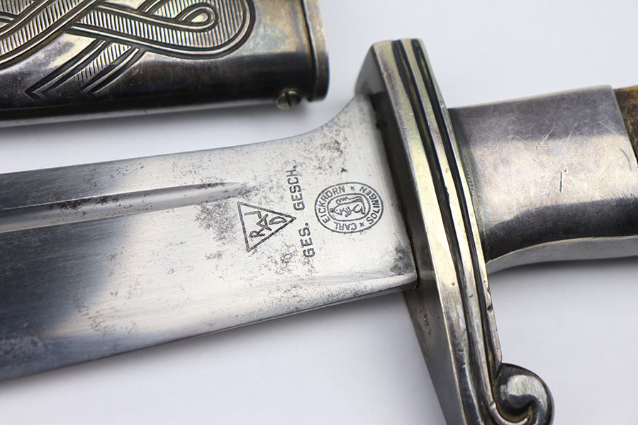 4/2/21 – This is an early variation RAD Hewer with a stag handle, scabbard, and early style leather hanger. The blade is maker stamped by Eickhorn, with the early style double oval squirrel logo. The blade has some light oxidation and surface patina but no deep wear or issues. No signs of sharpening. The handles have no cracks or chips. The scabbard has some light surface wear but overall is in excellent condition. The leather hanger is very hard to find, and also in great overall condition with no stamps or markings.