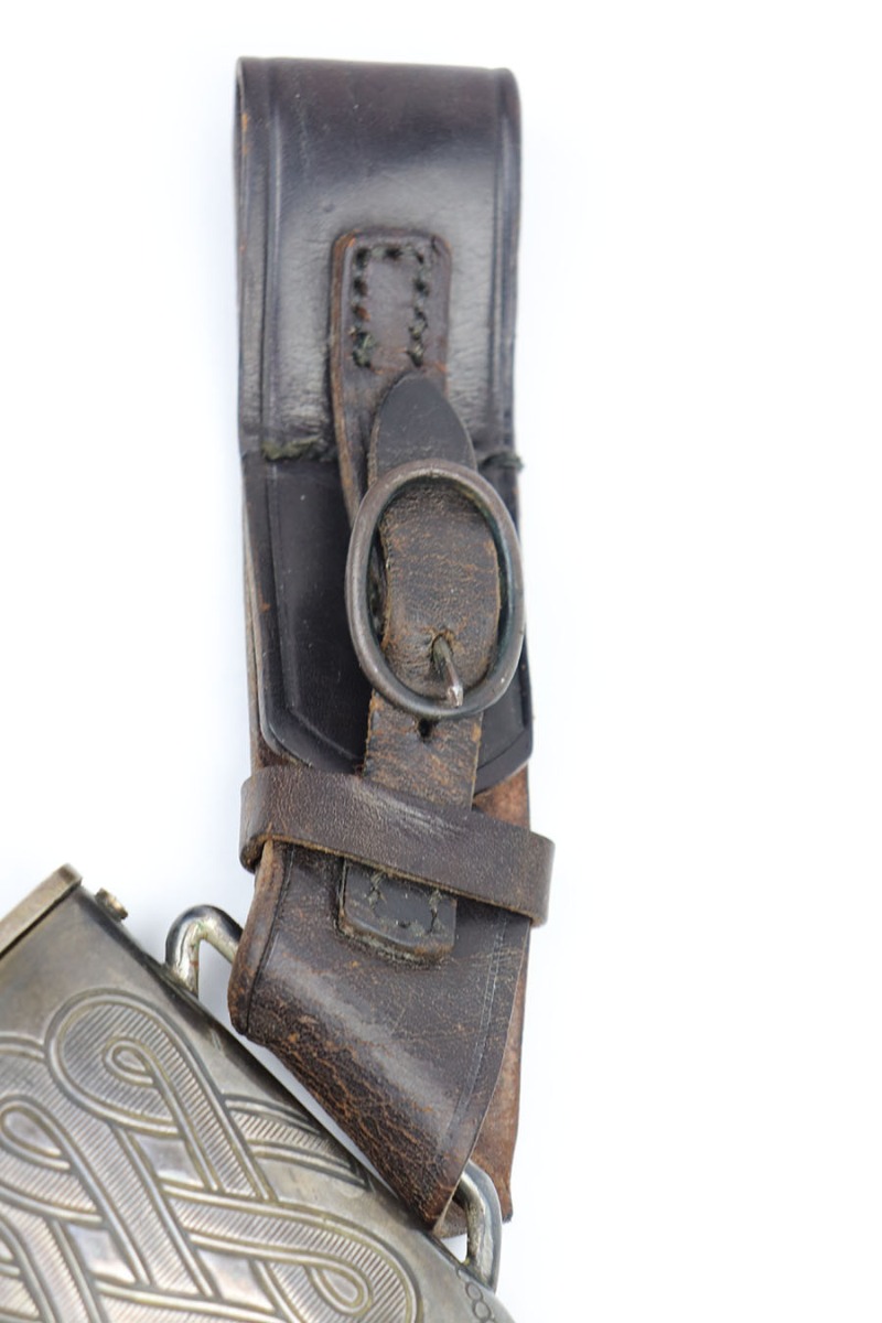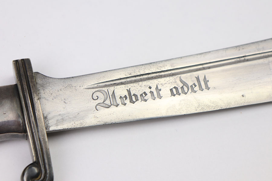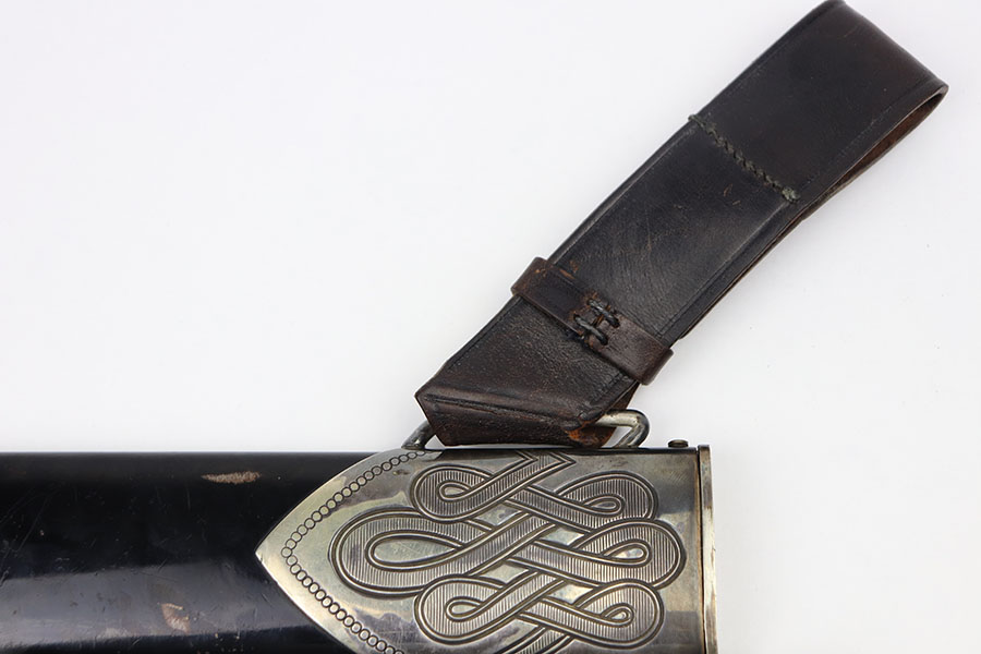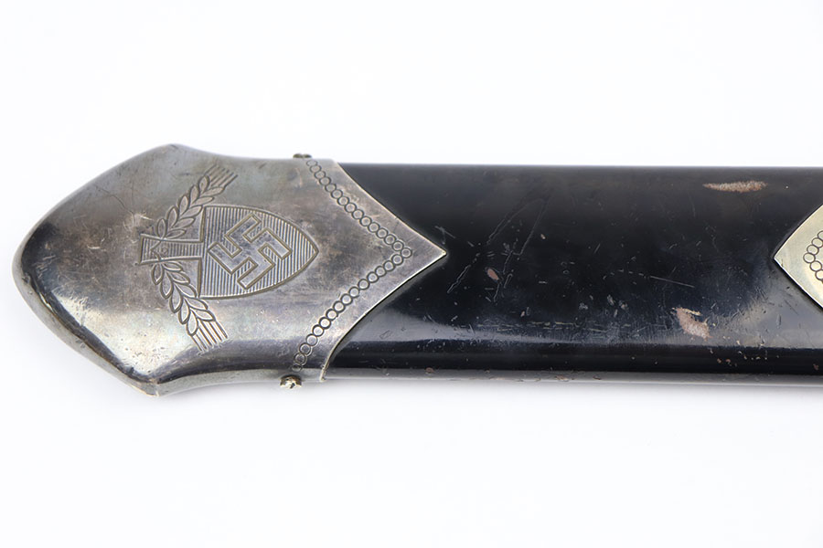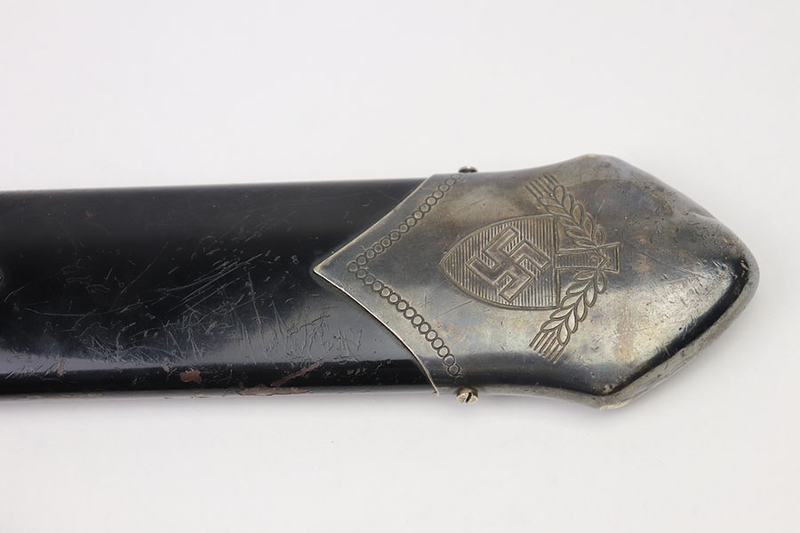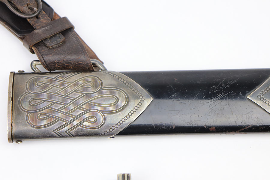4/2/21 – This is an early variation RAD Hewer with a stag handle, scabbard, and early style leather hanger. The blade is maker stamped by Eickhorn, with the early style double oval squirrel logo. The blade has some light oxidation and surface patina but no deep wear or issues. No signs of sharpening. The handles have no cracks or chips. The scabbard has some light surface wear but overall is in excellent condition. The leather hanger is very hard to find, and also in great overall condition with no stamps or markings.