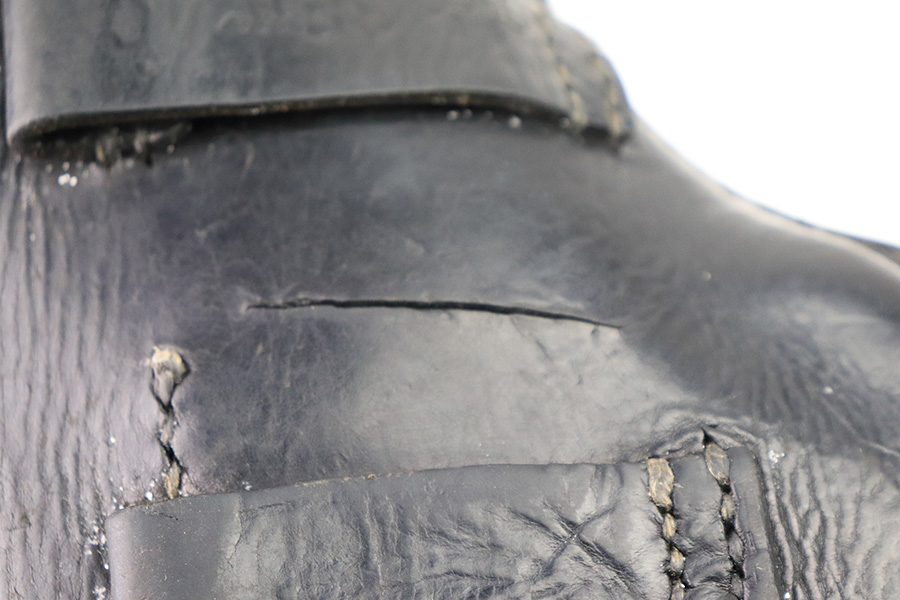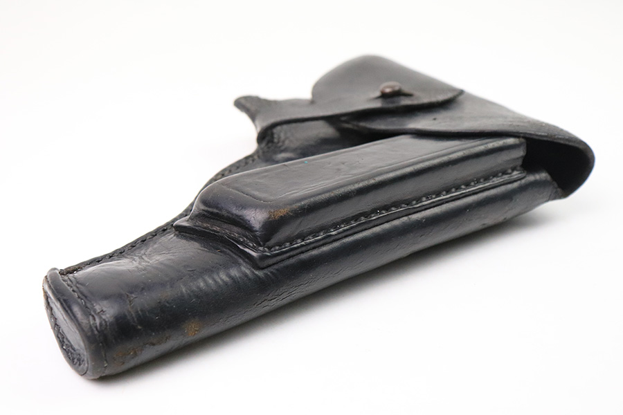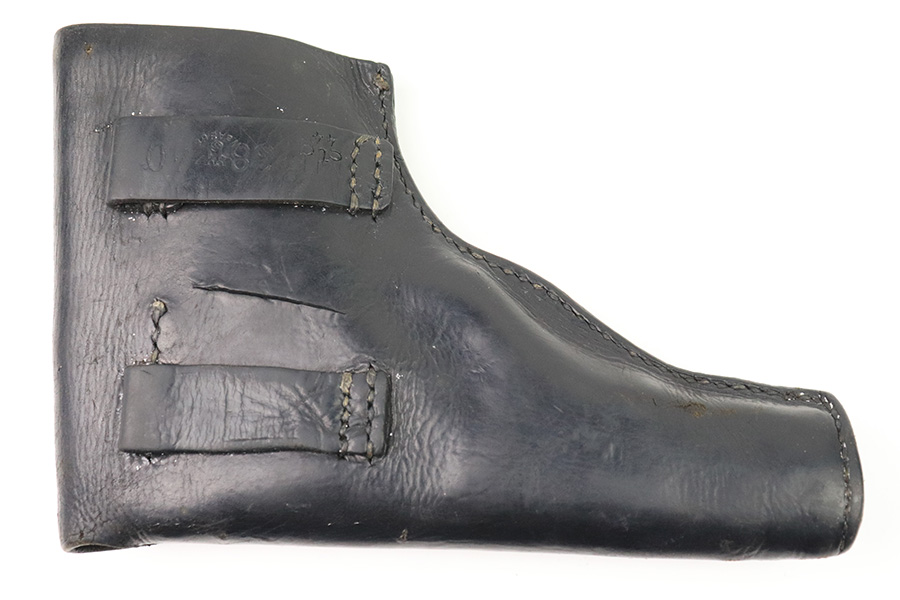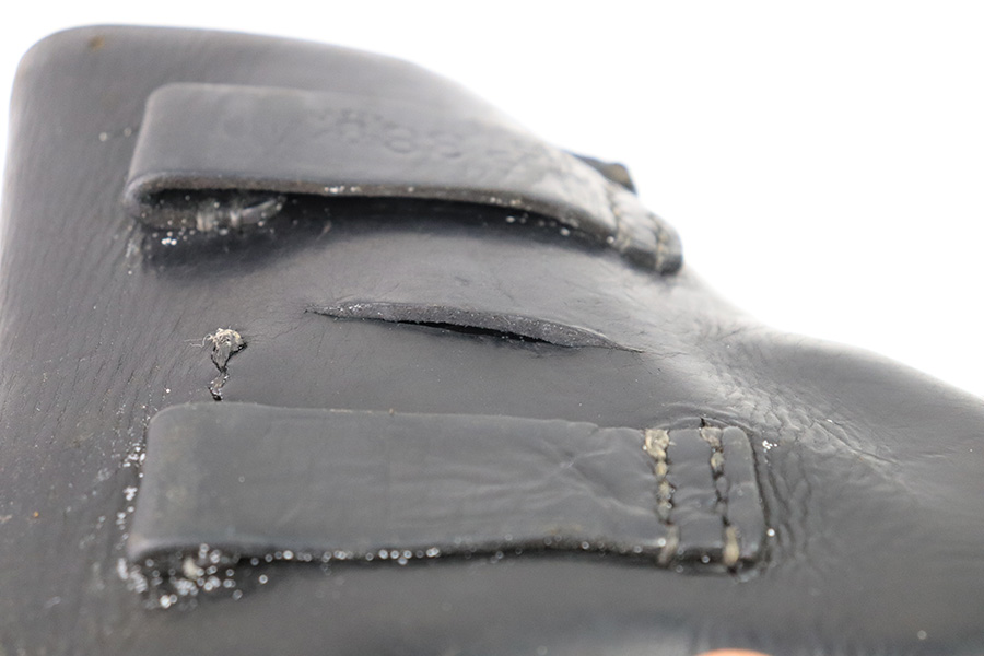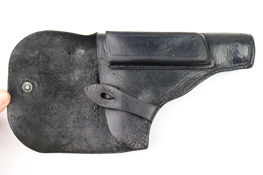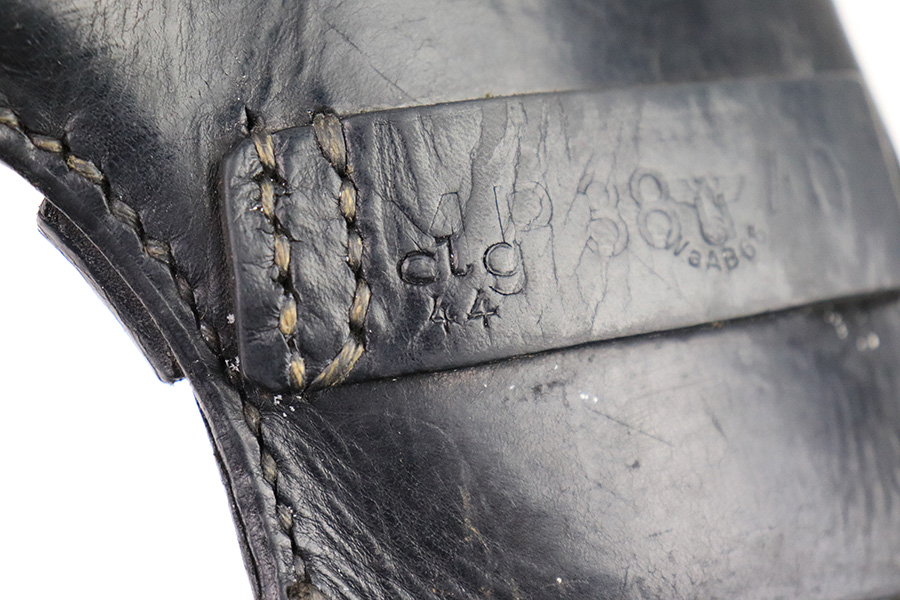 12/21/22 – This is an original WW2 production Radom holster with some added (fake) stamps. The holster is stamped on the back leather with multiple incorrect stamps. First is a “clg 44” stamp. Second is a M.P. 38 u. 40 stamp. Third is a waffen WaAB66 proof stamp. These are all incorrect added stamps. The back leather also shows a 1.5 inch long cut in the leather. The rest of the holster appears to be all original and correct. The leather is soft and pliable with normal wear and all stitching appears original.