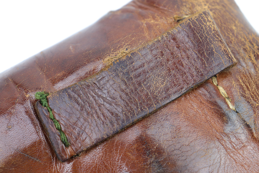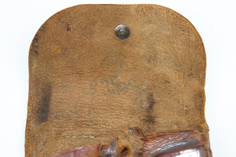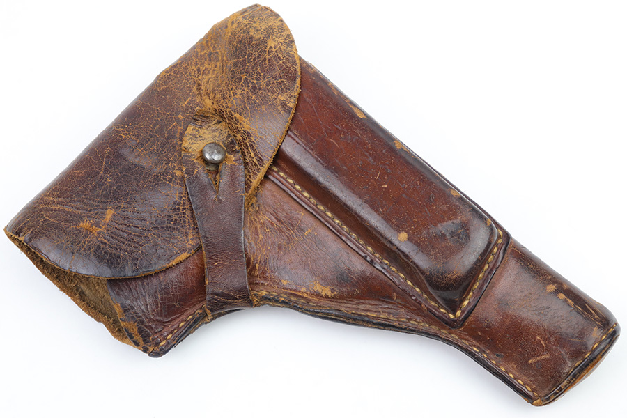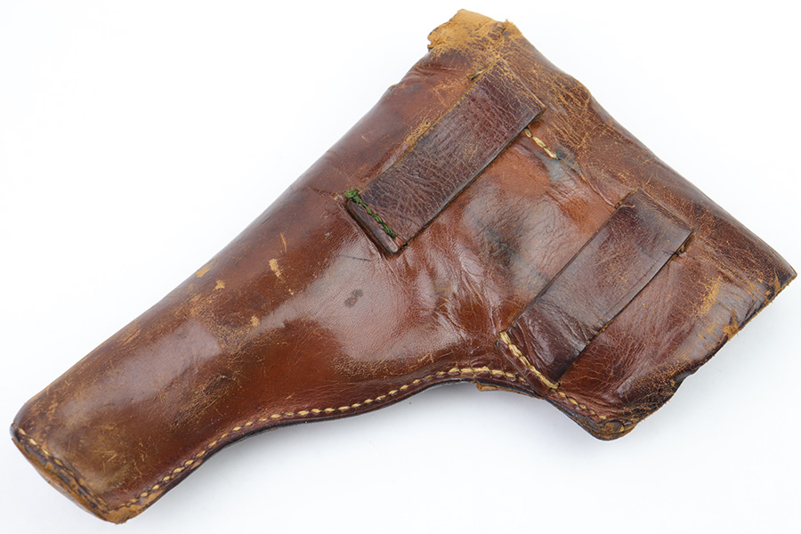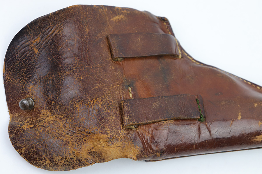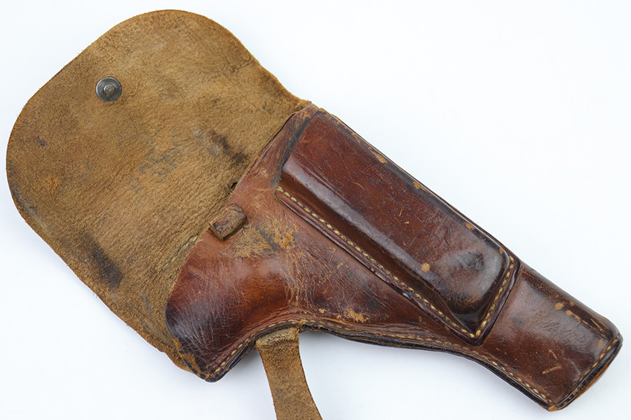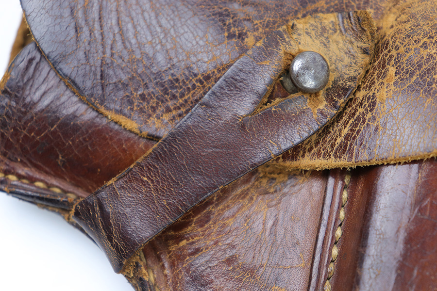 6/30/23 – This is an original WW2 production Radom model P.35 pistol holster. The holster is fairly worn throughout with soft and pliable leather from use and age. The exterior has wrinkling and surface scuffing as shown. The top leather has a small cut in the leather where the magazine pouch meets the top leather. The interior leather shows a faint P.35 ink stamp. There’s likely a waffen ink stamp on the interior leather as well but it’s no longer visible. The stitching is in great shape and all original except for the bottom of the left belt loop, which has replacement stitching.