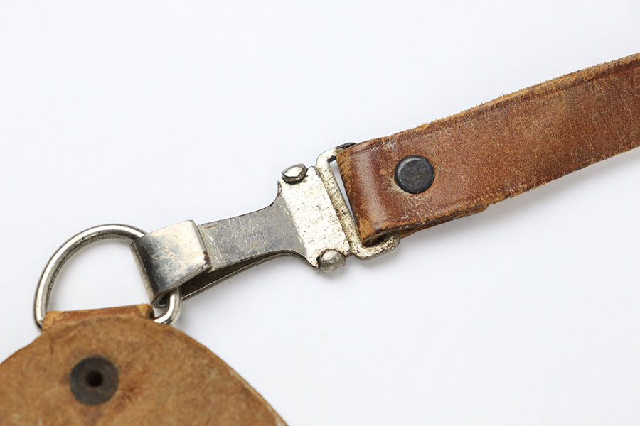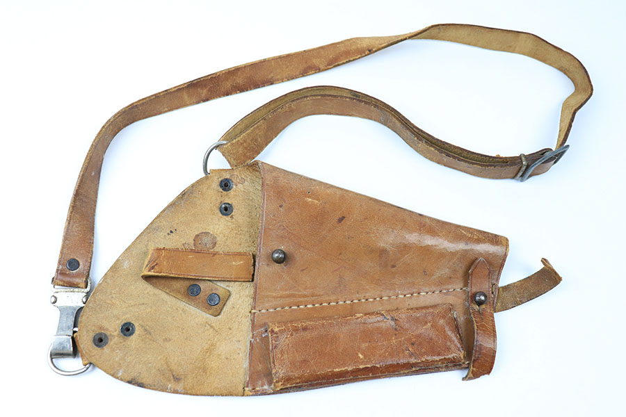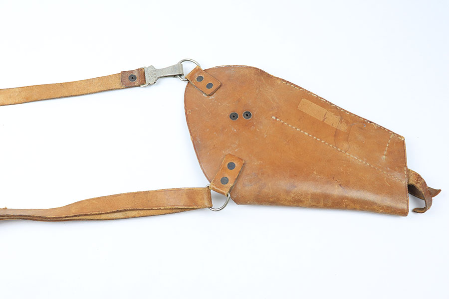 10/4/21 – This is an original WW2 era shoulder holster for a Radom P.35 pistol. The holster is not marked on the leather, but the clip for the shoulder strap is Assmann RZM maker stamped. The holster fits a Radom very nicely. The leather toe strap and closure strap are broken, as shown in photos. The remaining leather is in great condition. There are no stitching issues.