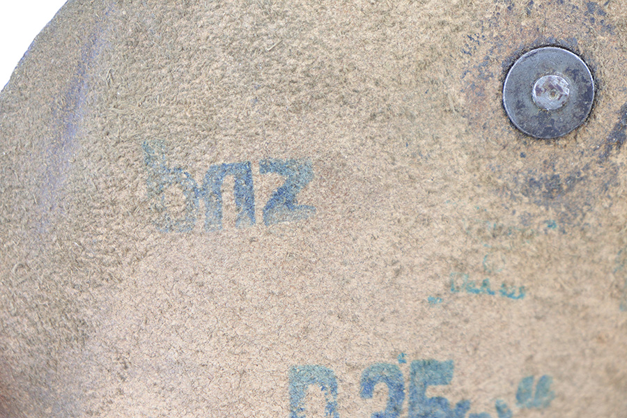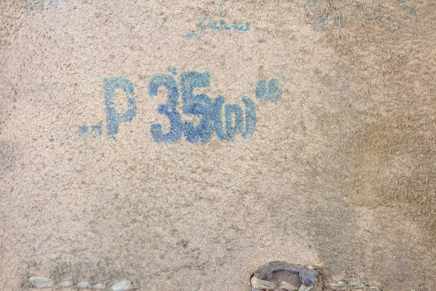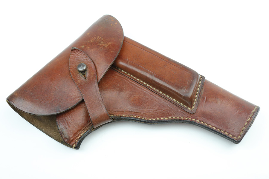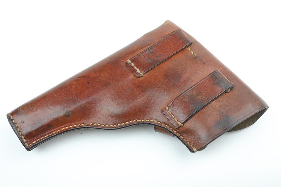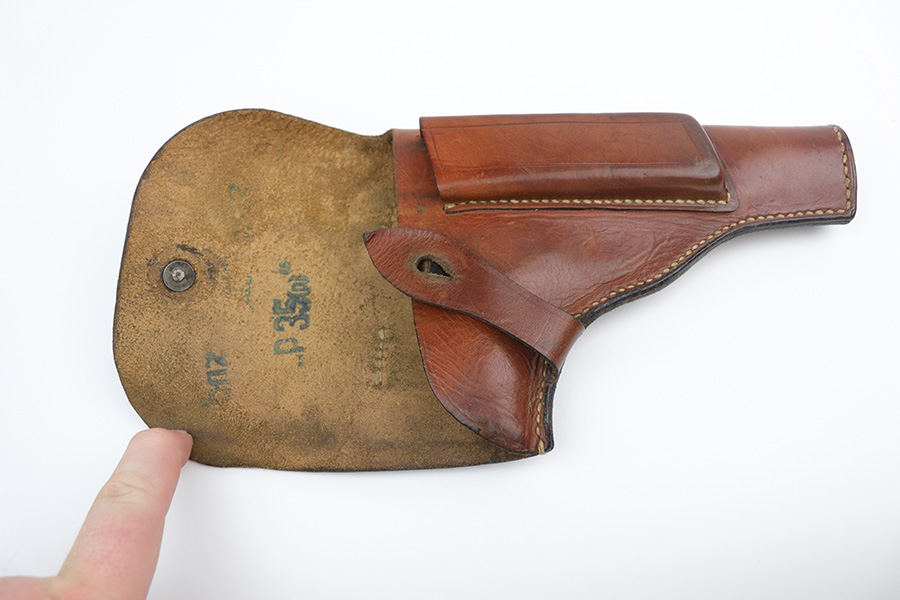 8/30/21 – This is an excellent example of a late-WW2 leather holster for a Radom VIS 35. It was manufactured around 1944. There is an ink stamp on the inside that reads “P.35”. There is also a “BNZ” Steyr makers mark and faint Nazi waffen proof. Overall, it is in excellent condition. The leather is soft and workable. The stitching is all intact. There are scuffs here and there, most noticeable on the top flap. Minor bruising in the leather throughout and some dark stains on the back.