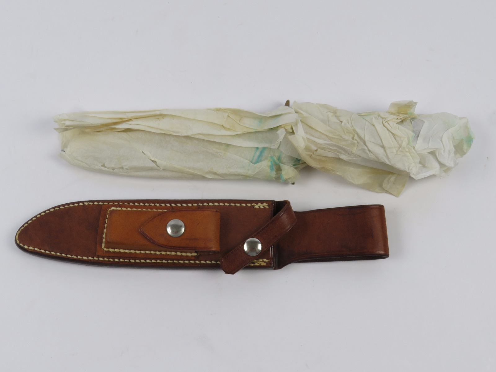 6/21/17 – This is an original Randall made model 1 (#1) blade – complete with the original sharpening stone and scabbard. The blade is 7inches, and the iconic “All-Purpose” fighting knife. These knives were widely used and revered during WW2 as soldiers used them and carried them. The blade is properly stamped, and is in nearly perfect condition except for a minor speckle or two of wear. The scabbard is minty. The original paper packaging is included as well – as shown in photos.