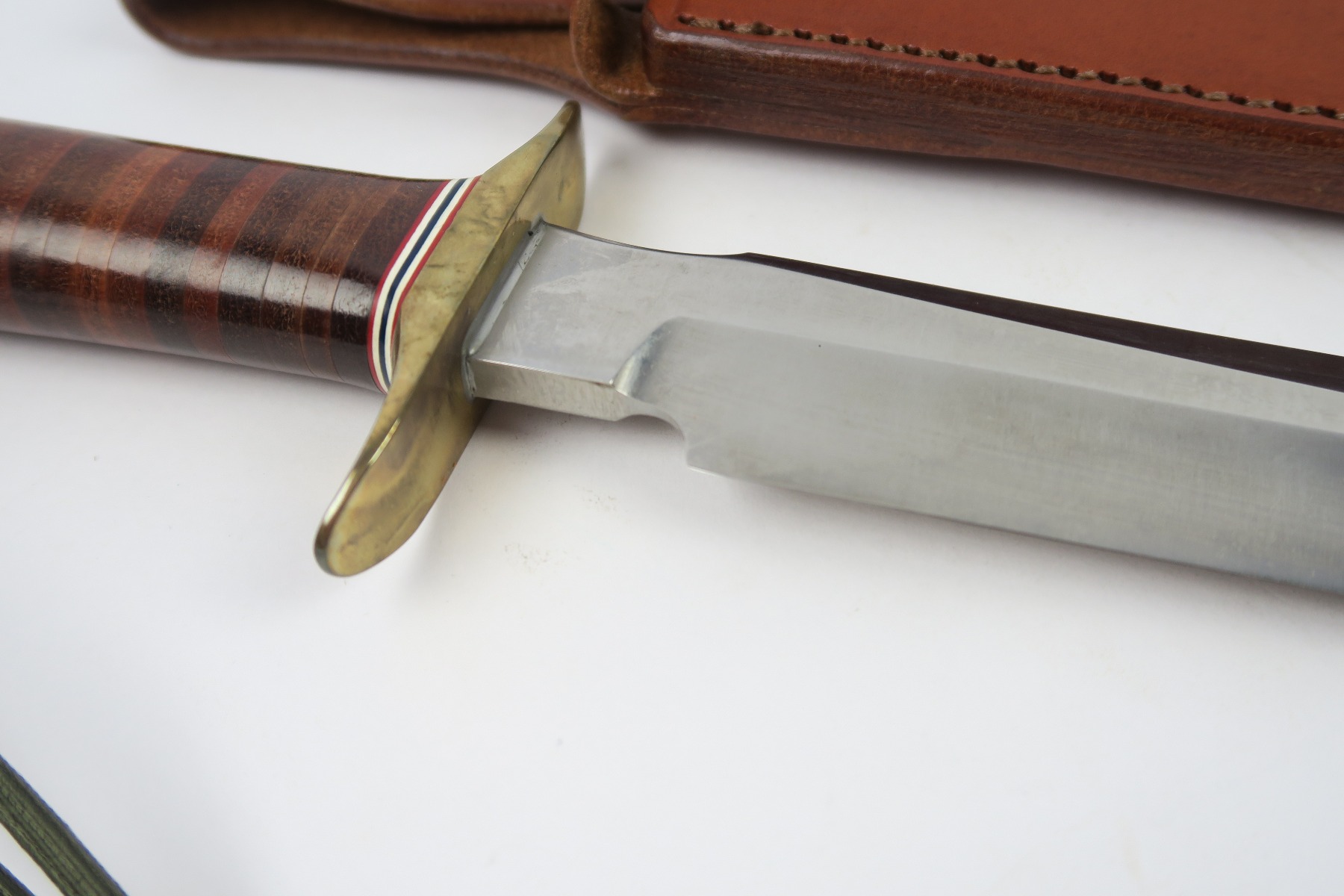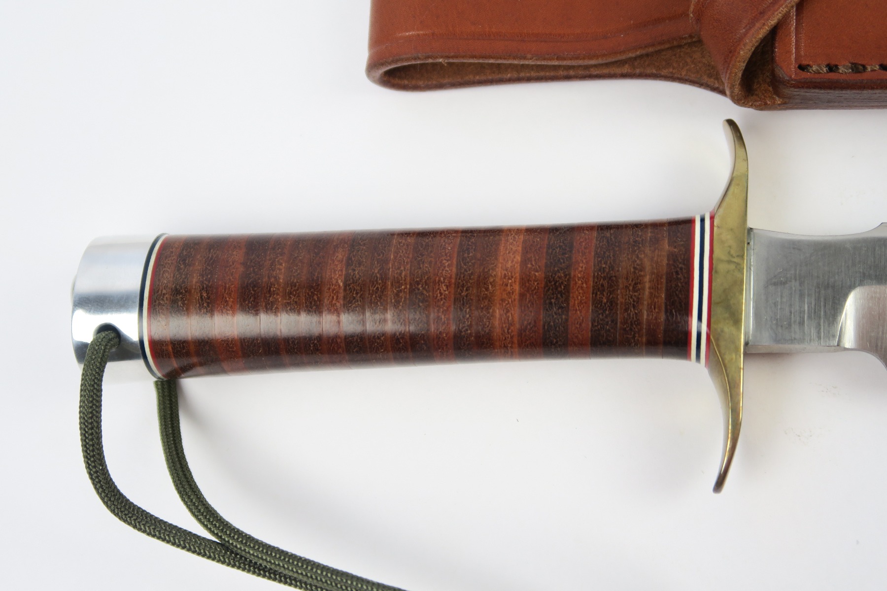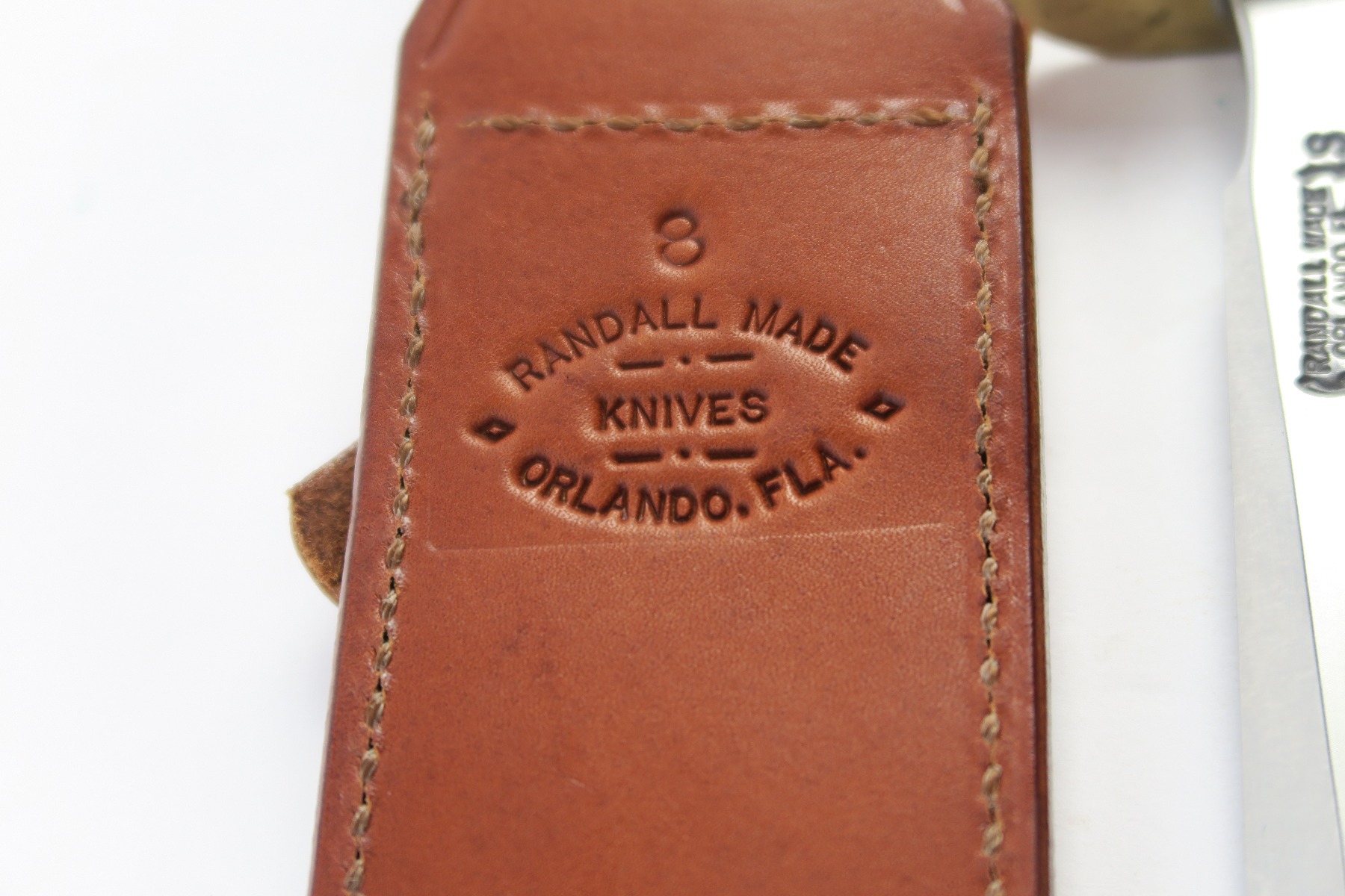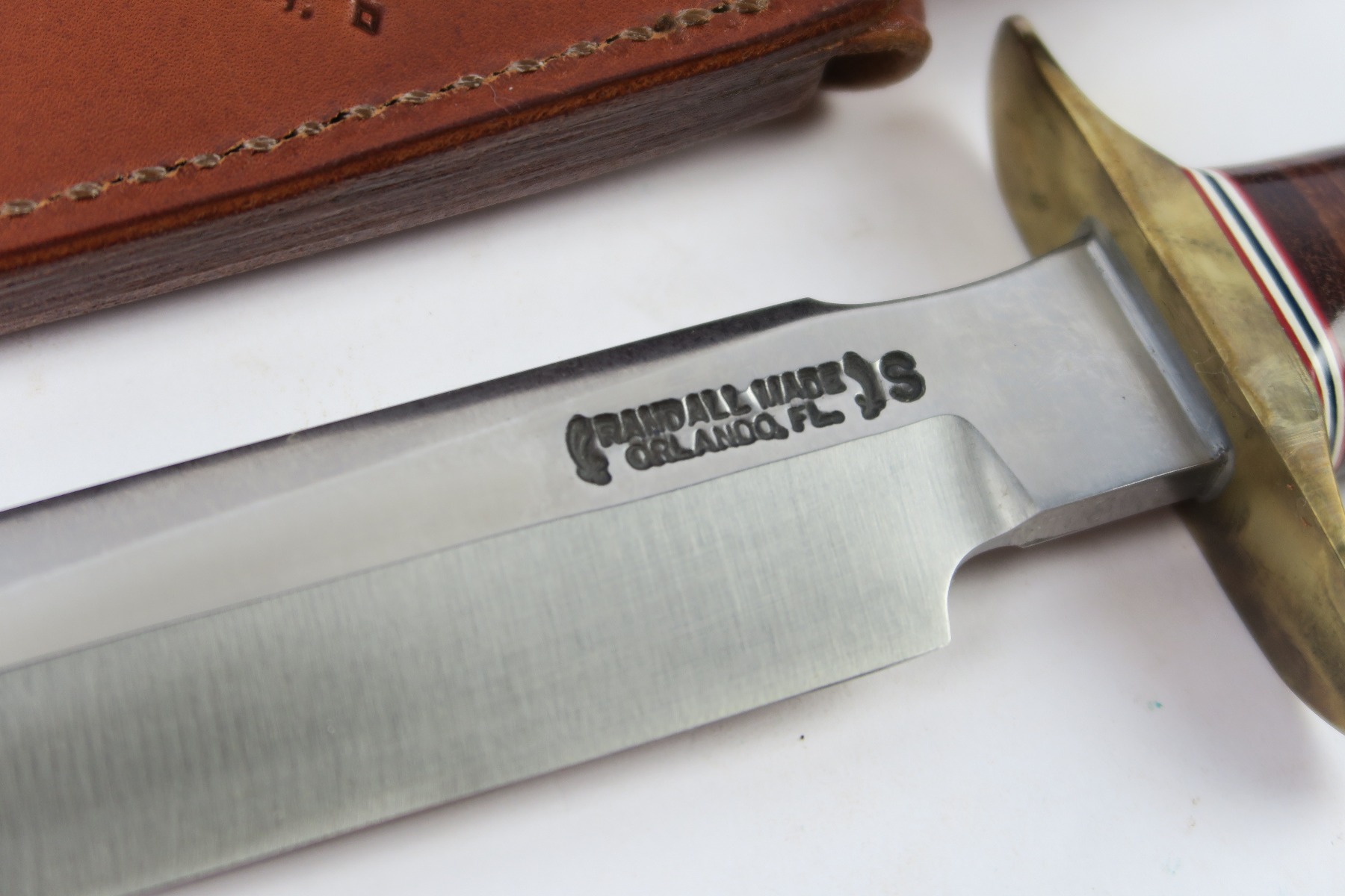 2/13/18 – This is an original Randall #1 knife with a 7 inch blade. The #1 with 7 inch blade is fairly rare, and this particular knife has a beautiful leather handle with red, white, and blue spacers. The handle has 3 different shades of brown leather which is in minty condition. The blade is also minty. Comes with the original scabbard which is equally as nice as the knife. The blade has been carefully sheathed but never used. The overall knife length is 13 inches. Length in scabbard is about 13.5 inches.