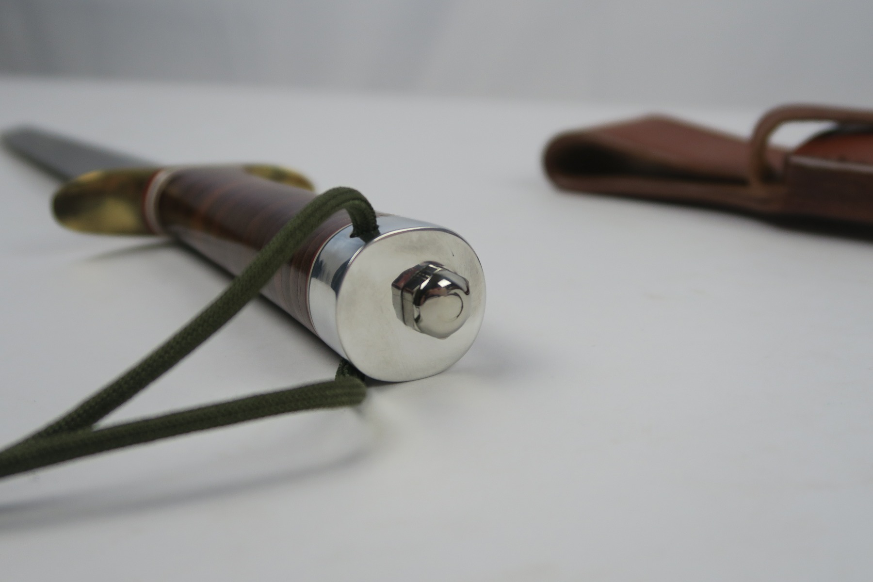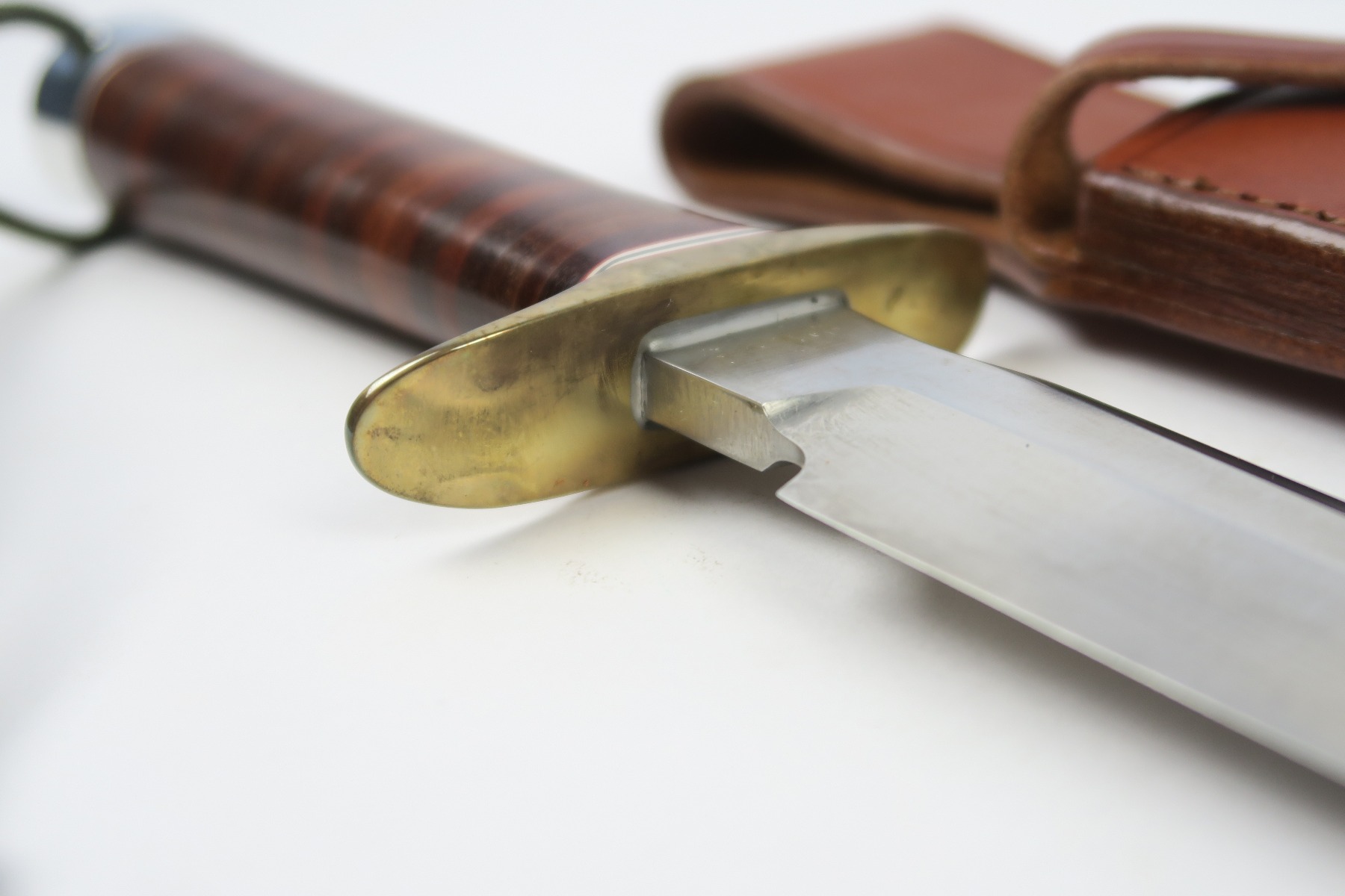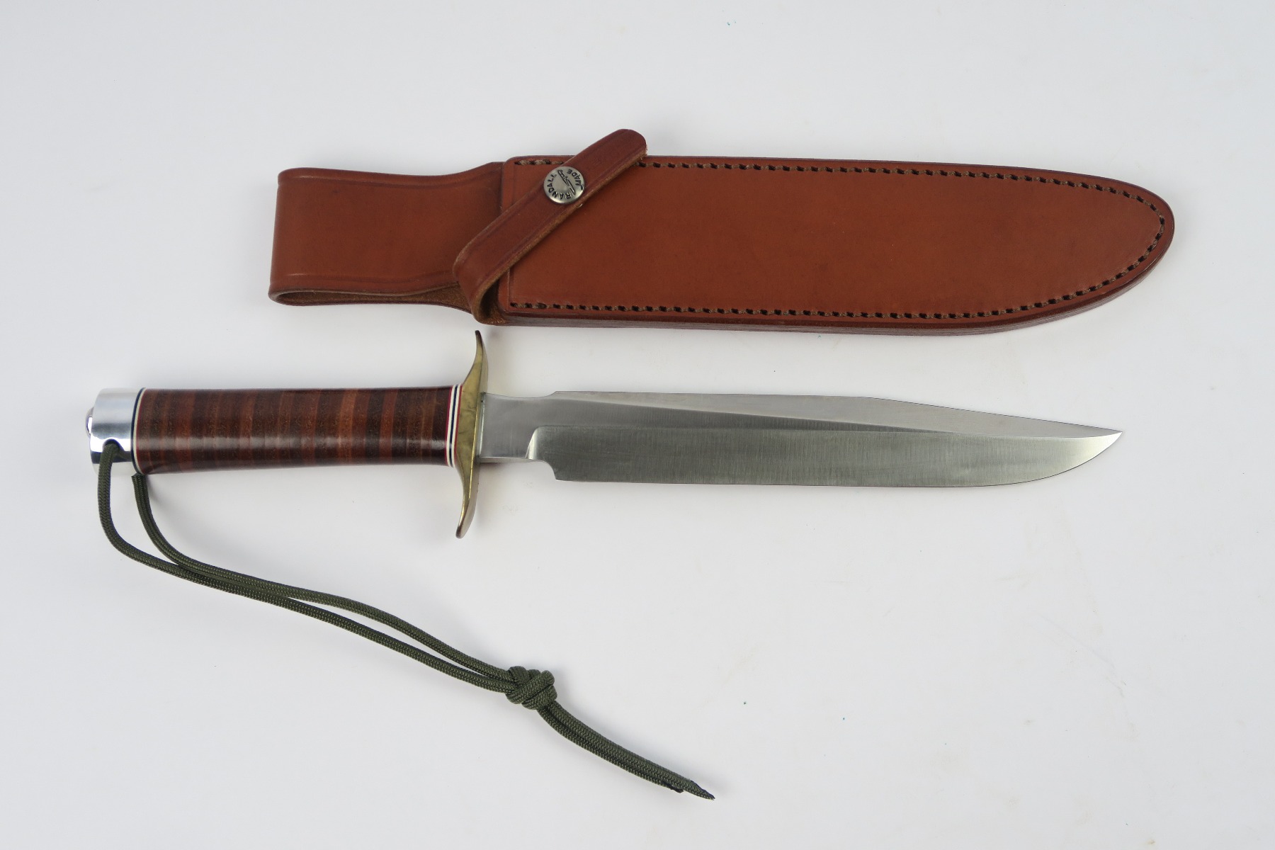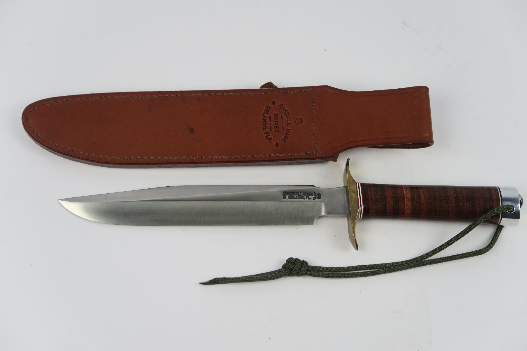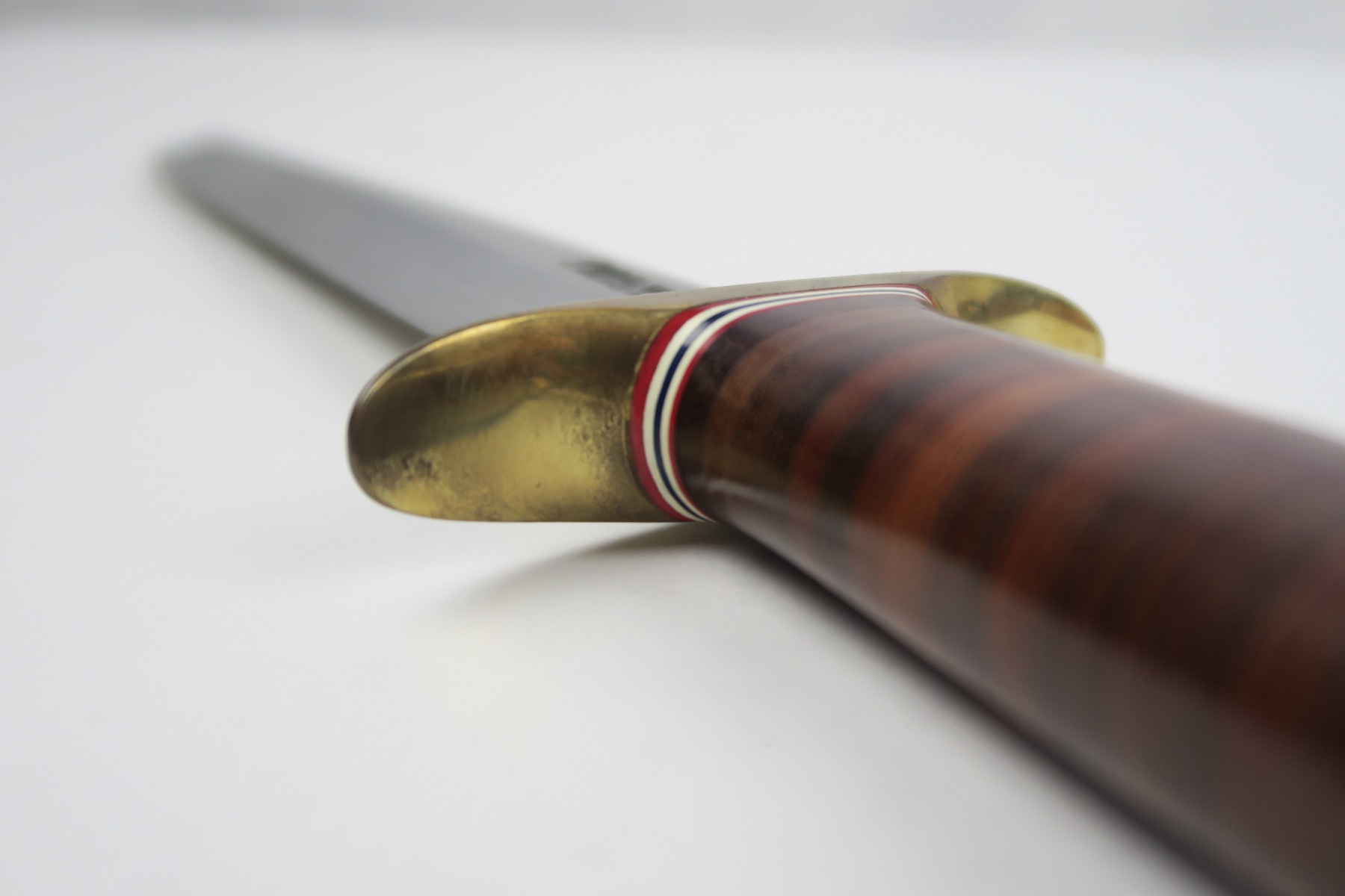 2/13/18 – This is an original Randall #1 knife with a 7 inch blade. The #1 with 7 inch blade is fairly rare, and this particular knife has a beautiful leather handle with red, white, and blue spacers. The handle has 3 different shades of brown leather which is in minty condition. The blade is also minty. Comes with the original scabbard which is equally as nice as the knife. The blade has been carefully sheathed but never used. The overall knife length is 13 inches. Length in scabbard is about 13.5 inches.