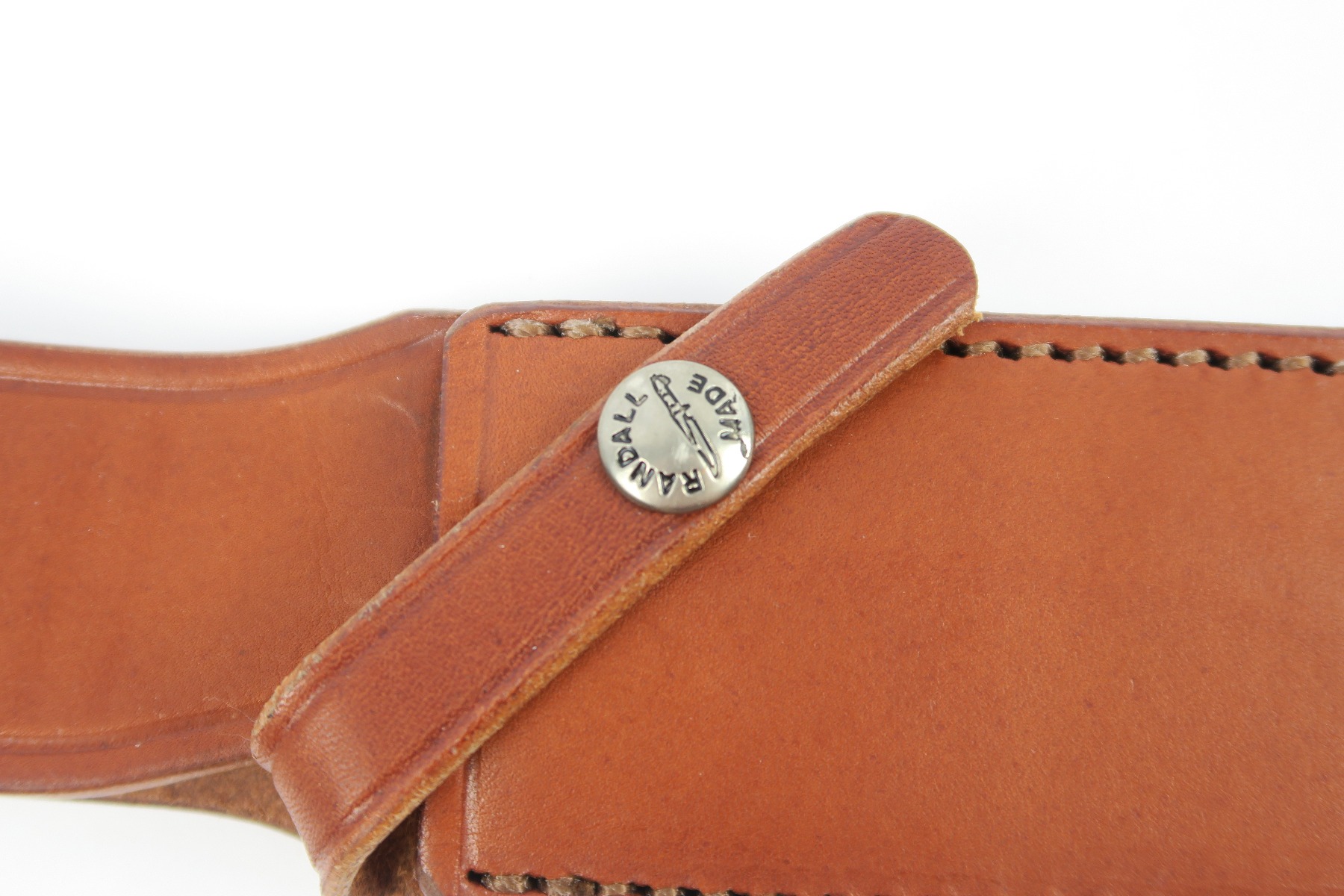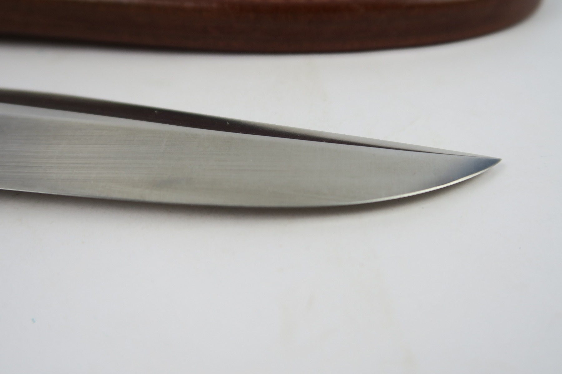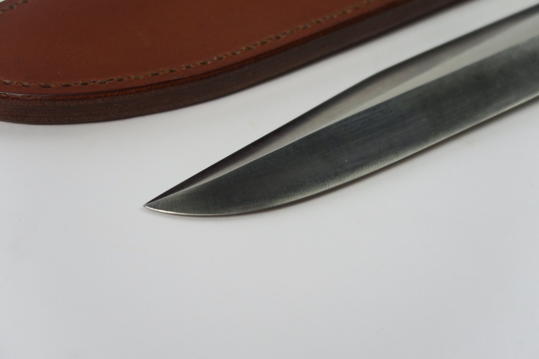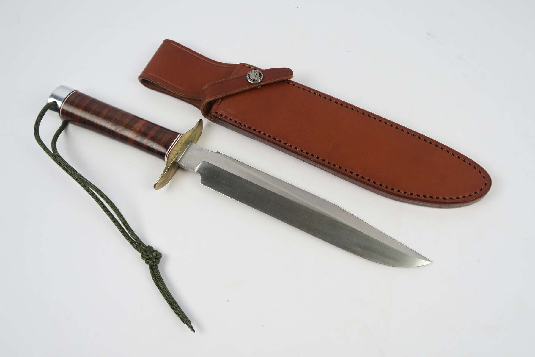 2/13/18 – This is an original Randall #1 knife with a 7 inch blade. The #1 with 7 inch blade is fairly rare, and this particular knife has a beautiful leather handle with red, white, and blue spacers. The handle has 3 different shades of brown leather which is in minty condition. The blade is also minty. Comes with the original scabbard which is equally as nice as the knife. The blade has been carefully sheathed but never used. The overall knife length is 13 inches. Length in scabbard is about 13.5 inches.