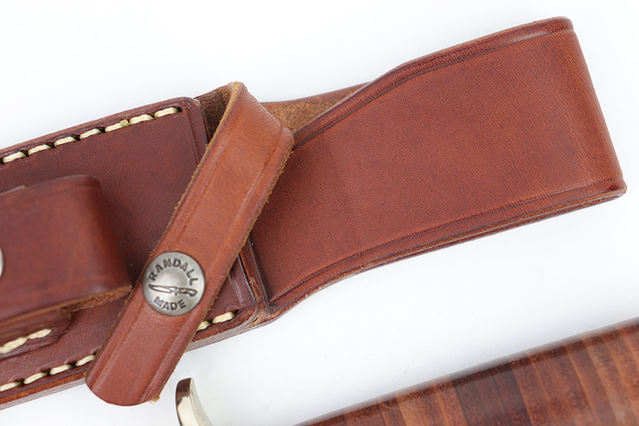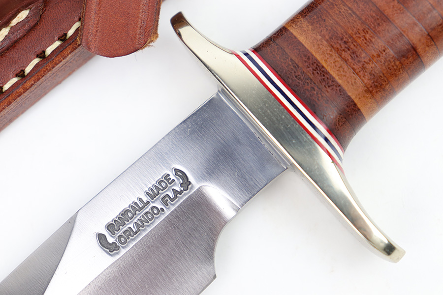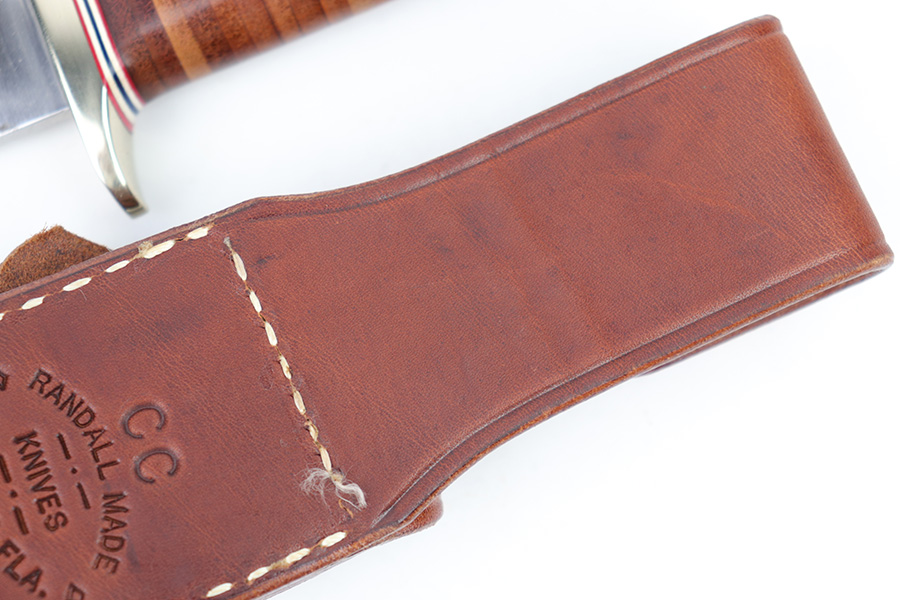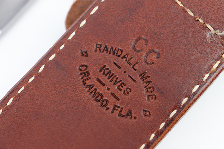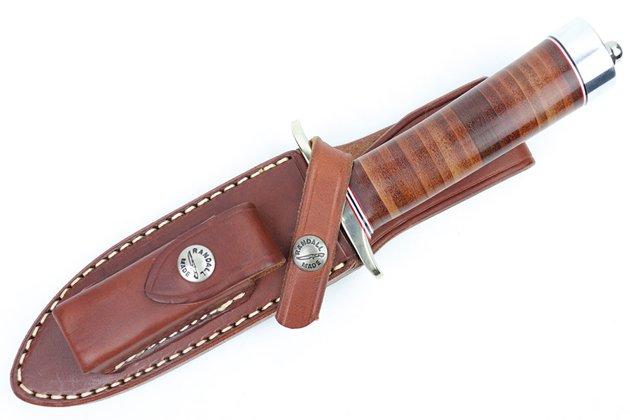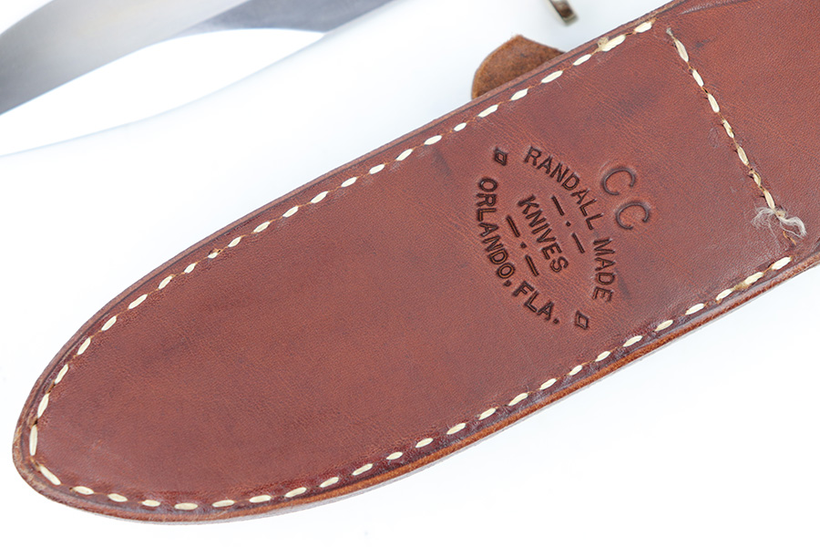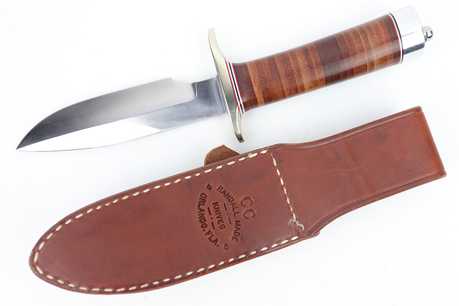 3/6/23 – This is a minty condition Randall model 5 Combat Companion knife. This is a non-catalog model as evidenced by the “CC” on the back of the scabbard and the absence of the thumb notching on the spine of the blade. The knife has a 5 inch blade. Never used by the previous owner. There is one small spot of surface wear near the spine of the blade, but otherwise like-new condition. Nickel crossguard and pommel and an excellent, tight leather handle. Comes with an original leather sheath and sharpening stone – both by Randall and in minty condition.