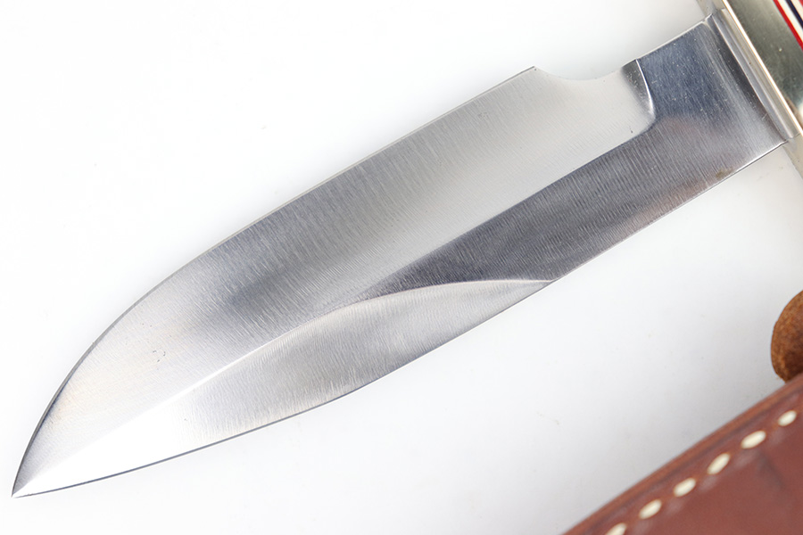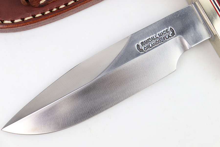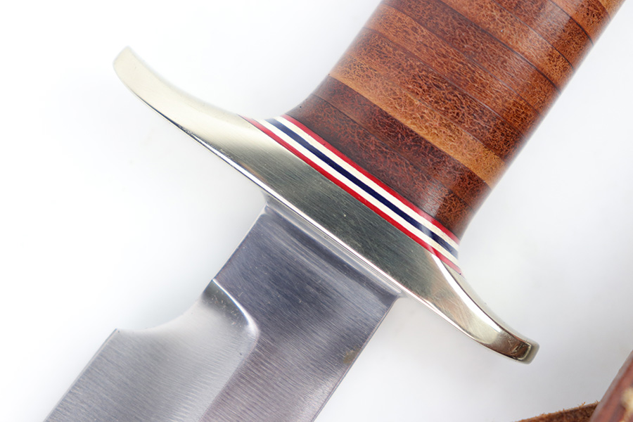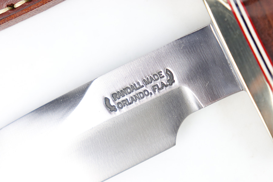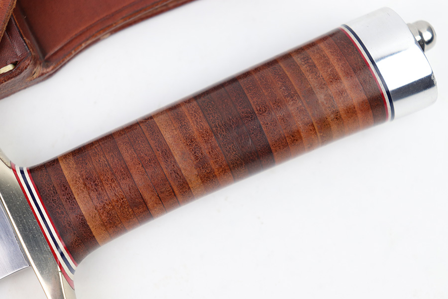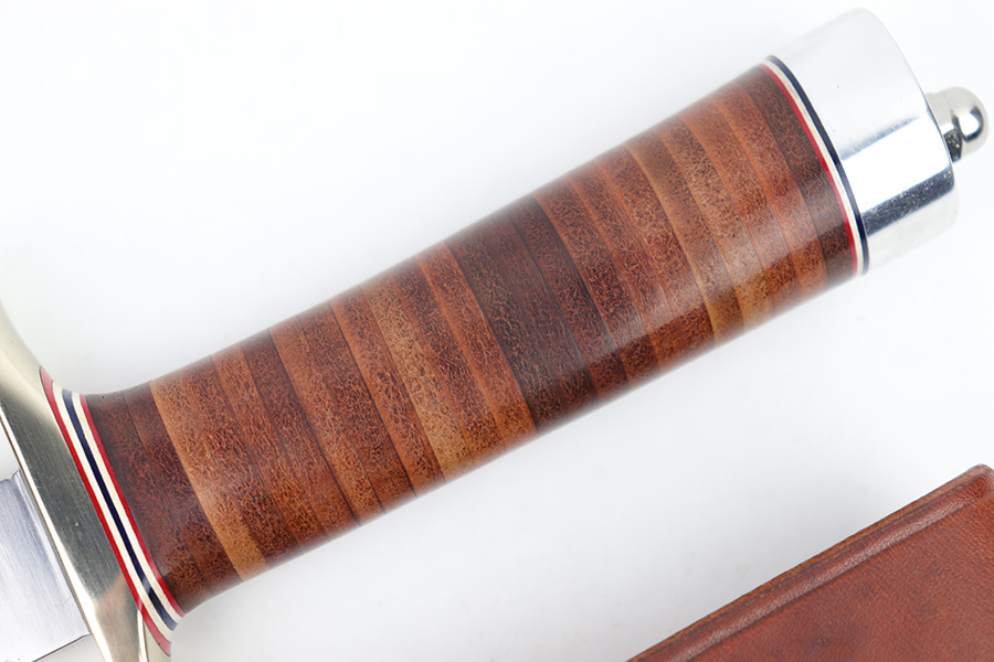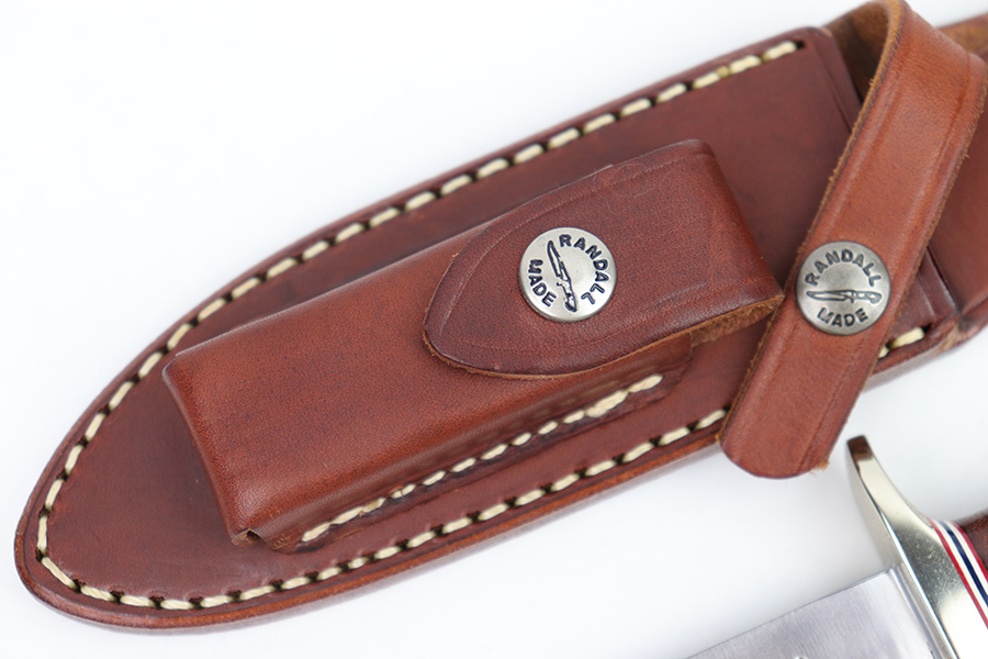 3/6/23 – This is a minty condition Randall model 5 Combat Companion knife. This is a non-catalog model as evidenced by the “CC” on the back of the scabbard and the absence of the thumb notching on the spine of the blade. The knife has a 5 inch blade. Never used by the previous owner. There is one small spot of surface wear near the spine of the blade, but otherwise like-new condition. Nickel crossguard and pommel and an excellent, tight leather handle. Comes with an original leather sheath and sharpening stone – both by Randall and in minty condition.