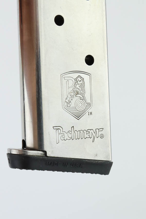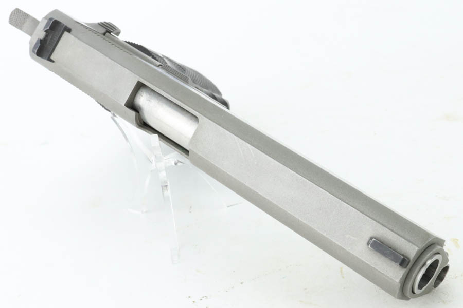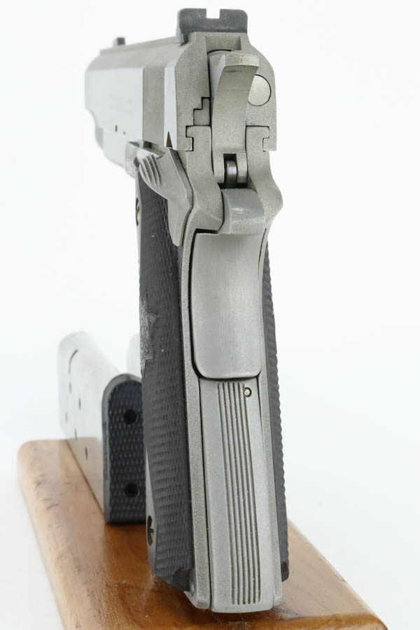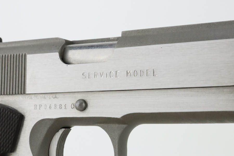 7/1/24 – This is an excellent Randall Service Model 1911, chambered in .45 ACP. It has a stainless finish with just some tiny scratches here and there and some minor black staining on the underside of the frame. Fitted with a Bianchi Gunleather grip and comes with two magazines. Excellent bore with great rifling.