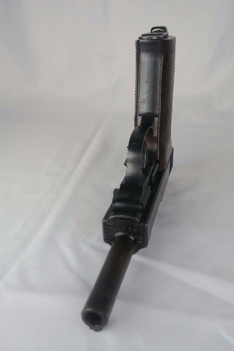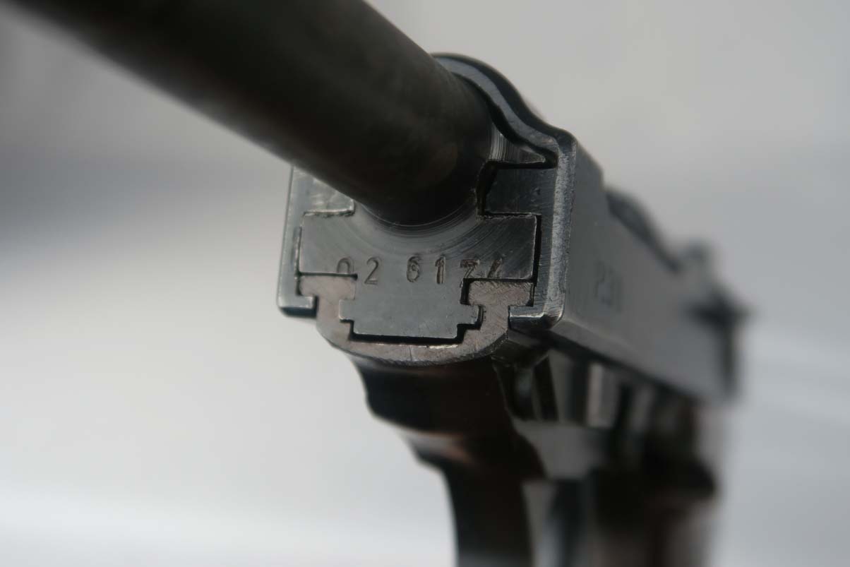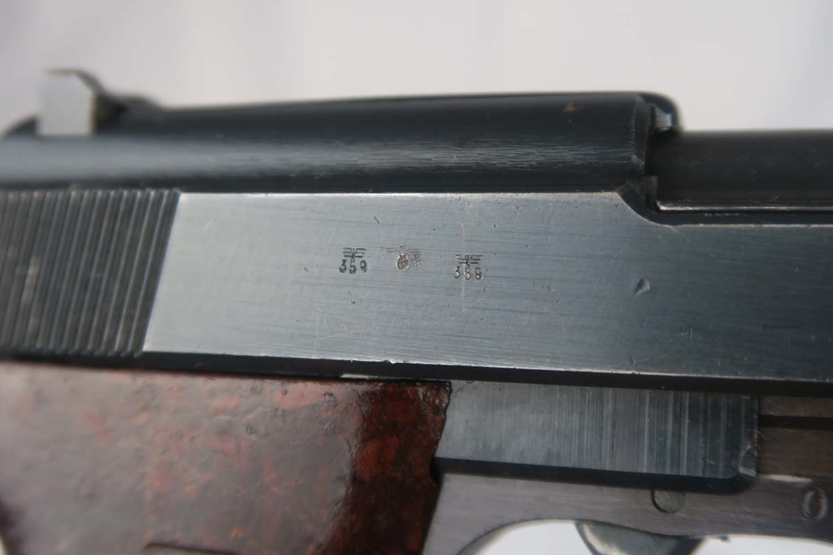 5/4/17 – This is a rare Walther P.38 variation – an 0-prefix with no serial on the slide or left side of the frame. These were one of the last variations produced by Walther for WWII. The finish rates at about 92-94%, with an excellent slide and frame, but wear/browning throughout on the barrel. It is all matching, with serial on barrel and right side of frame. Beautiful reddish grips and E/359 mag. Excellent bore.