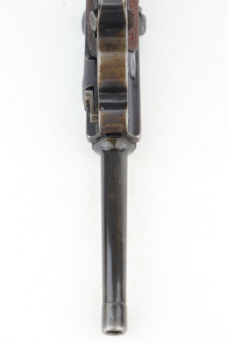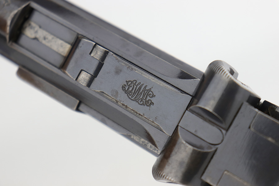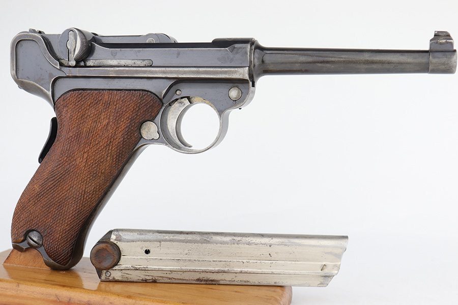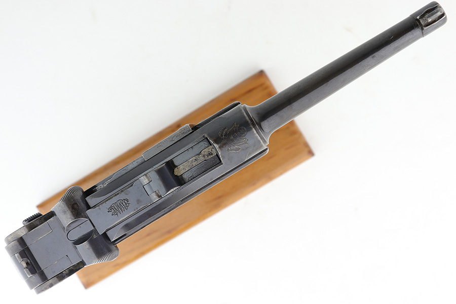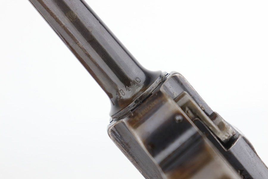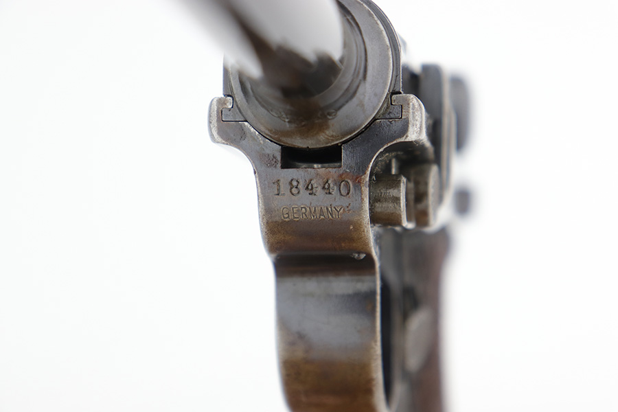 12/19/22 – This is a rare DWM model 1900 luger with American Eagle crest on the chamber. This is the first production model of this variation, made in or around 1900 with early dish toggle. These pistols went to the US retail market and the manufacturers at DWM realized that nation-based crests increased sales of these lugers, so that is why you find the American Eagle over the chamber. This is also why you see GERMANY marked on the frame, denoting these were exported for commercial sale. This one is all matching and has retained roughly half of its original finish with obvious spotty wear throughout, concentrated mostly on the left side of the frame, on the side rails, on the side plate, along the barrel, and on the grip straps. Fitted with wood grips – the right panel is numbered and matching, the left is mismatched. Also on the left side, there is a small chip in the upper corner and an area of obvious wear where it looks like someone tried to re-apply the checkering. Comes with a very faintly “Germany” marked magazine. The bore has decent rifling, but there is some frosting in the grooves.