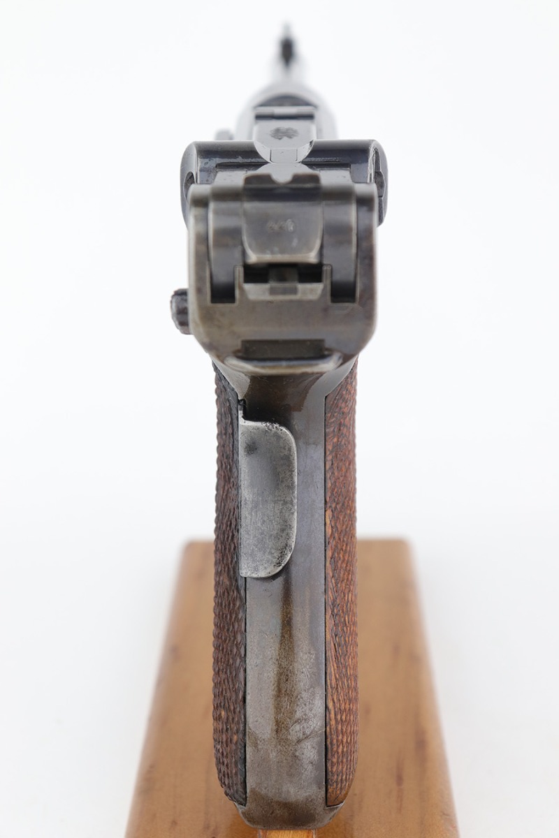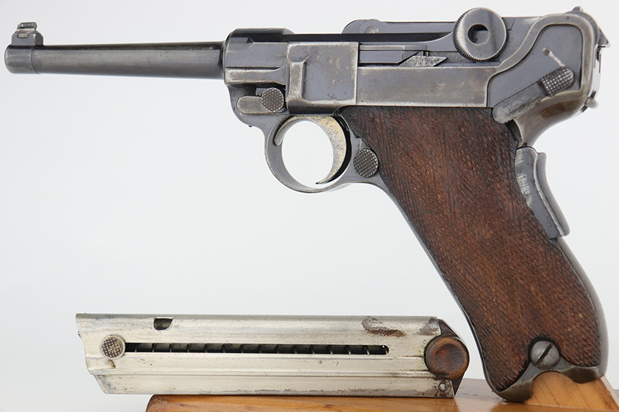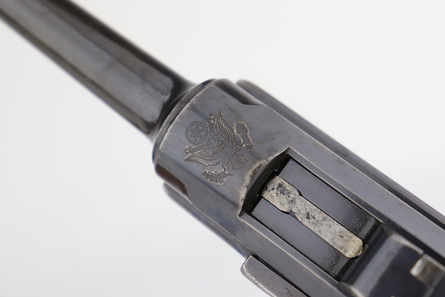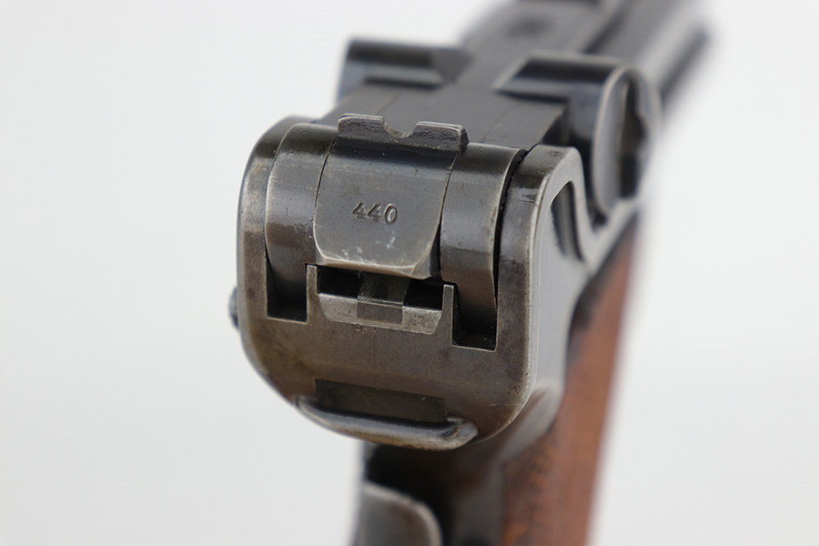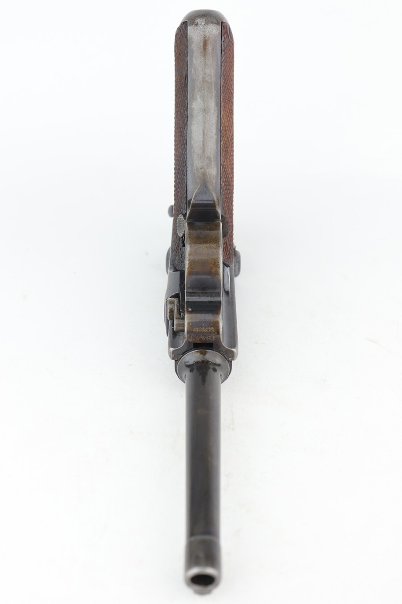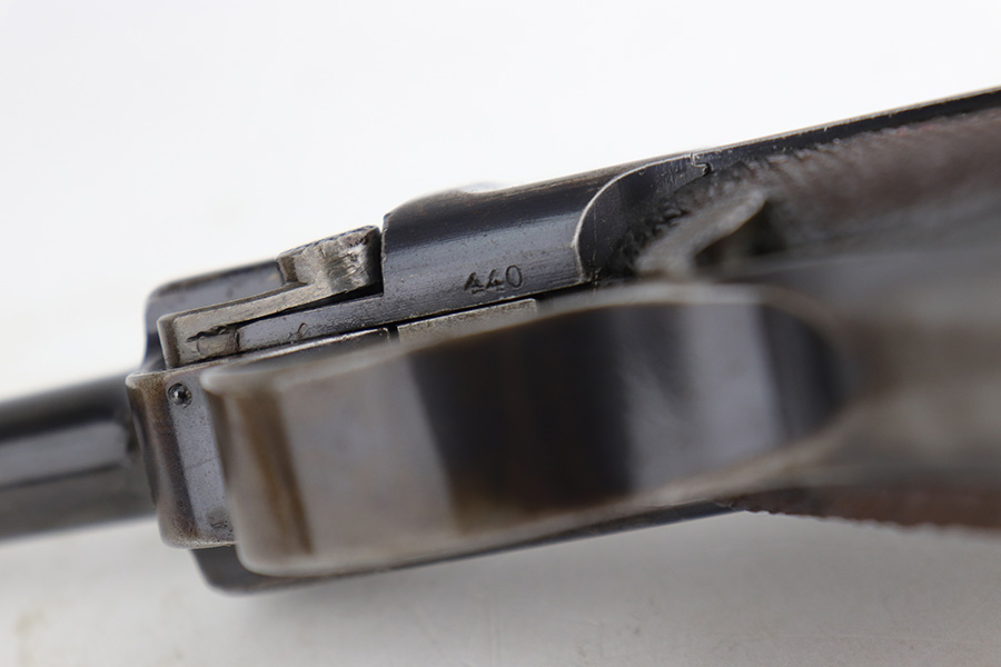 12/19/22 – This is a rare DWM model 1900 luger with American Eagle crest on the chamber. This is the first production model of this variation, made in or around 1900 with early dish toggle. These pistols went to the US retail market and the manufacturers at DWM realized that nation-based crests increased sales of these lugers, so that is why you find the American Eagle over the chamber. This is also why you see GERMANY marked on the frame, denoting these were exported for commercial sale. This one is all matching and has retained roughly half of its original finish with obvious spotty wear throughout, concentrated mostly on the left side of the frame, on the side rails, on the side plate, along the barrel, and on the grip straps. Fitted with wood grips – the right panel is numbered and matching, the left is mismatched. Also on the left side, there is a small chip in the upper corner and an area of obvious wear where it looks like someone tried to re-apply the checkering. Comes with a very faintly “Germany” marked magazine. The bore has decent rifling, but there is some frosting in the grooves.