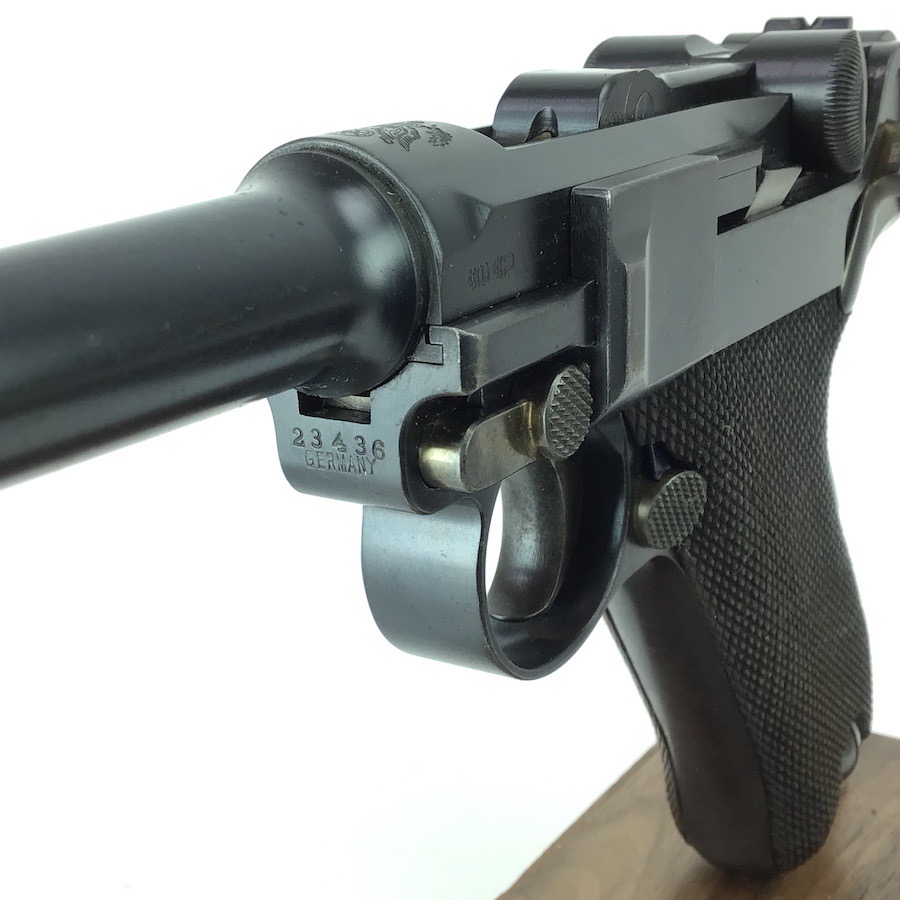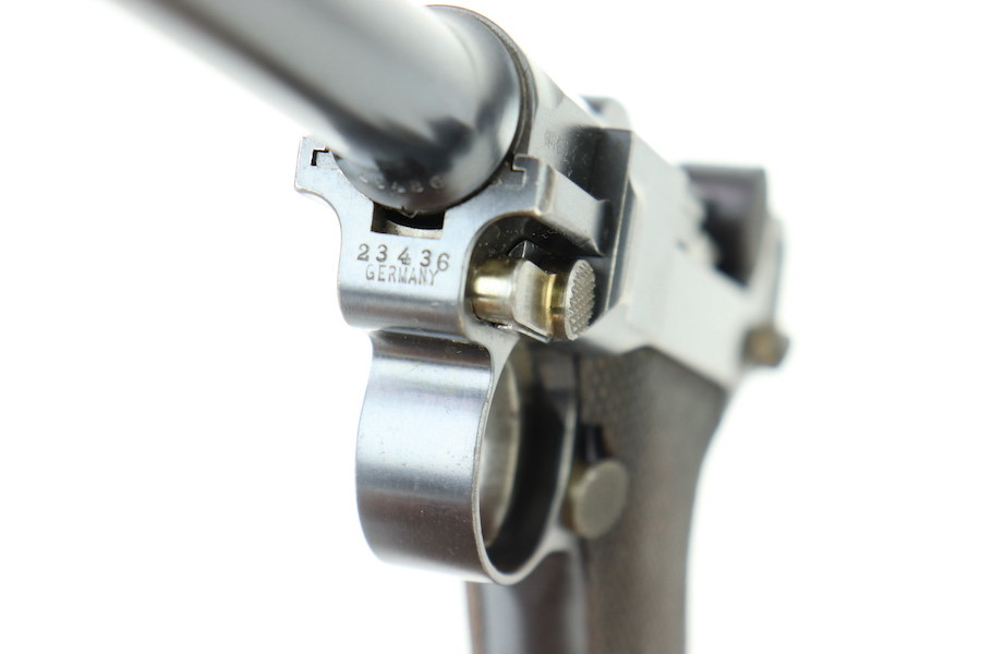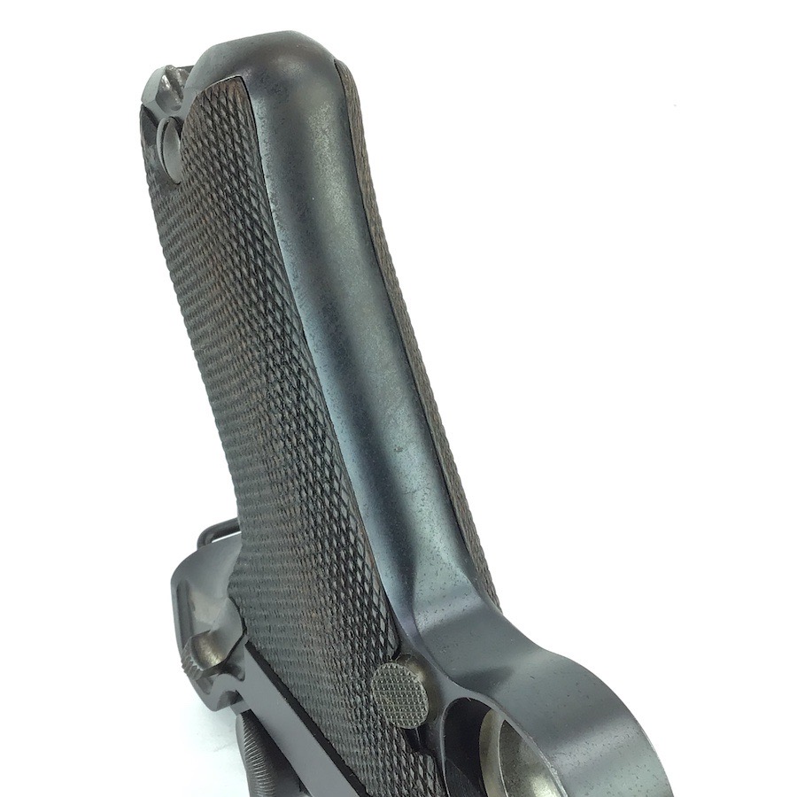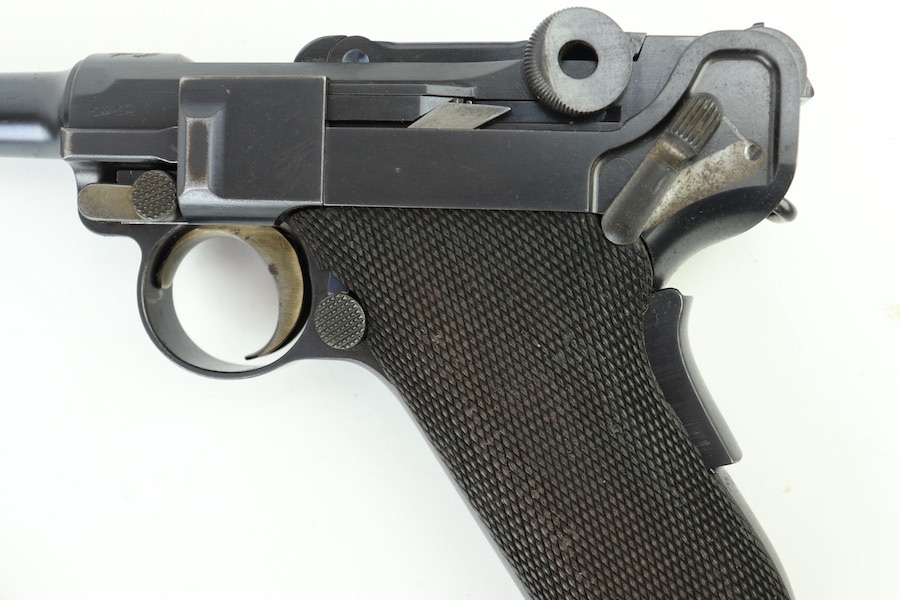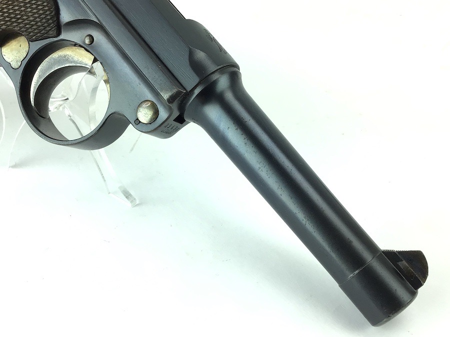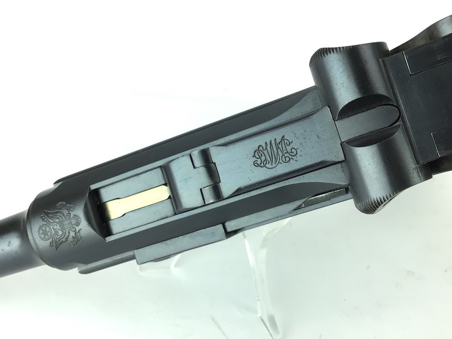 11/7/23 – Original and great condition. Scarce and very desirable early Model 1902 “American Eagle” Luger. These are rare with the fat barrel, as only 600-700 were ever produced in total, all for commercial sales in the United States. This model was a continuation of the earlier 1902 commercial Luger however these were specifically intended for the U.S. market, and these were the first 9mm chambered Lugers. This pistol has the short old style frame with leaf springs and no stock lug, recessed breech block, dished toggles with toggle lock and grip safety. The barrel extension is also the short old model with the top of the chamber area roll marked with the prominent “American Eagle” crest, with the front toggle correctly marked with the “DWM” logo. The bluing on this one rates at about 85 – 90%, with minor high edge wear on the muzzle and sideplate. There is also some patina on the front and back straps, and a few very minor areas of pinpricking. Original straw rates at around 90%. The grips show minor smoothing and handling wear but no cracks or chips. Blank wood bottom magazine.