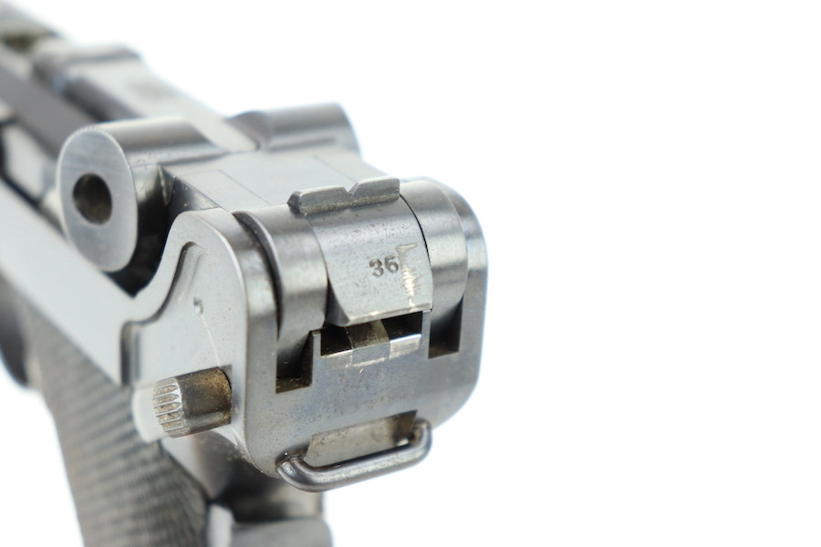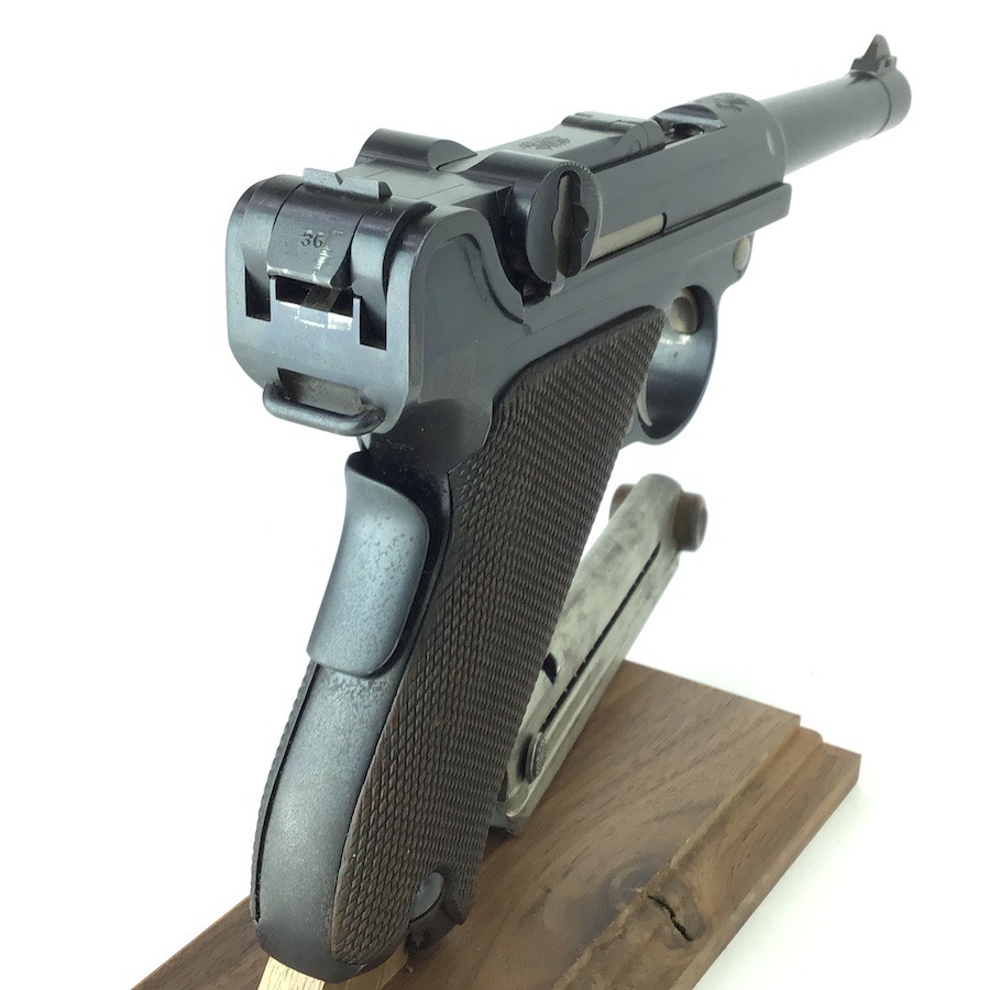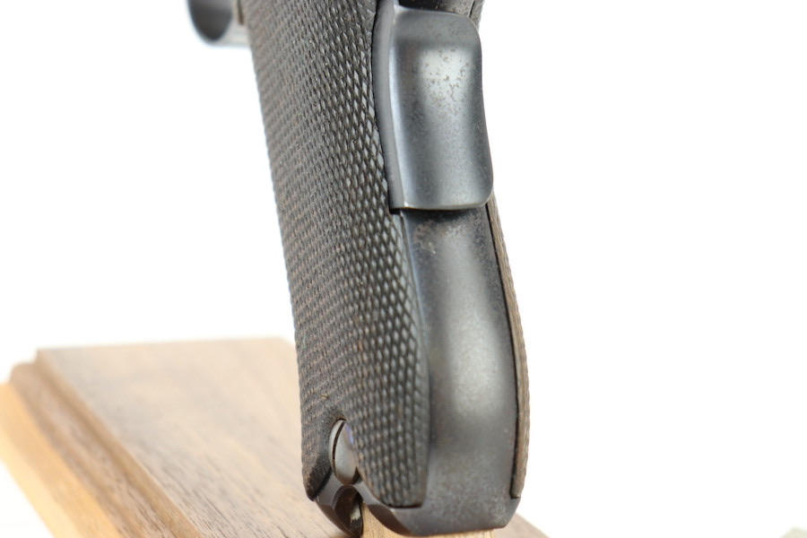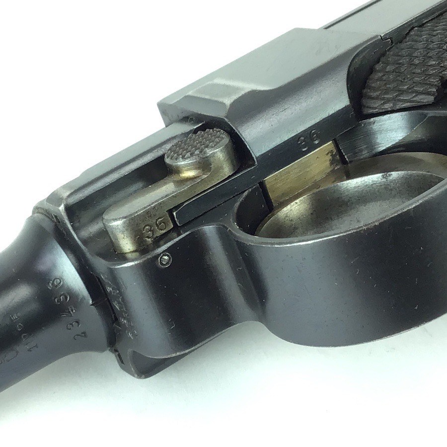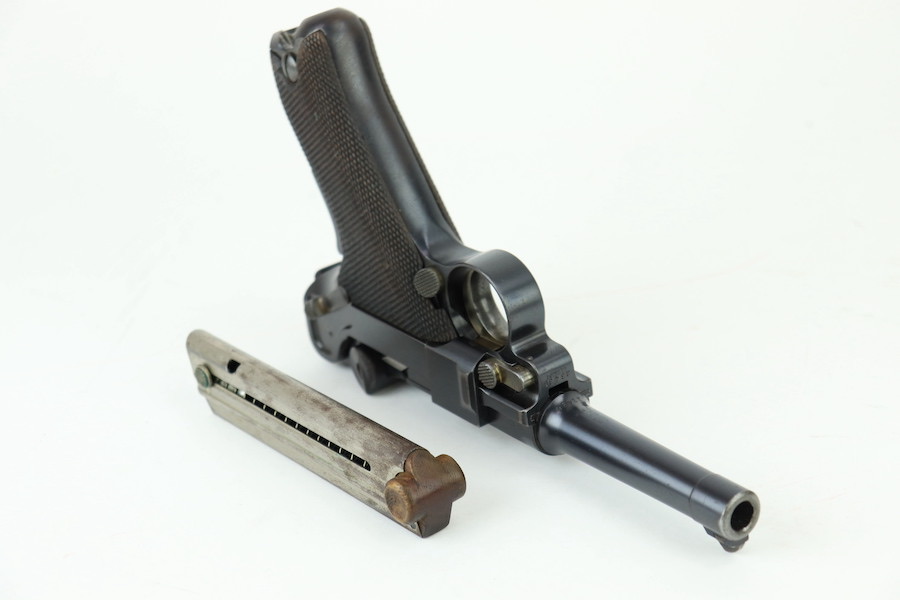 11/7/23 – Original and great condition. Scarce and very desirable early Model 1902 “American Eagle” Luger. These are rare with the fat barrel, as only 600-700 were ever produced in total, all for commercial sales in the United States. This model was a continuation of the earlier 1902 commercial Luger however these were specifically intended for the U.S. market, and these were the first 9mm chambered Lugers. This pistol has the short old style frame with leaf springs and no stock lug, recessed breech block, dished toggles with toggle lock and grip safety. The barrel extension is also the short old model with the top of the chamber area roll marked with the prominent “American Eagle” crest, with the front toggle correctly marked with the “DWM” logo. The bluing on this one rates at about 85 – 90%, with minor high edge wear on the muzzle and sideplate. There is also some patina on the front and back straps, and a few very minor areas of pinpricking. Original straw rates at around 90%. The grips show minor smoothing and handling wear but no cracks or chips. Blank wood bottom magazine.
