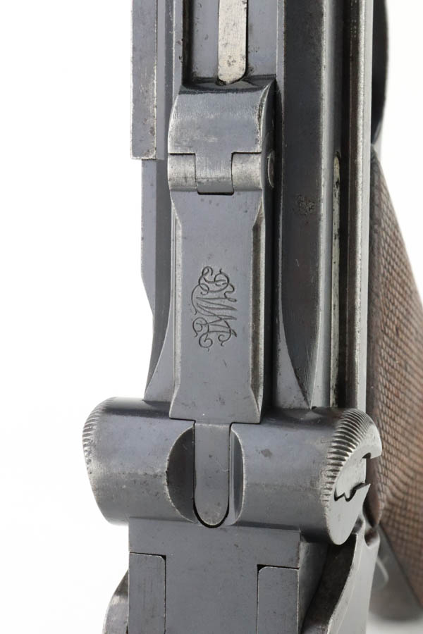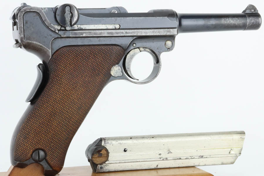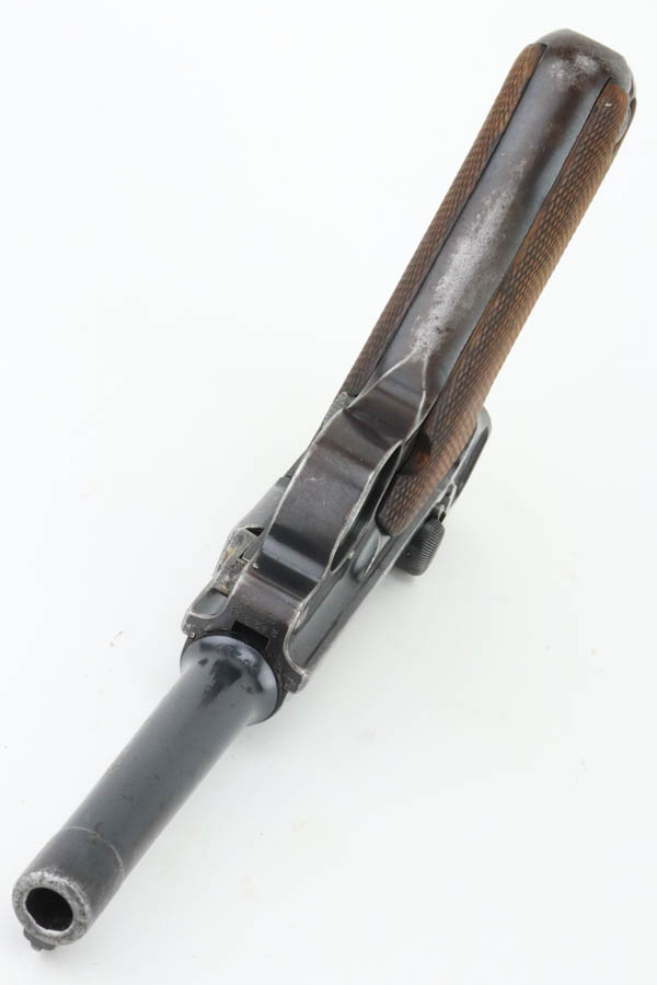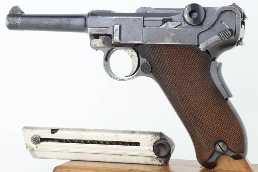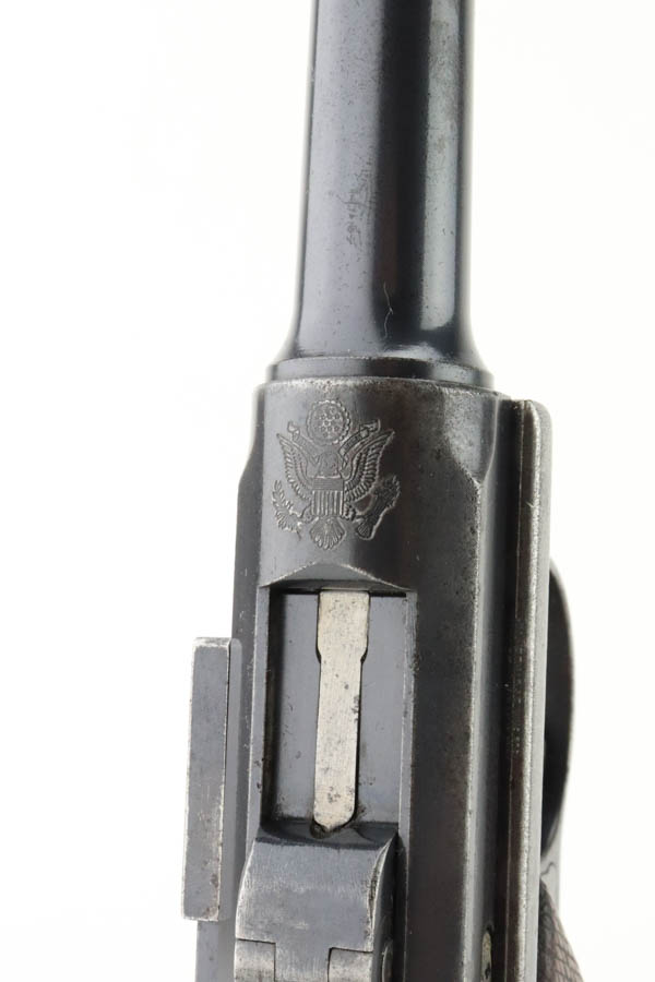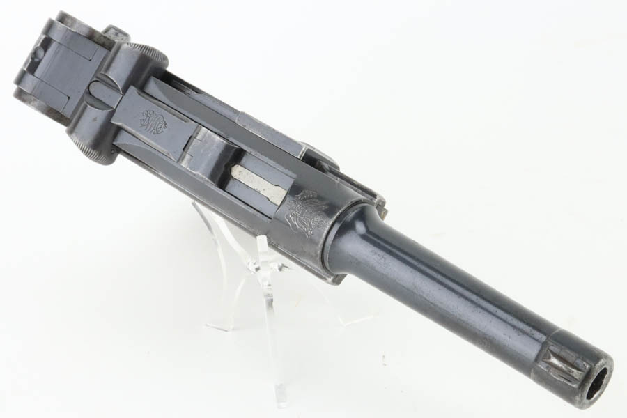 6/17/24 – This is a very desirable early Model 1902 “American Eagle” Luger pistol. These are rare with the fat barrel, as only 600-700 were ever produced in total, all for commercial sales in the United States. This model was a continuation of the earlier 1902 commercial Luger however these were specifically intended for the U.S. market, and these were the first 9mm chambered Lugers. This pistol has the short old style frame with leaf springs and no stock lug, recessed breech block, dished toggles with toggle lock and grip safety. The barrel extension is also the short old model with the top of the chamber area roll marked with the prominent “American Eagle” crest, with the front toggle correctly marked with the “DWM” logo. It has retained roughly 85% of its original finish with wear on the grip straps, general high edge wear, and wear around the muzzle. Areas of minor pitting here and there, concentrated mostly around the high edges and along the barrel. Fitted with wood grips and comes with a proper “Cal 9mm” marked magazine – two repaired cracks in the base. The bore is pretty nice for the most part, but there is minor pitting around the muzzle end.