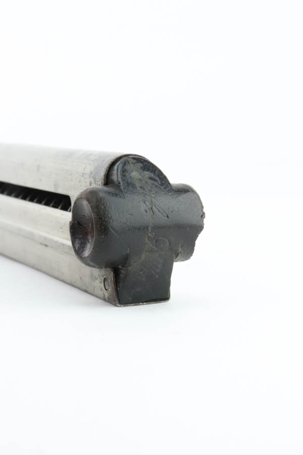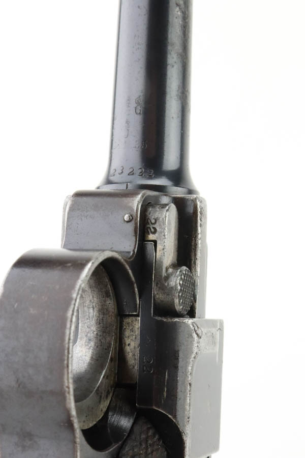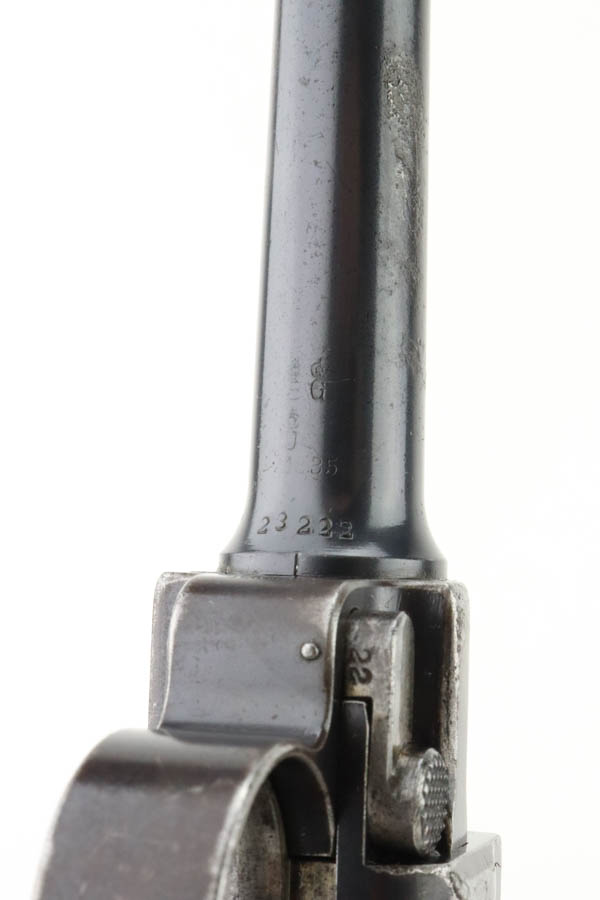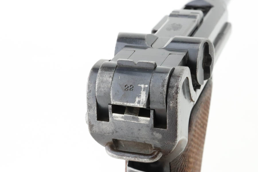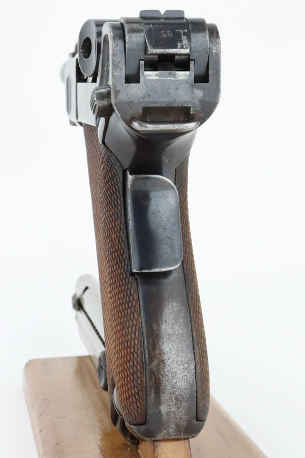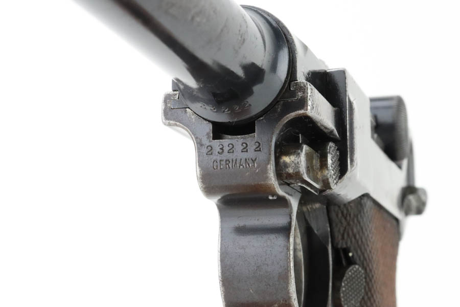 6/17/24 – This is a very desirable early Model 1902 “American Eagle” Luger pistol. These are rare with the fat barrel, as only 600-700 were ever produced in total, all for commercial sales in the United States. This model was a continuation of the earlier 1902 commercial Luger however these were specifically intended for the U.S. market, and these were the first 9mm chambered Lugers. This pistol has the short old style frame with leaf springs and no stock lug, recessed breech block, dished toggles with toggle lock and grip safety. The barrel extension is also the short old model with the top of the chamber area roll marked with the prominent “American Eagle” crest, with the front toggle correctly marked with the “DWM” logo. It has retained roughly 85% of its original finish with wear on the grip straps, general high edge wear, and wear around the muzzle. Areas of minor pitting here and there, concentrated mostly around the high edges and along the barrel. Fitted with wood grips and comes with a proper “Cal 9mm” marked magazine – two repaired cracks in the base. The bore is pretty nice for the most part, but there is minor pitting around the muzzle end.