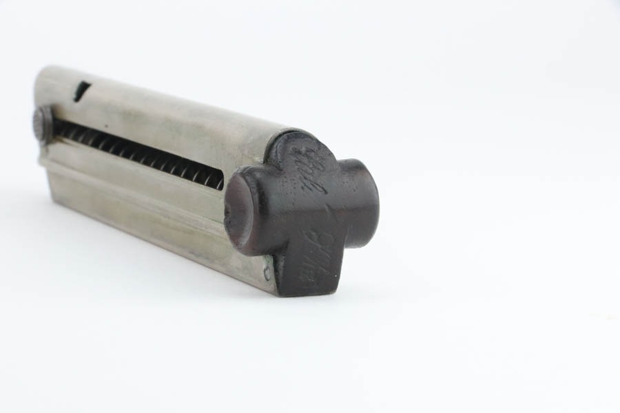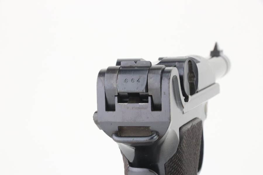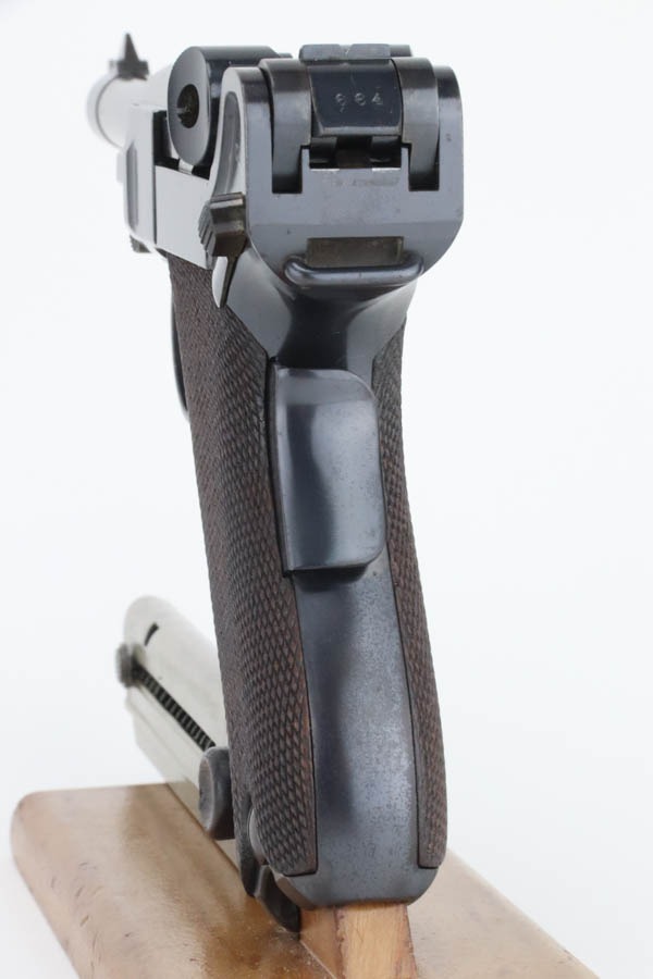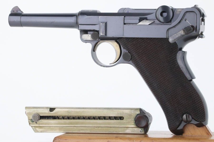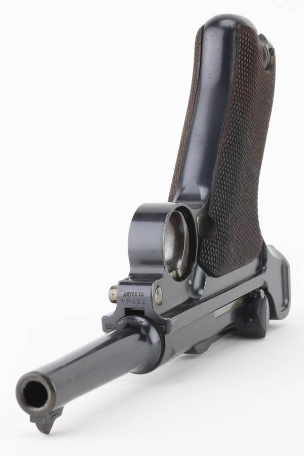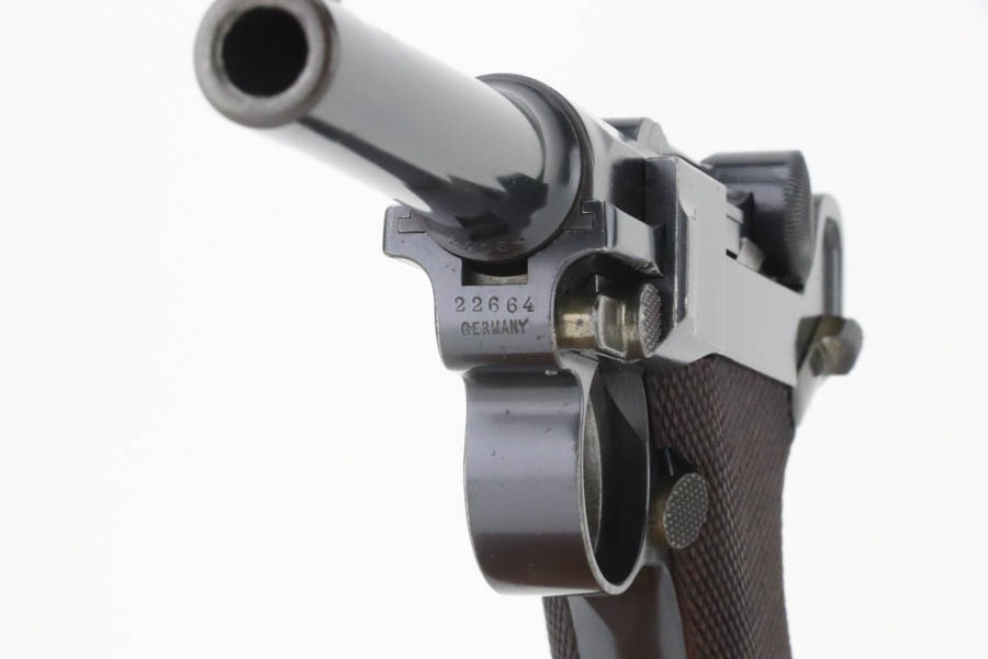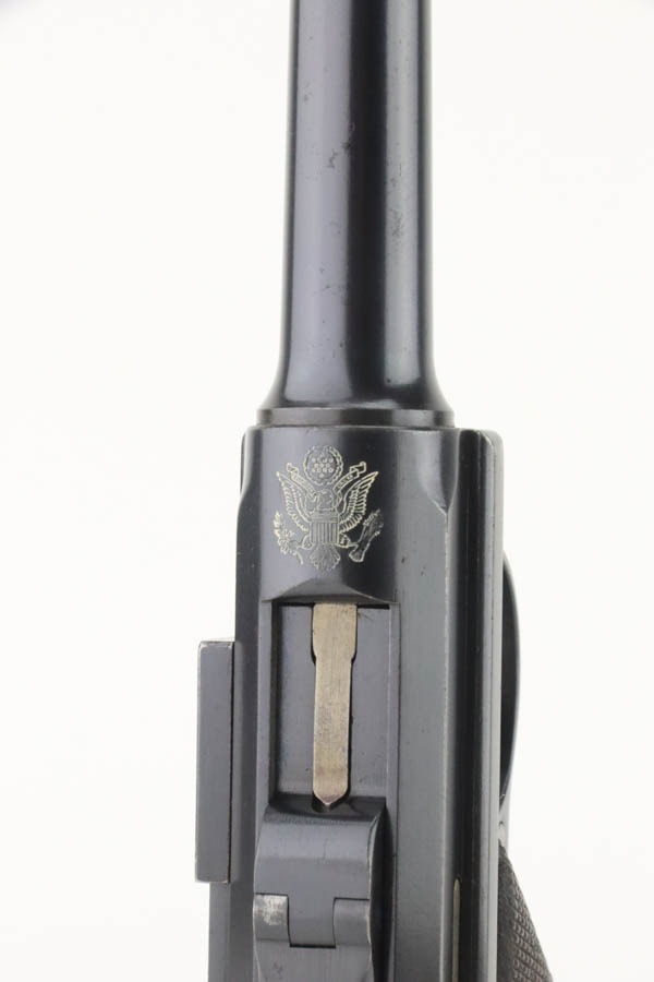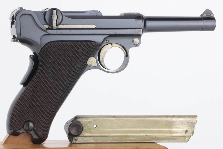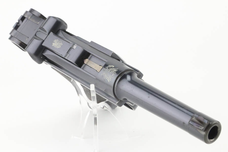 11/8/24 – This is a very desirable early Model 1902 “American Eagle” Luger pistol. These are rare with the fat barrel, as only 600-700 were ever produced in total, all for commercial sales in the United States. This model was a continuation of the earlier 1902 commercial Luger however these were specifically intended for the U.S. market, and these were the first 9mm chambered Lugers. This pistol has the short old style frame with leaf springs and no stock lug, recessed breech block, dished toggles with toggle lock and grip safety. The barrel extension is also the short old model with the top of the chamber area roll marked with the prominent “American Eagle” crest, with the front toggle correctly marked with the “DWM” logo. This one has retained nearly all of its finish, but we believe the barrel has been re-blued. Fitted with excellent wood grips and comes with a correct “Cal 9m/m” marked magazine. Very nice bore.