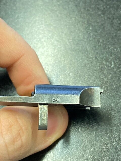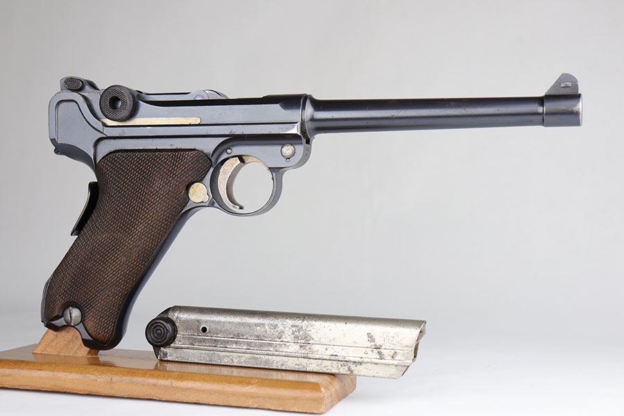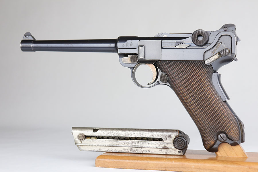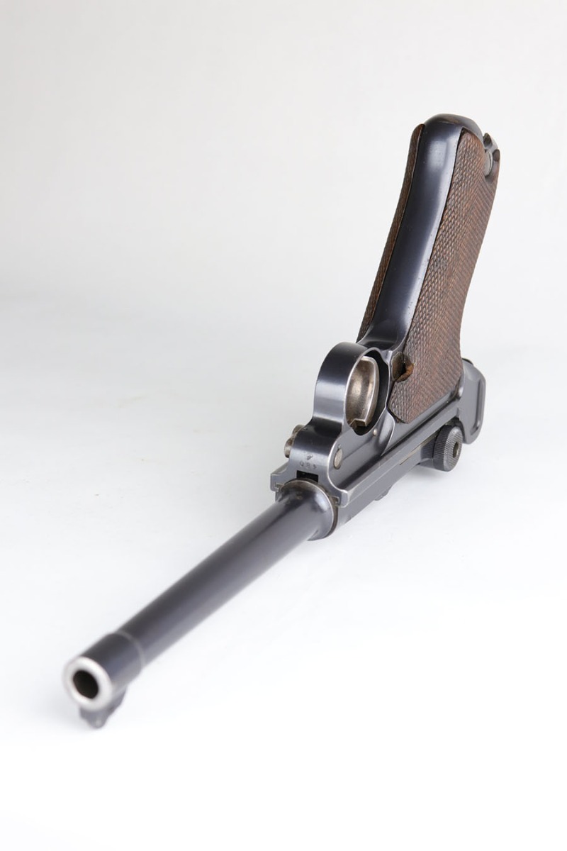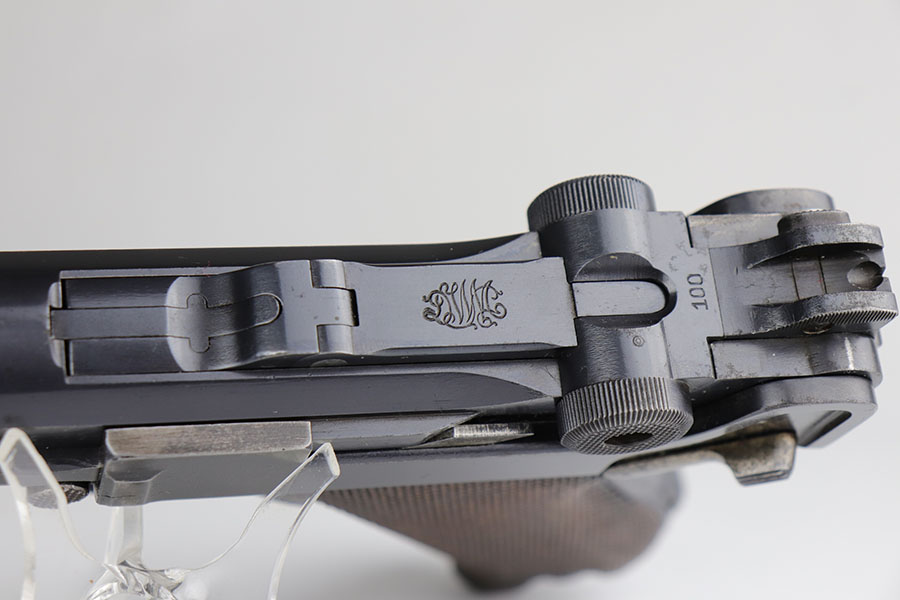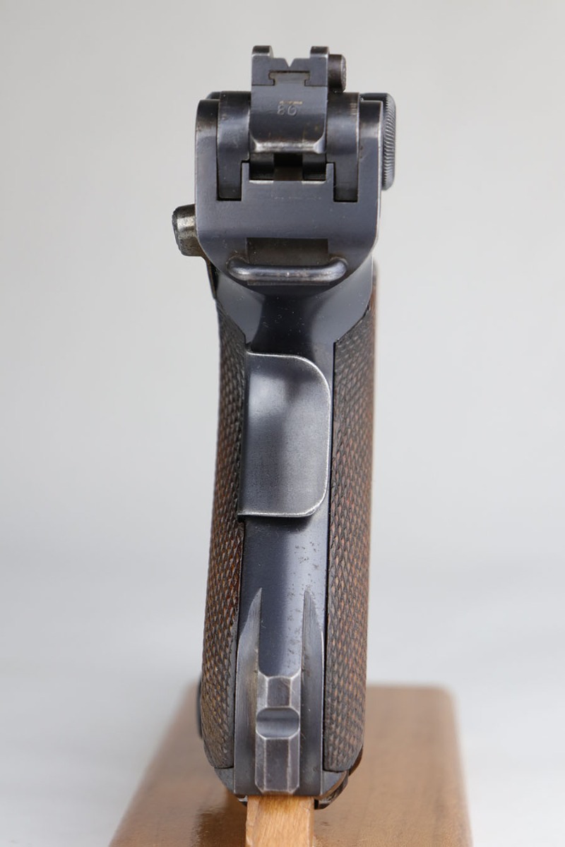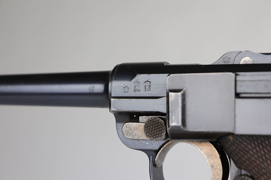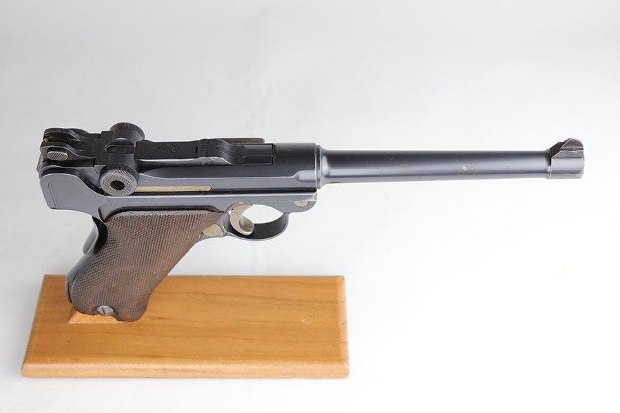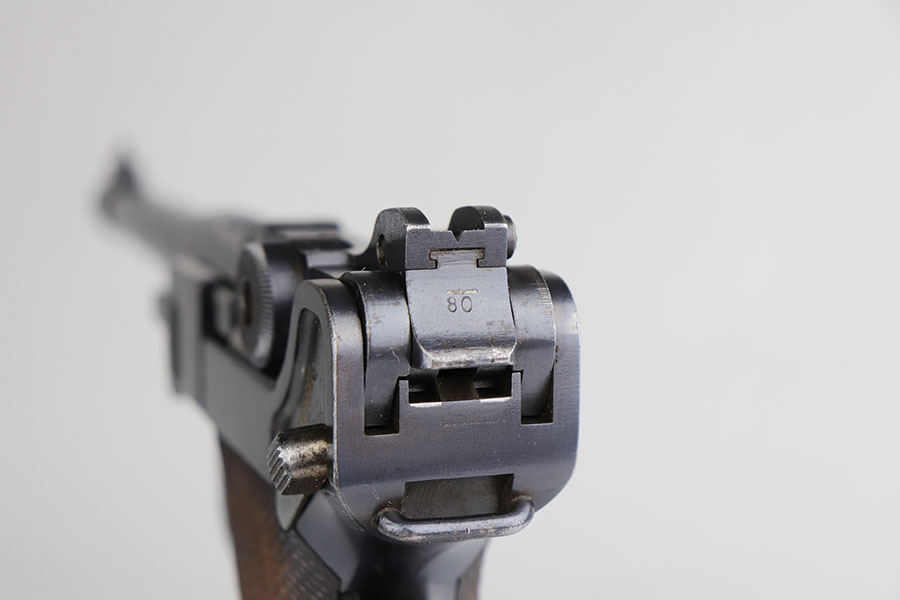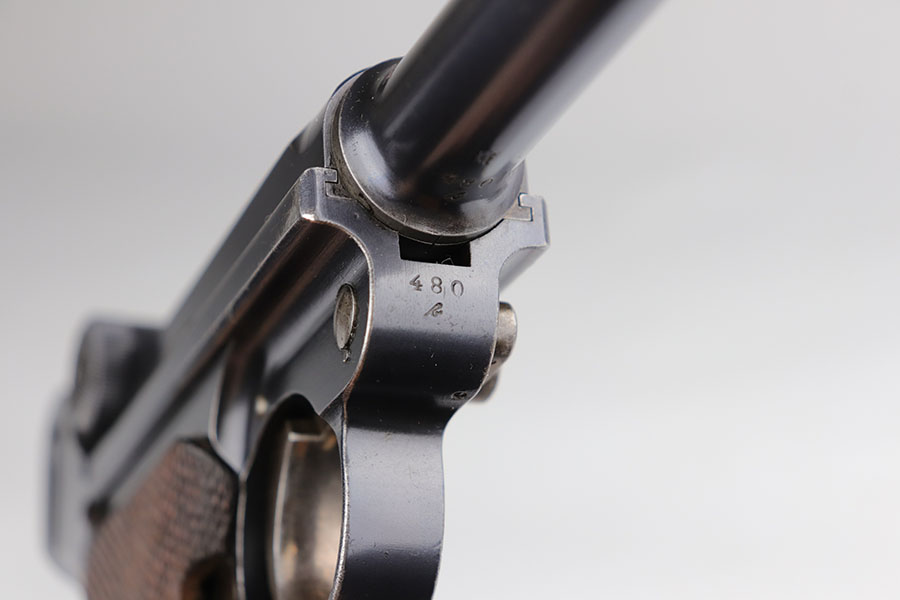 5/13/20 – This is a fairly rare and hard to find German Navy Luger; a second variation Model 1906. The early 1906 model Navy’s were distinguished by the extended barrel, the “Navy” style rear site that was adjustable to 100 or 200 meters, and the grip safety. Only about 21,000 were produced. Comes with all original finish, better than most as most of the Navy Lugers have pitting due to extended use in a salt water environment. It has all matching numbered parts, except for the magazine. However, the magazine is an original Navy mag from the same time period. The original finish covers about 96% of the gun. The grip straps are especially strong. The straw colored small parts are weak. Now for the only negative. This was recorded years ago as having a mismatched sideplate. Clearly it now has a matching sideplate (see photo of the bottom of the plate, as well as the reverse side of the plate). Also, the finish on the sideplate is worn just a little more than the rest of the gun. So, most likely someone found a matching sideplate (very hard to find but possible) or they had the sideplate numbered to match. Looking at the “80” , the font and style looks correct to me, but look at the photos and decide for yourself. We have priced the Luger accordingly. With no issues this gun would sell in the $6k-$6500 range.