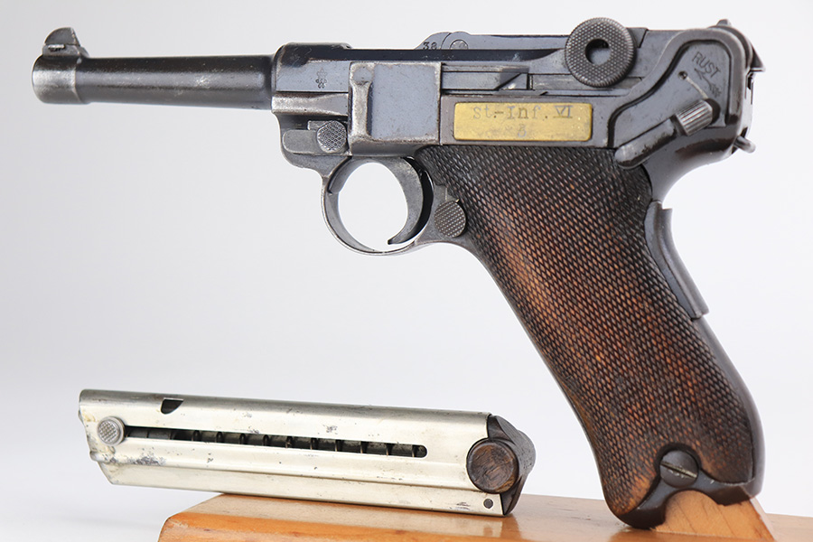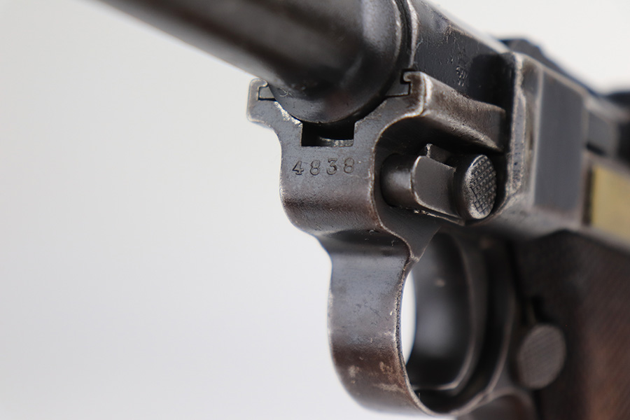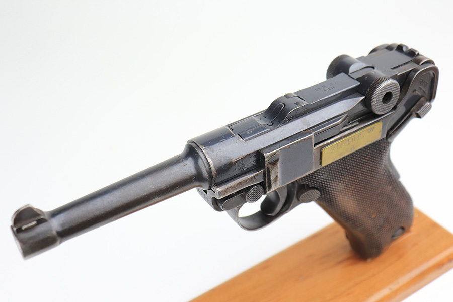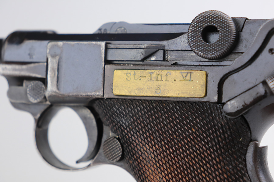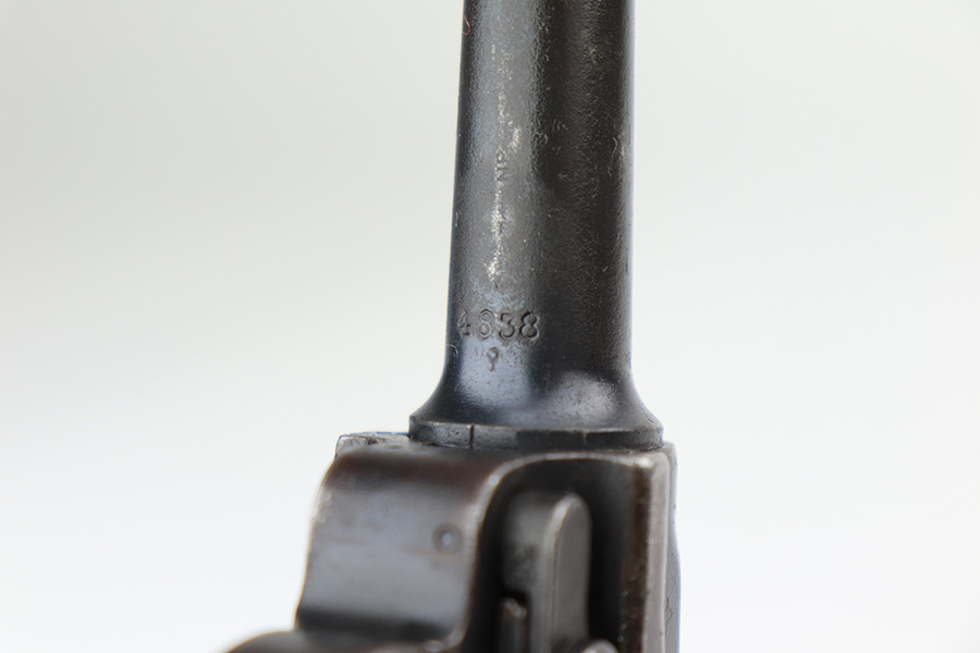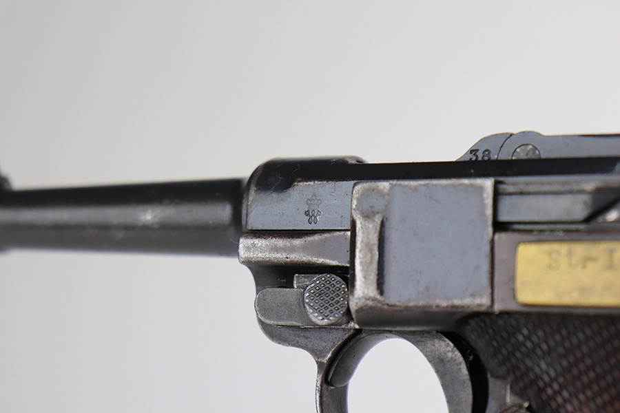 4/7/22 – This is a scarce Luger variation that was produced by the Vickers Ltd. Company in England for the Netherlands. These were produced by Vickers because DWM was not allowed to deliver 9mm pistols due to the Treaty of Versailles. There were approximately 10,000 made however they are very rare today as they saw considerable use in the Far East and most you see are in terrible condition. Almost all were arsenal refurbished during the 1925-1933 time frame, and that does not detract from the value of these rare pistols. This particular gun has a 1931 date on the barrel, which is when it was refurbished. This one is all matching numbered parts and has the brass plate with unit marking on the left side of the frame. The marking indicates it was property of the “Staff of the Sixth Infantry Brigade” of the Dutch East Indies Army. The firing pin and hold open are both unnumbered. The grips are marked only with an asterisk on each panel, so perhaps replaced by an arsenal. It has retained roughly 70% of its finish most of the bluing loss on the barrel and front strap, but oxidation/patina throughout. WW1-era magazine with mismatched bottom. The bore is clean with strong rifling, just minor frost throughout.
