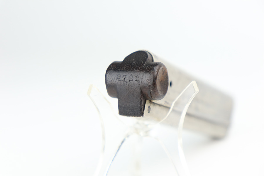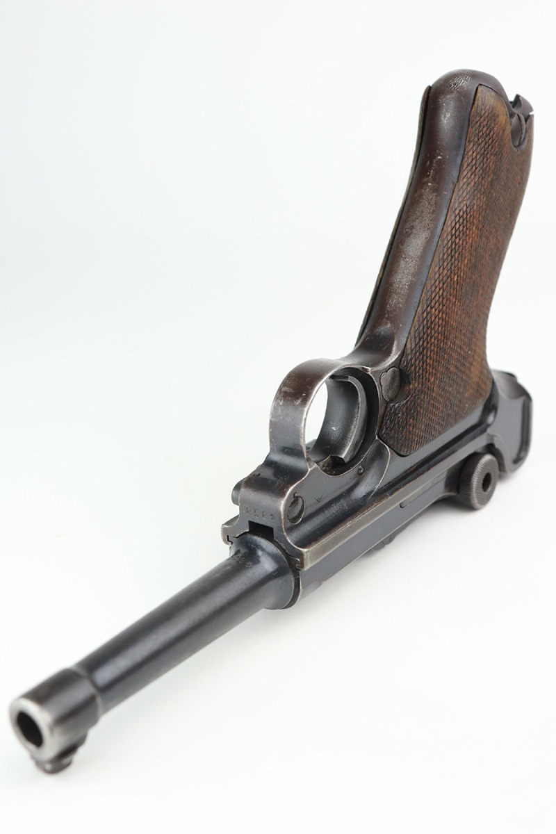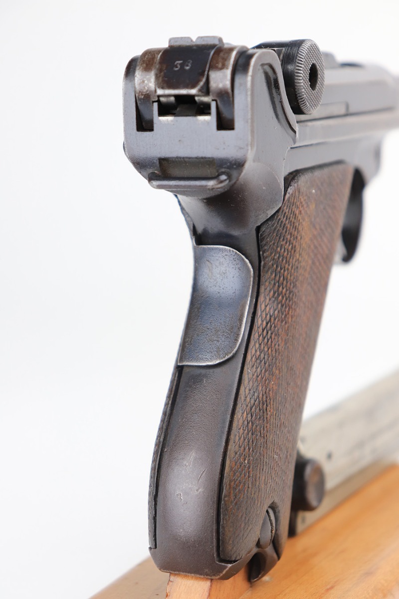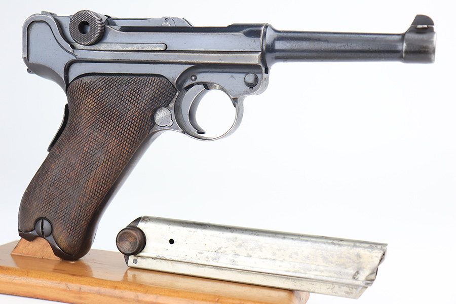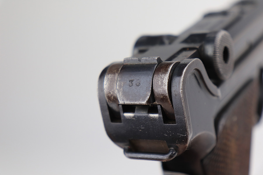 4/7/22 – This is a scarce Luger variation that was produced by the Vickers Ltd. Company in England for the Netherlands. These were produced by Vickers because DWM was not allowed to deliver 9mm pistols due to the Treaty of Versailles. There were approximately 10,000 made however they are very rare today as they saw considerable use in the Far East and most you see are in terrible condition. Almost all were arsenal refurbished during the 1925-1933 time frame, and that does not detract from the value of these rare pistols. This particular gun has a 1931 date on the barrel, which is when it was refurbished. This one is all matching numbered parts and has the brass plate with unit marking on the left side of the frame. The marking indicates it was property of the “Staff of the Sixth Infantry Brigade” of the Dutch East Indies Army. The firing pin and hold open are both unnumbered. The grips are marked only with an asterisk on each panel, so perhaps replaced by an arsenal. It has retained roughly 70% of its finish most of the bluing loss on the barrel and front strap, but oxidation/patina throughout. WW1-era magazine with mismatched bottom. The bore is clean with strong rifling, just minor frost throughout.