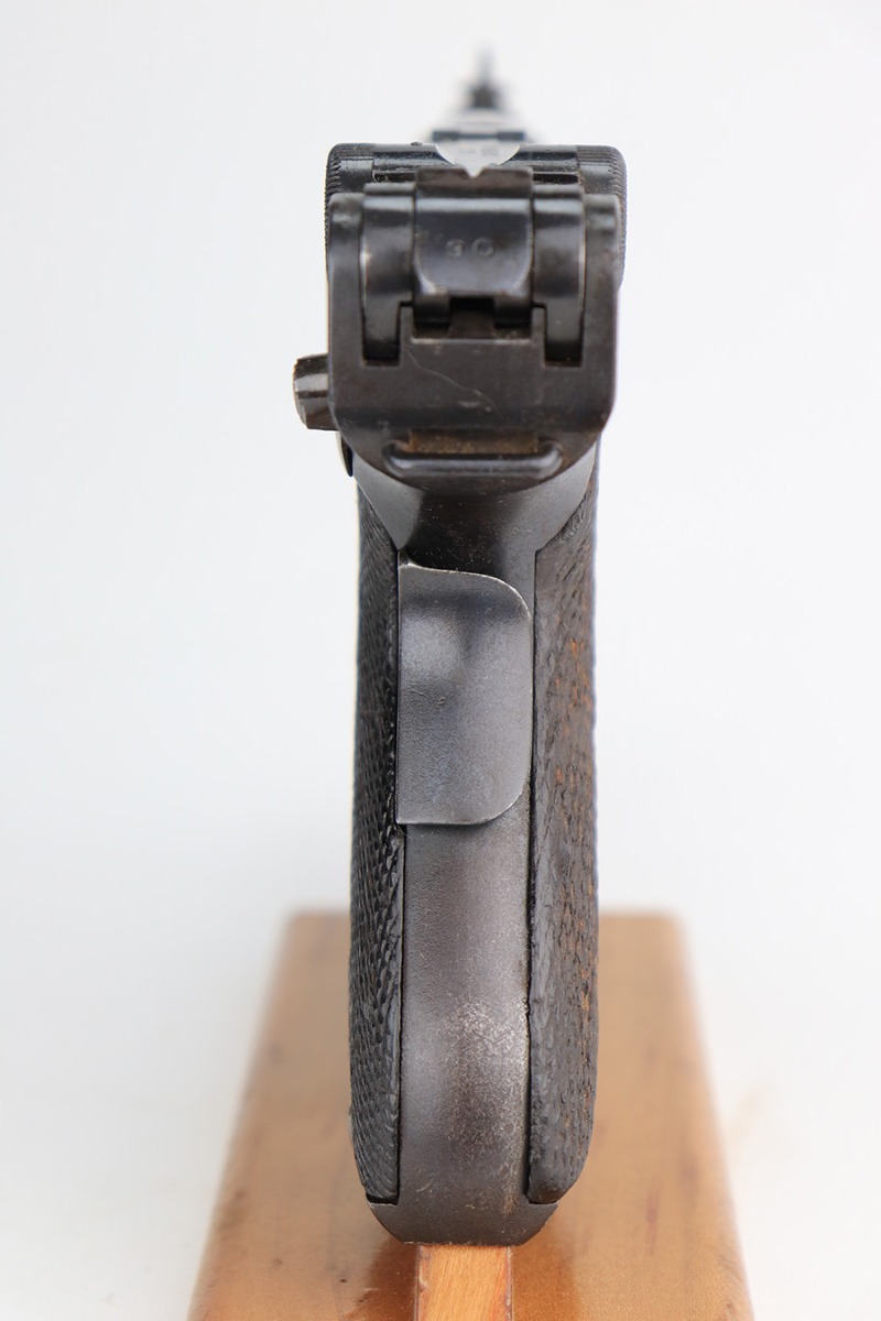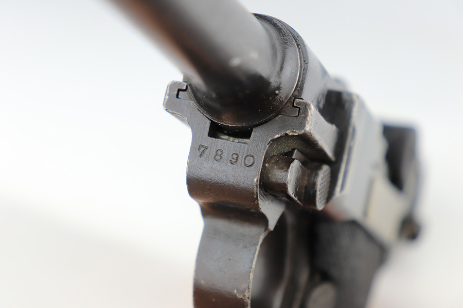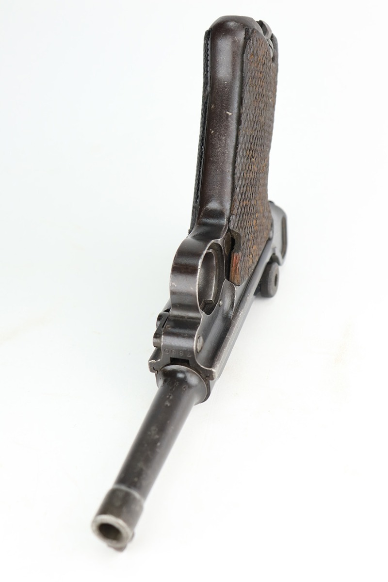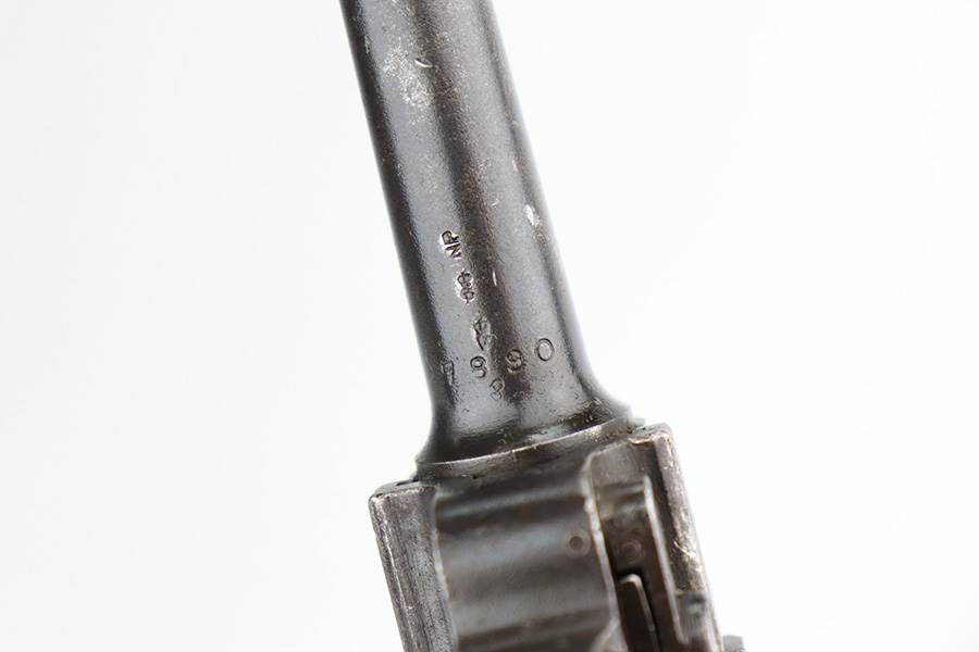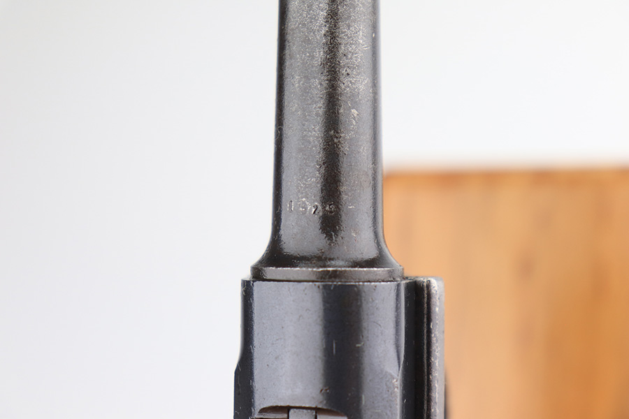 1/12/23 – This is a scarce Luger variation that was produced by the Vickers Ltd. Company in England for the Netherlands. These were produced in the 1915-17 timeframe when hostilities broke out between the Germans and Dutch. There were approximately 10,000 made however they are very rare today as they saw considerable use in the Far East and most you see are in terrible condition. Almost all were arsenal refurbished during the 1925-1933 time frame, and that does not detract from the value of these rare pistols. This one is all matching and has a blank brass plate – they were usually unit-marked there. It has retained roughly 90% of its finish with areas of wear on the front strap, side plate, side rails, along the barrel, on the side rails, and around the muzzle. There is heavy patina on the straps and tiny pin-pricking under the finish throughout. Comes with slightly worn wood grips (they look slightly different from each other) and an un-numbered magazine. The bore has decent rifling with pin-pricking throughout.