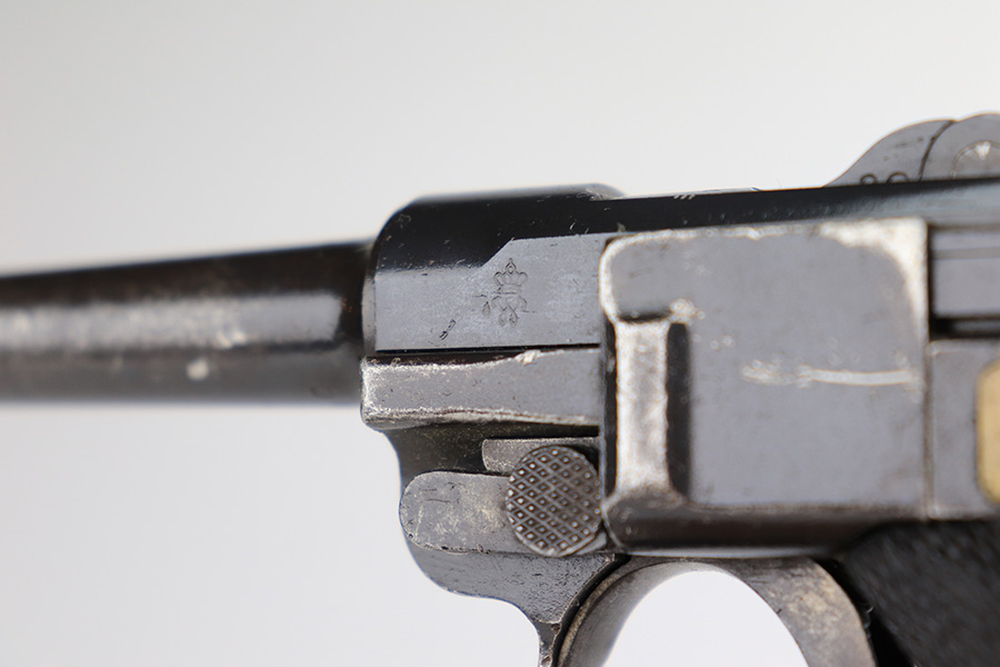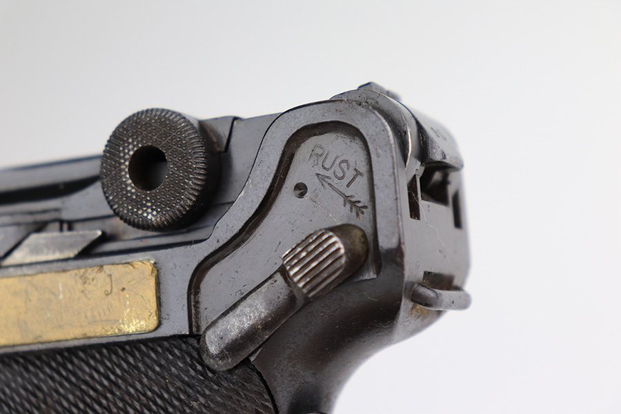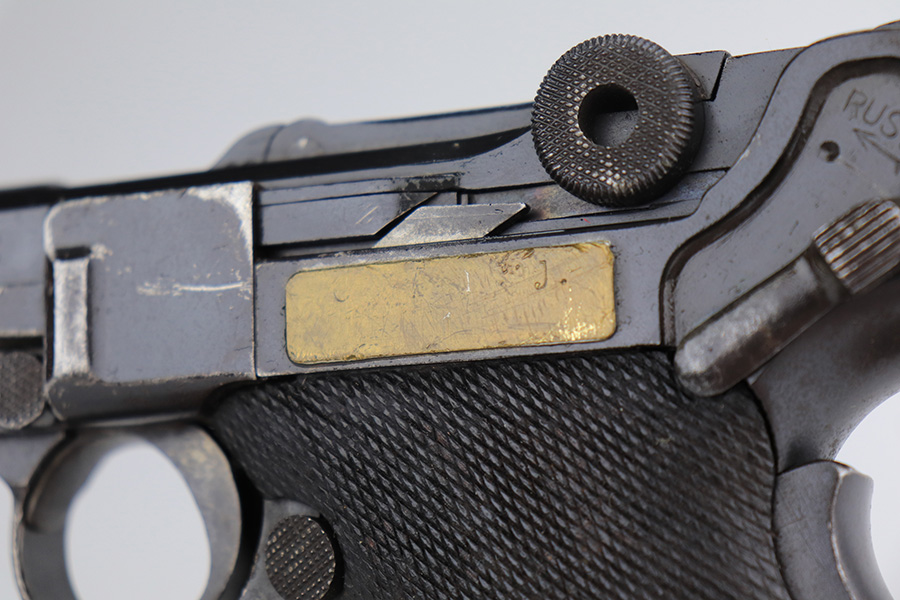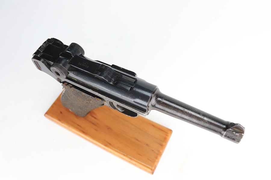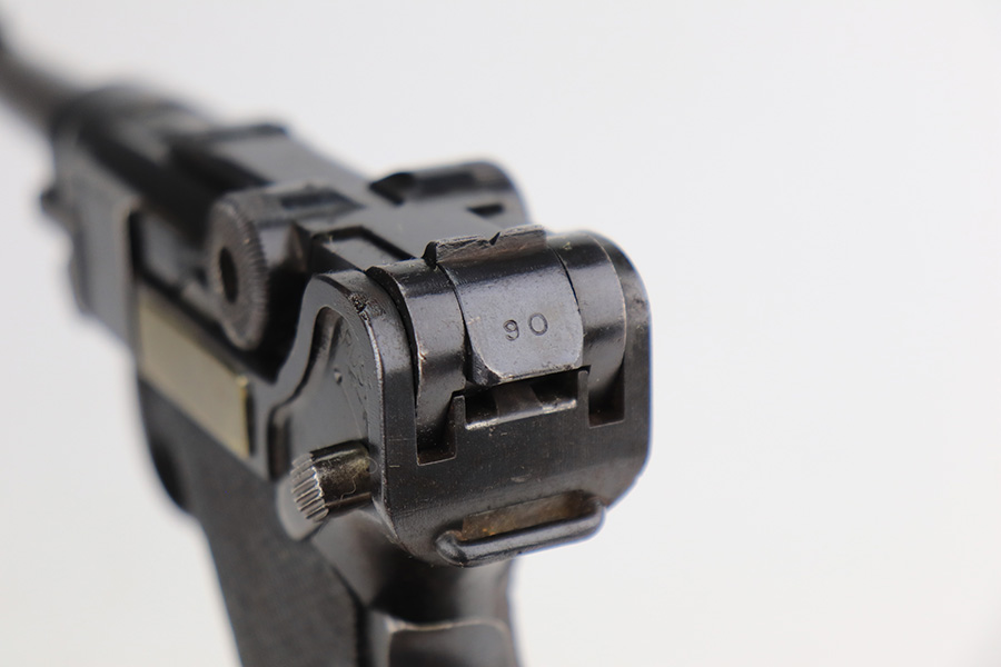 1/12/23 – This is a scarce Luger variation that was produced by the Vickers Ltd. Company in England for the Netherlands. These were produced in the 1915-17 timeframe when hostilities broke out between the Germans and Dutch. There were approximately 10,000 made however they are very rare today as they saw considerable use in the Far East and most you see are in terrible condition. Almost all were arsenal refurbished during the 1925-1933 time frame, and that does not detract from the value of these rare pistols. This one is all matching and has a blank brass plate – they were usually unit-marked there. It has retained roughly 90% of its finish with areas of wear on the front strap, side plate, side rails, along the barrel, on the side rails, and around the muzzle. There is heavy patina on the straps and tiny pin-pricking under the finish throughout. Comes with slightly worn wood grips (they look slightly different from each other) and an un-numbered magazine. The bore has decent rifling with pin-pricking throughout.