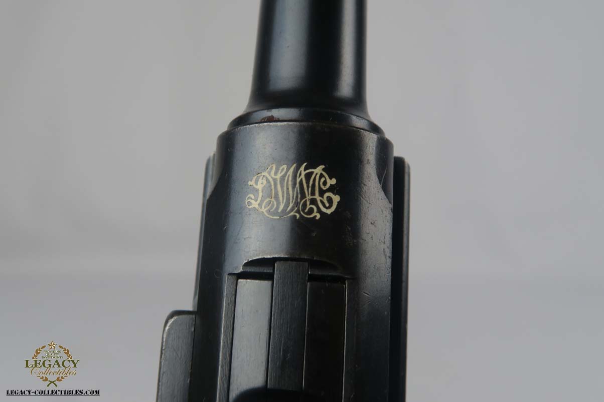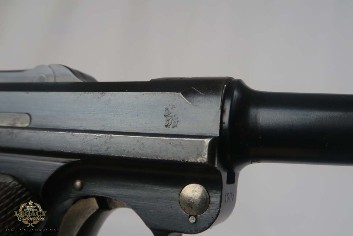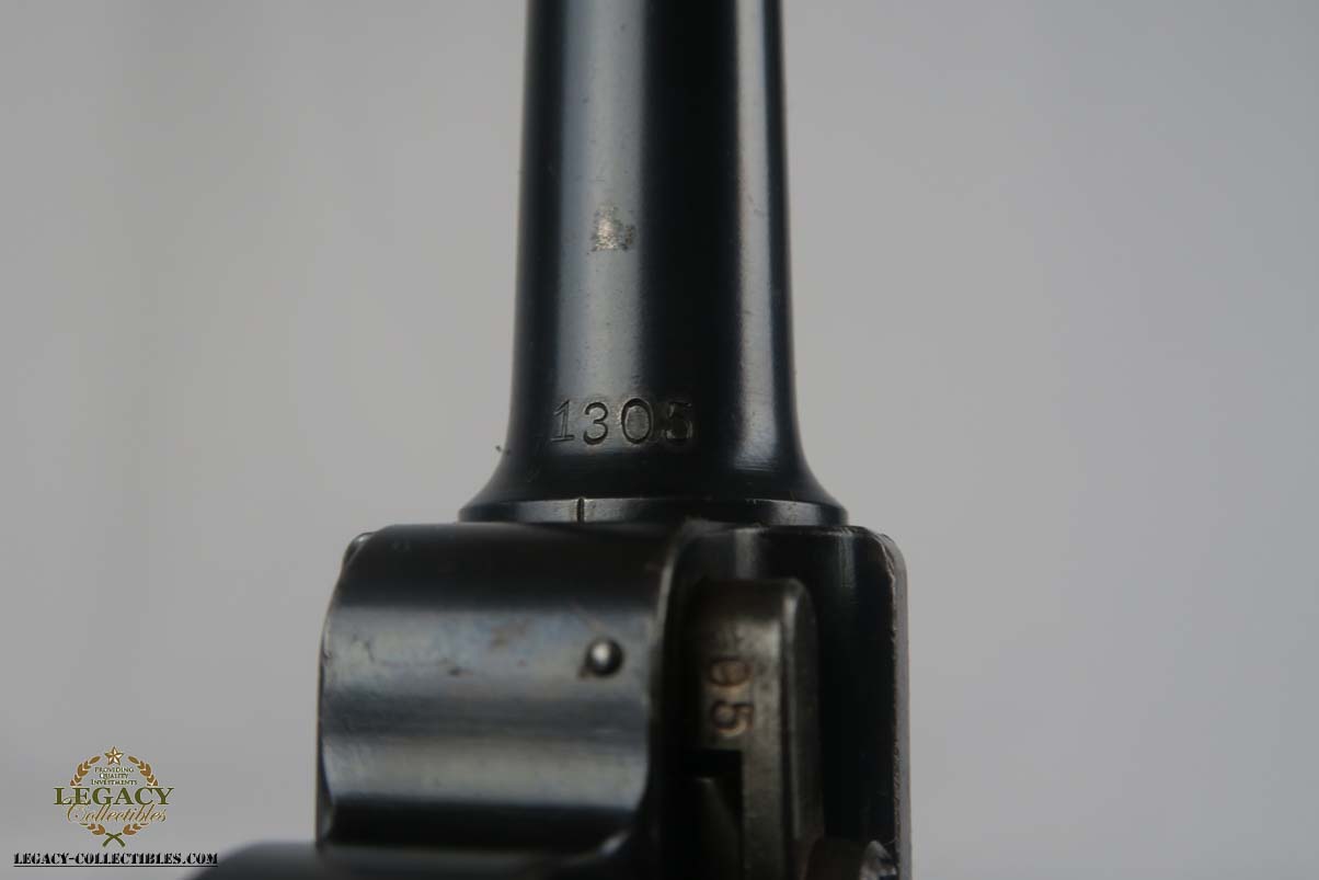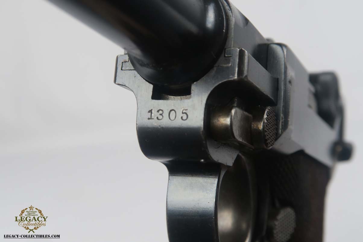 2/2/17 – This is an excellent example of an all original, unaltered 1908 DWM Bulgarian contract Luger pistol. There were exactly 10,000 of these pistols ordered by Bulgaria in the 1908-10 time frame. These are a very difficult example to obtain in original unaltered condition as they saw heavy use in both WWI and WW2; having been rebuilt at least once or twice by DWM. After WW2 most of them were captured by the Russians. This specific pistol has about 95-96% of its original finish, with no major wear to speak of.  There is a little browning coming through on the straps, and some edge wear here and there, but overall it is a remarkable piece.  The chamber is marked with the DWM scroll monogram and unique Bulgarian Crest on top of the front toggle. The right side of the barrel extension is stamped with a single “Bulgarian Rampant Lion” acceptance/proof mark with no other acceptance proofs. The lower safety lever area is marked “FIRE” and the left side of the extractor is marked “LOADED” both in Cyrillic lettering. The full serial number “1305” is located on the front of the receiver and the underside of the barrel, with the partial serial number “05” stamped on most of the various other parts with some correctly unnumbered. The pistol frame has the distinctive Bulgarian lanyard loop on the bottom of the rear grip strap. Both the grips and magazine are unnumbered, but appear period correct.  Bore is excellent, with slightly smoothed grooves but it is clean and shiny.
