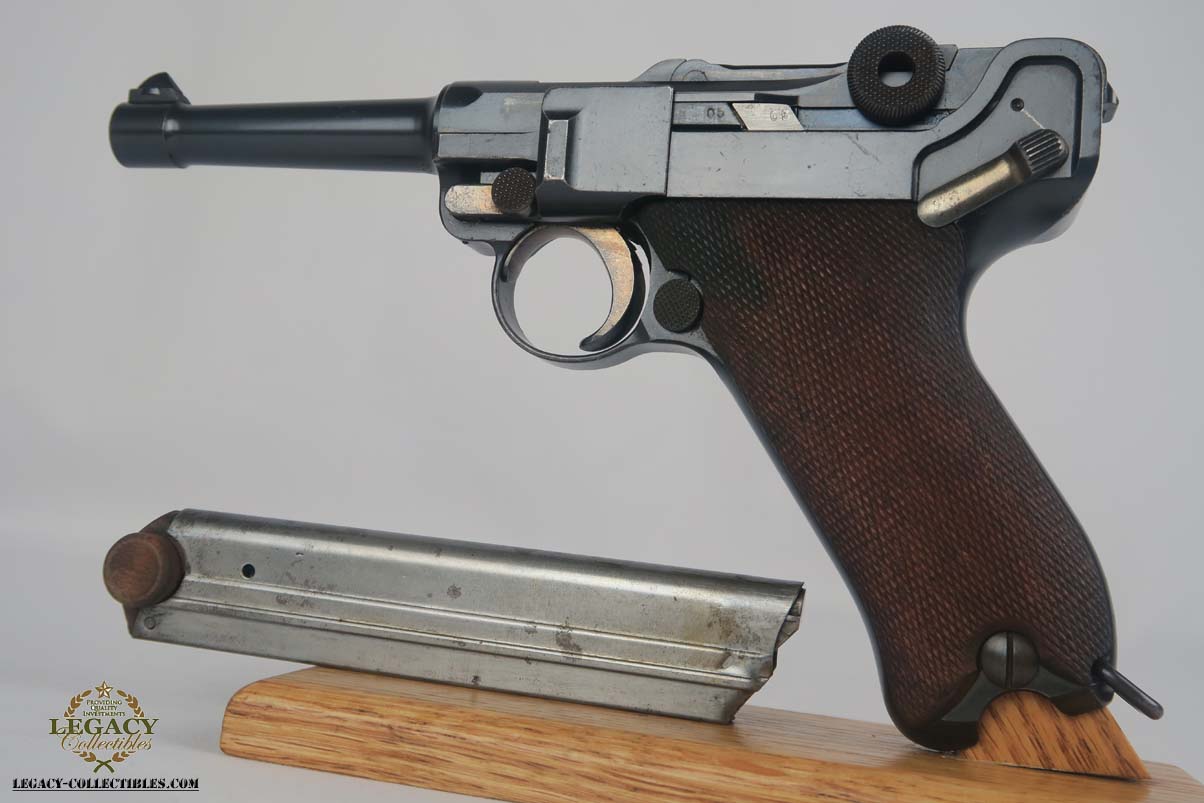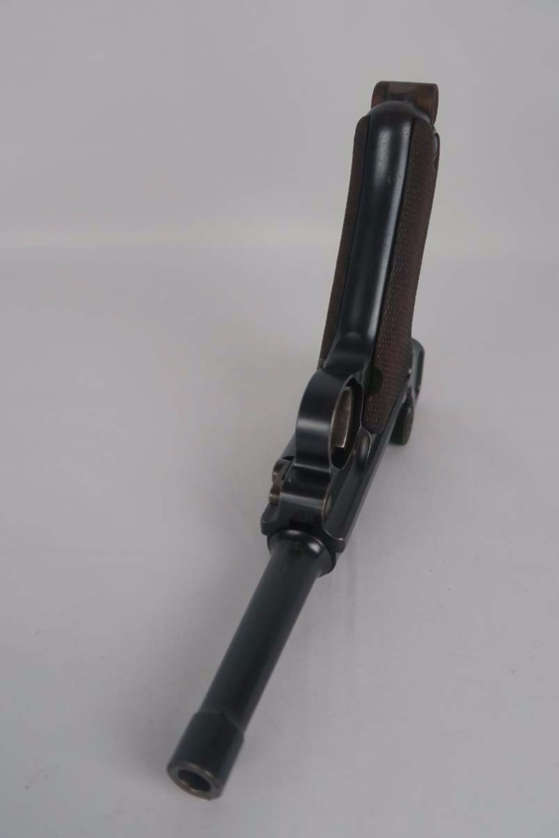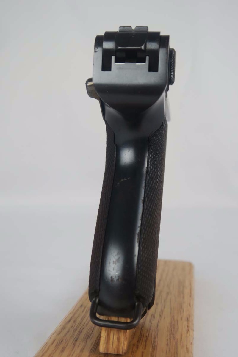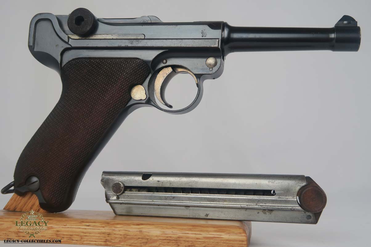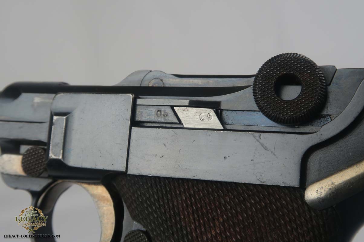 2/2/17 – This is an excellent example of an all original, unaltered 1908 DWM Bulgarian contract Luger pistol. There were exactly 10,000 of these pistols ordered by Bulgaria in the 1908-10 time frame. These are a very difficult example to obtain in original unaltered condition as they saw heavy use in both WWI and WW2; having been rebuilt at least once or twice by DWM. After WW2 most of them were captured by the Russians. This specific pistol has about 95-96% of its original finish, with no major wear to speak of.  There is a little browning coming through on the straps, and some edge wear here and there, but overall it is a remarkable piece.  The chamber is marked with the DWM scroll monogram and unique Bulgarian Crest on top of the front toggle. The right side of the barrel extension is stamped with a single “Bulgarian Rampant Lion” acceptance/proof mark with no other acceptance proofs. The lower safety lever area is marked “FIRE” and the left side of the extractor is marked “LOADED” both in Cyrillic lettering. The full serial number “1305” is located on the front of the receiver and the underside of the barrel, with the partial serial number “05” stamped on most of the various other parts with some correctly unnumbered. The pistol frame has the distinctive Bulgarian lanyard loop on the bottom of the rear grip strap. Both the grips and magazine are unnumbered, but appear period correct.  Bore is excellent, with slightly smoothed grooves but it is clean and shiny.