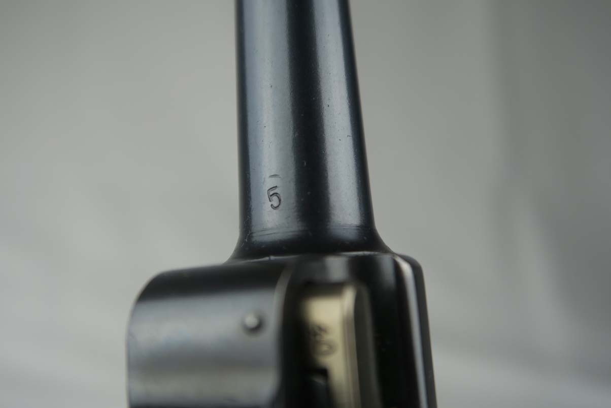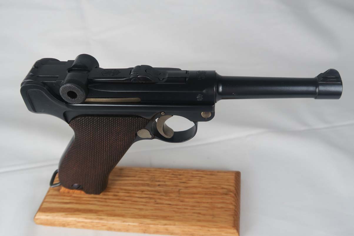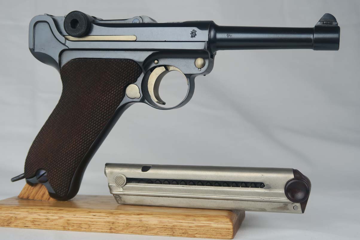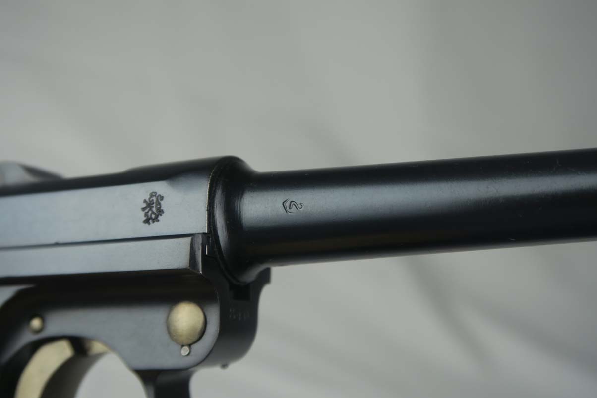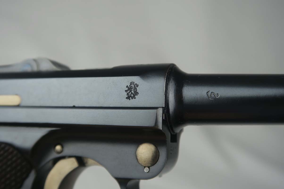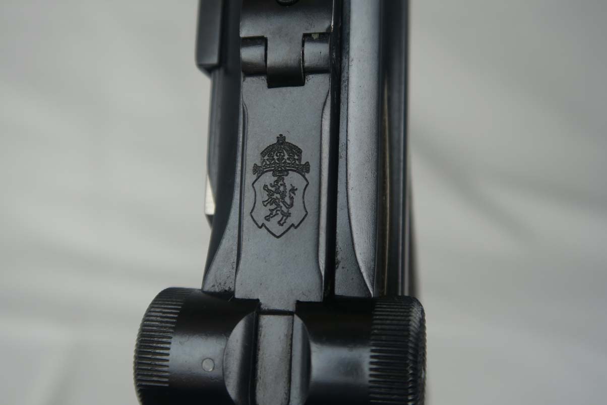 4/19/17 – This is a rare Bulgarian luger, manufactured by DWM. There were exactly 10,000 of these pistols ordered by Bulgaria in the 1908-10 time frame. These are a very difficult example to obtain in original unaltered condition as they saw heavy use in both WWI and WW2; having been rebuilt at least once or twice by DWM. After WW2 most of them were captured by the Russians. This specific pistol has a minty finish, but it has been restored.  The chamber is marked with the DWM scroll monogram and unique Bulgarian Crest on top of the front toggle. The right side of the barrel extension is stamped with a single “Bulgarian Rampant Lion” acceptance/proof mark with no other acceptance proofs. The lower safety lever area is marked “FIRE” and the left side of the extractor is marked “LOADED” both in Cyrillic lettering.  The pistol frame has the distinctive Bulgarian lanyard loop on the bottom of the rear grip strap. The grips are numbered and matching to the pistol.  The magazine has a blank wood bottom but I believe it is postwar.  Bore is excellent.