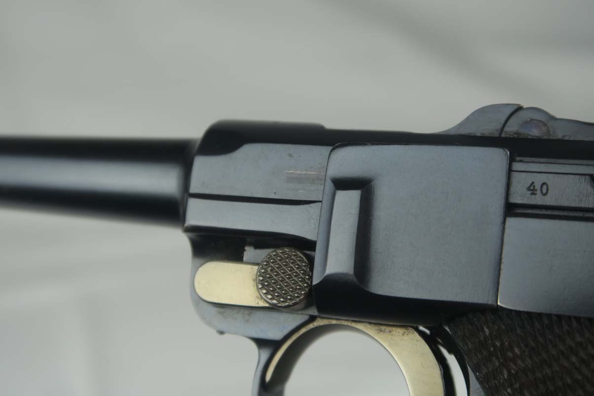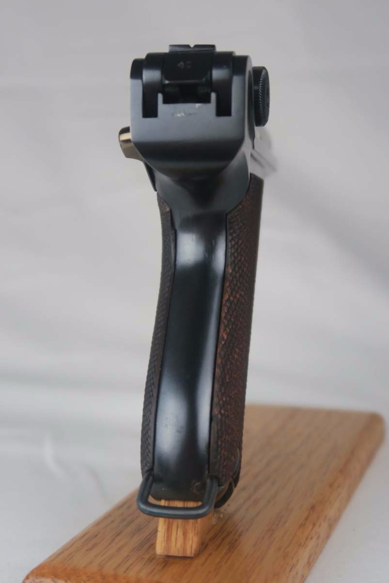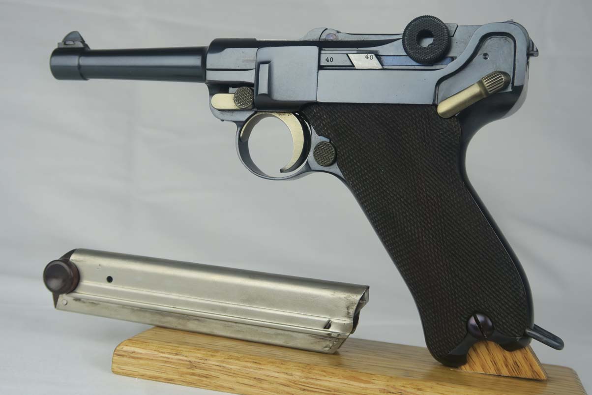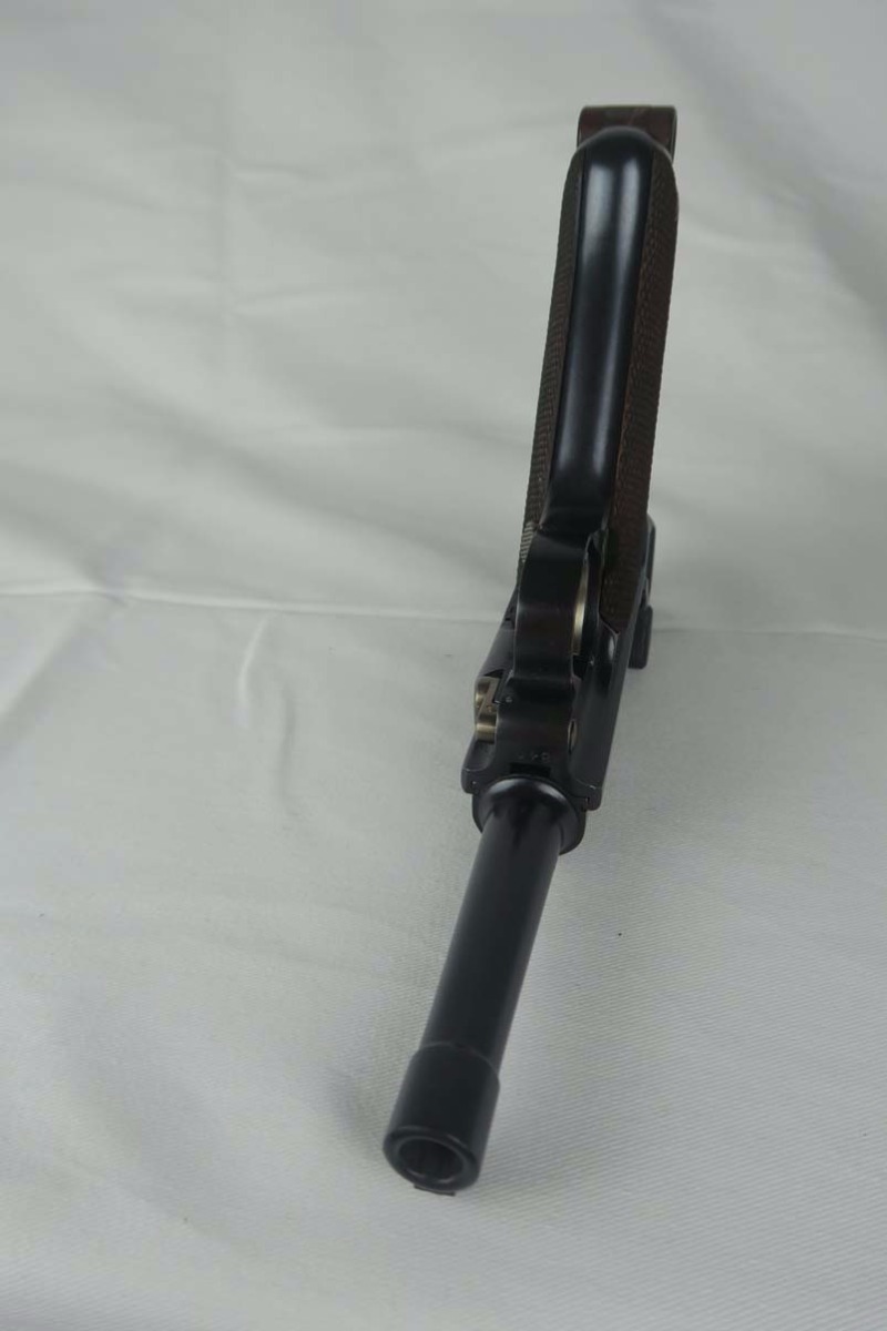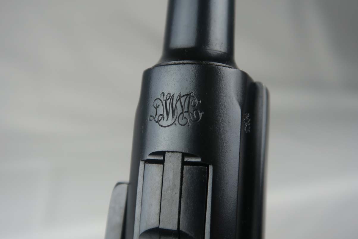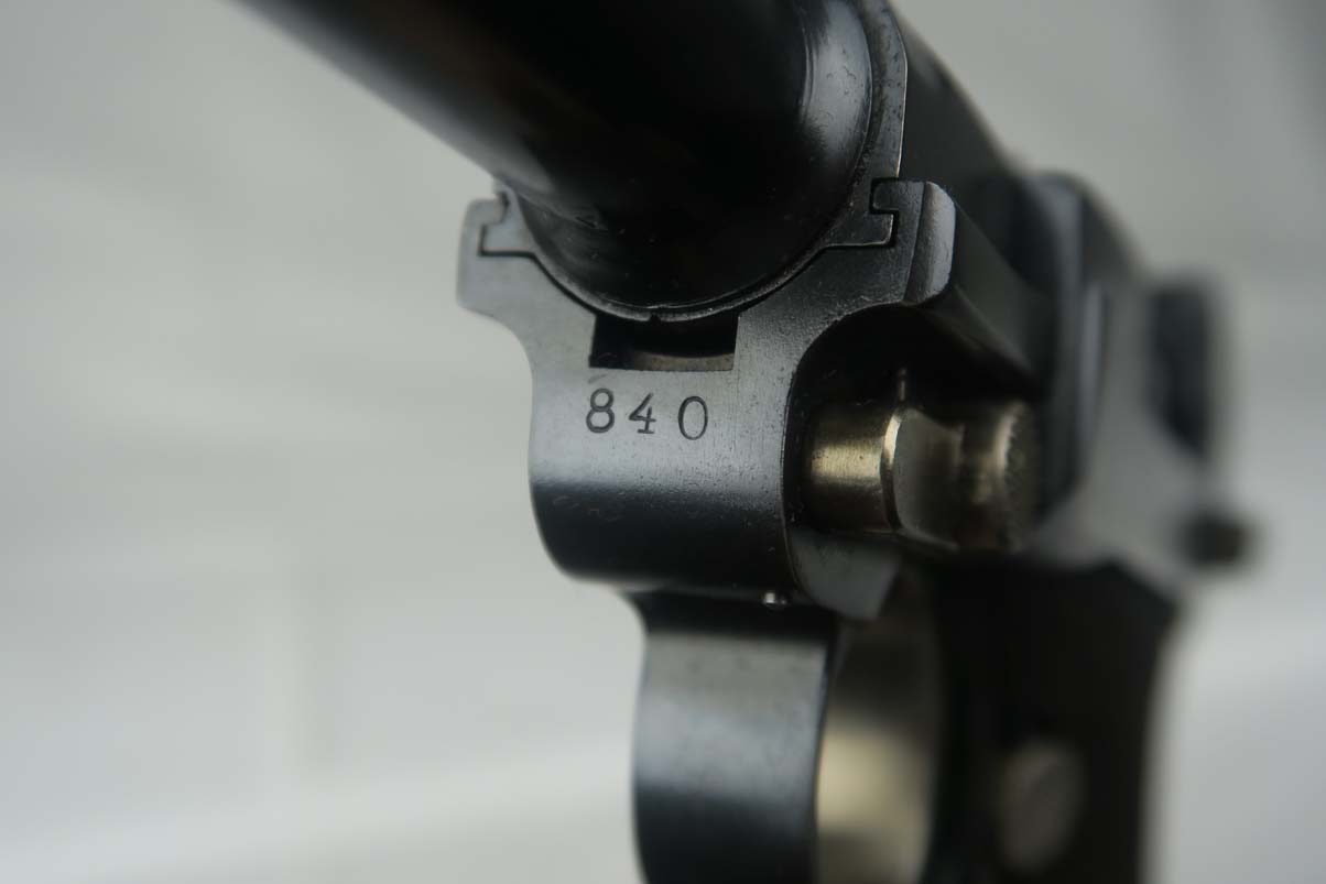 4/19/17 – This is a rare Bulgarian luger, manufactured by DWM. There were exactly 10,000 of these pistols ordered by Bulgaria in the 1908-10 time frame. These are a very difficult example to obtain in original unaltered condition as they saw heavy use in both WWI and WW2; having been rebuilt at least once or twice by DWM. After WW2 most of them were captured by the Russians. This specific pistol has a minty finish, but it has been restored.  The chamber is marked with the DWM scroll monogram and unique Bulgarian Crest on top of the front toggle. The right side of the barrel extension is stamped with a single “Bulgarian Rampant Lion” acceptance/proof mark with no other acceptance proofs. The lower safety lever area is marked “FIRE” and the left side of the extractor is marked “LOADED” both in Cyrillic lettering.  The pistol frame has the distinctive Bulgarian lanyard loop on the bottom of the rear grip strap. The grips are numbered and matching to the pistol.  The magazine has a blank wood bottom but I believe it is postwar.  Bore is excellent.