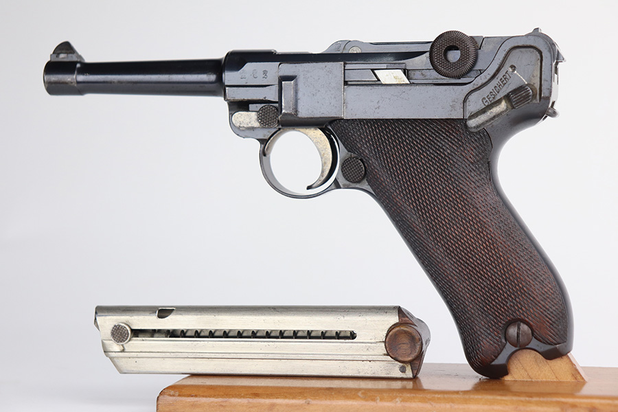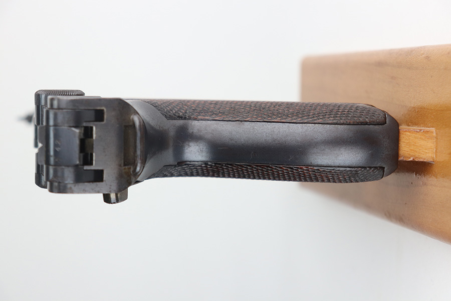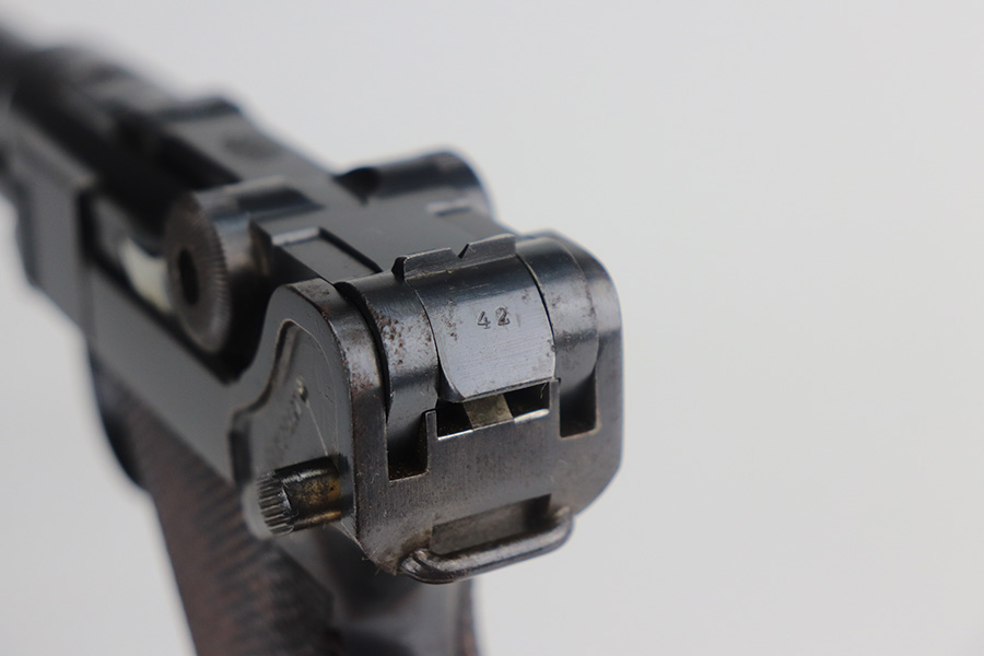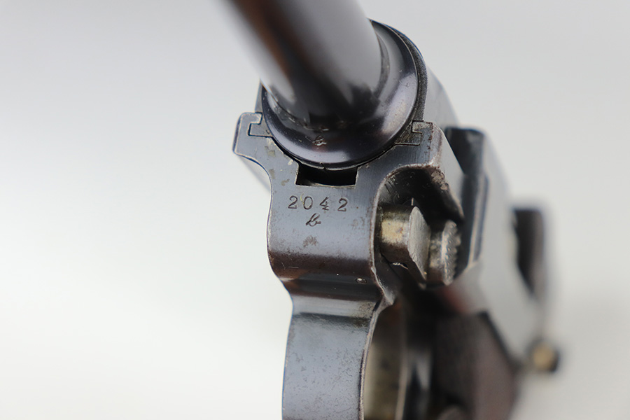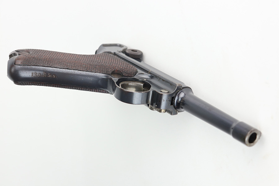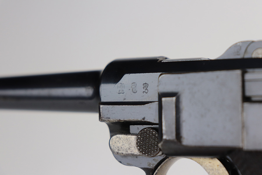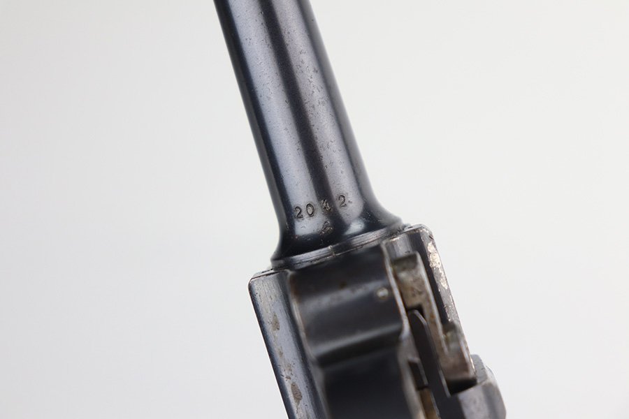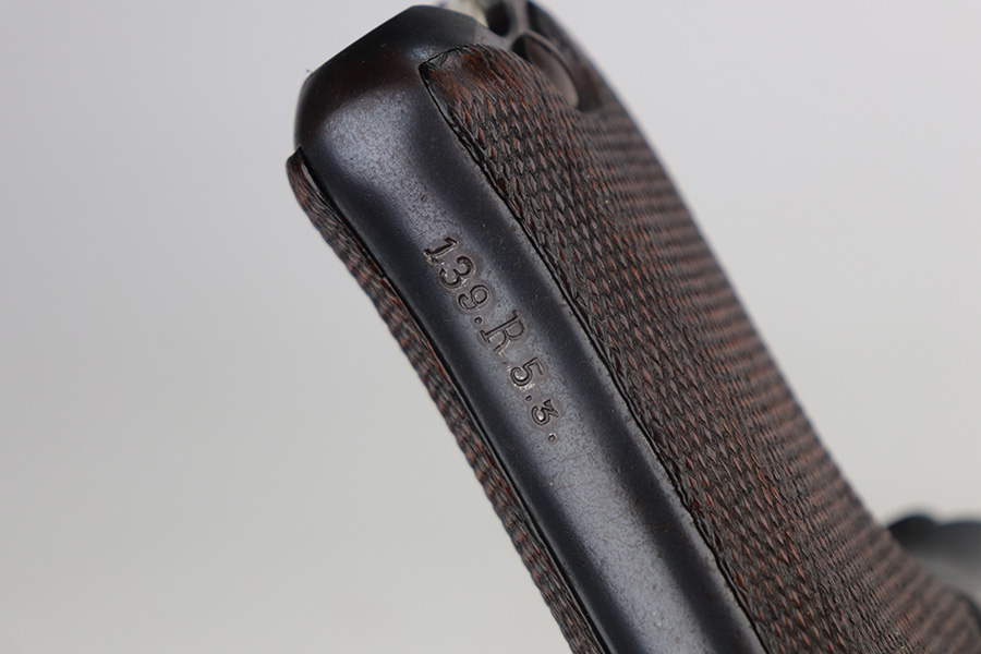 8/4/21 – This is a rare 1908 First Issue DWM military Luger with machine gun unit marking on front strap. There were only 25,000 1st issue examples produced, and roughly 6,000 were unit marked, so this is an interesting piece with a rich history. The first issue Lugers were the first military produced Lugers in 9mm, as this was one of the most requested changes in response to the earlier 1902 and 1906 models. The pistol is all matching and original with little actual bluing loss, but there is some patina on the straps and barrel, and freckling on the ears of the receiver. Minor oxidation is visible in a few areas as well. The front strap is unit marked ‘139.R.5.3’, for 139th Infantry Regiment. The grips show some smoothing and handling wear, and are unmarked. The left panel may have had a bit of lacquer on it at some point, as well. Magazine is period original with mismatched wood base. Bore has good rifling but some frost through the grooves.