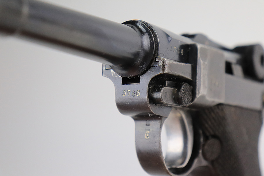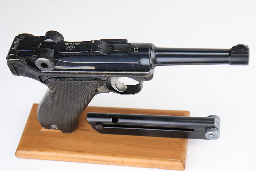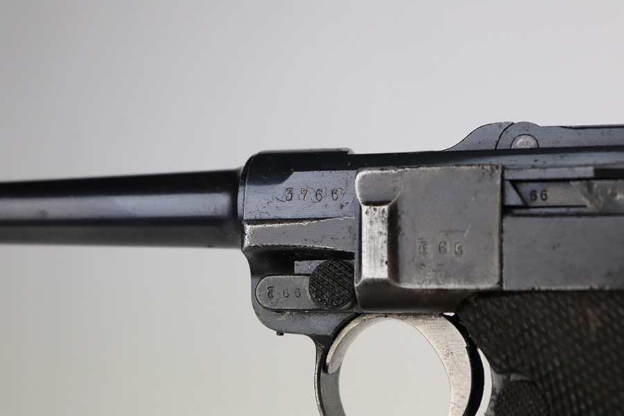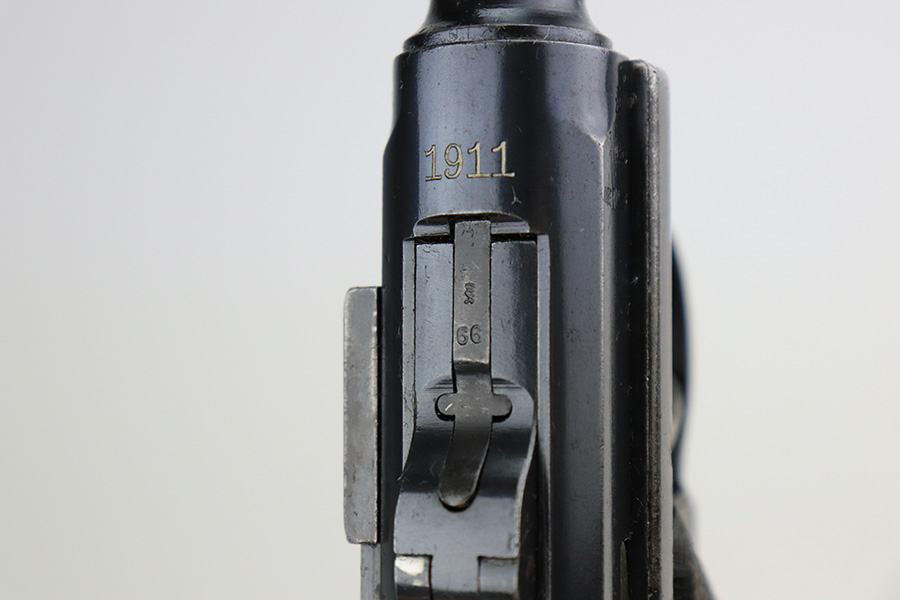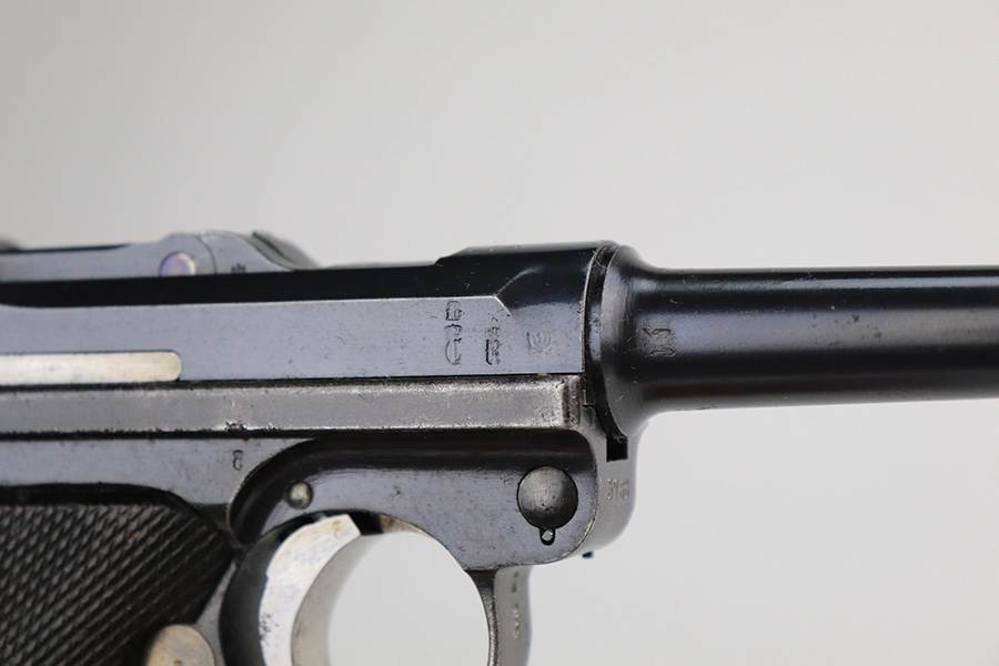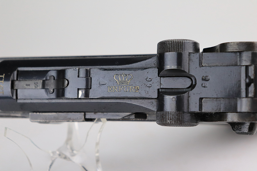 6/4/21 – This is a nice example of a rare Erfurt Luger issued to the Imperial German Army in 1911. The gun is all matching and has the proper Imperial and Erfurt proofs. The frame does not have a stock lug, which is correct for this early variation. It has retained about 92-93% of its finish. There is wear on the side plate, side rails, around the muzzle, and spotty wear on the straps. While there isn’t a lot of actual finish loss, there is spotty oxidation and minor pitting on the whole frame. Comes with slightly worn matching grips and a post-war magazine. Excellent bore – shiny with strong rifling.