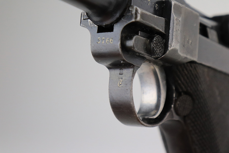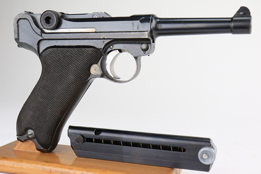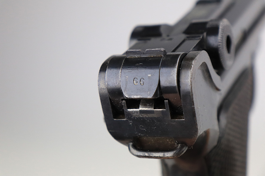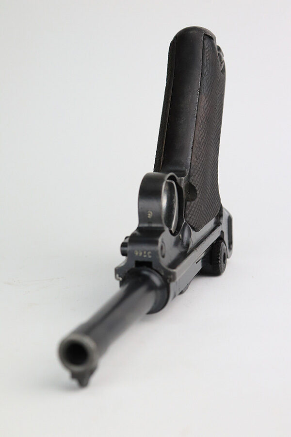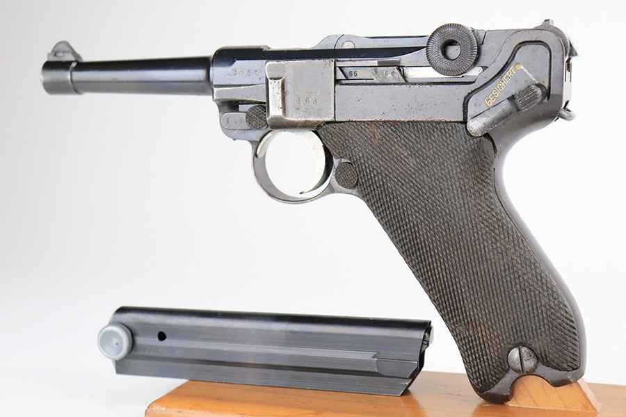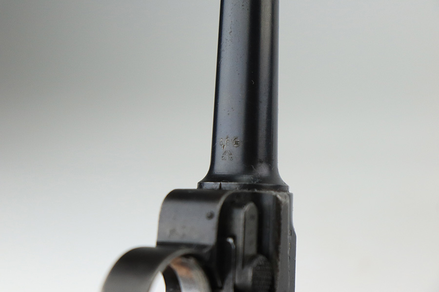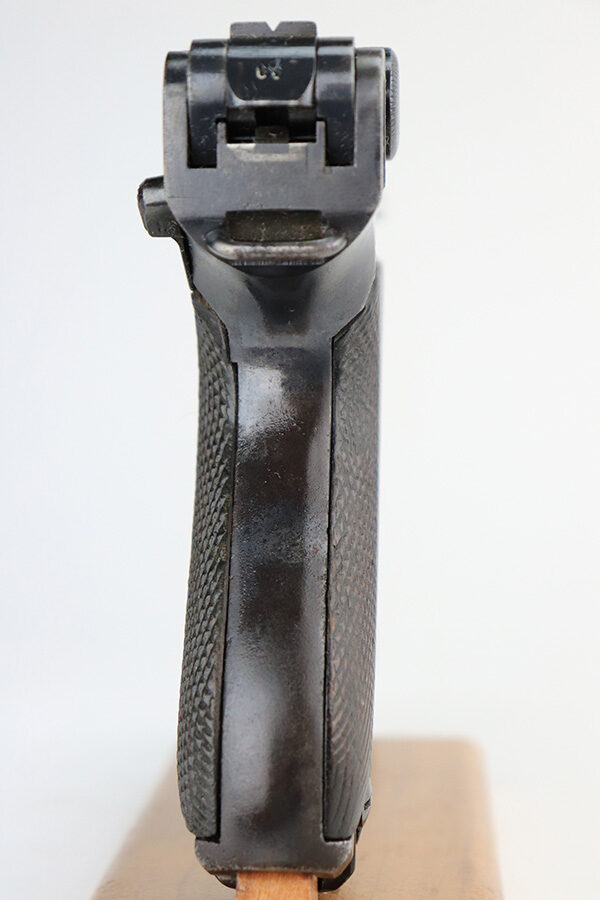 6/4/21 – This is a nice example of a rare Erfurt Luger issued to the Imperial German Army in 1911. The gun is all matching and has the proper Imperial and Erfurt proofs. The frame does not have a stock lug, which is correct for this early variation. It has retained about 92-93% of its finish. There is wear on the side plate, side rails, around the muzzle, and spotty wear on the straps. While there isn’t a lot of actual finish loss, there is spotty oxidation and minor pitting on the whole frame. Comes with slightly worn matching grips and a post-war magazine. Excellent bore – shiny with strong rifling.
