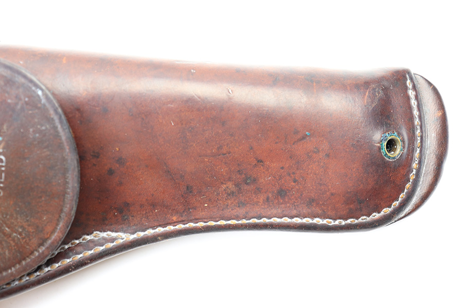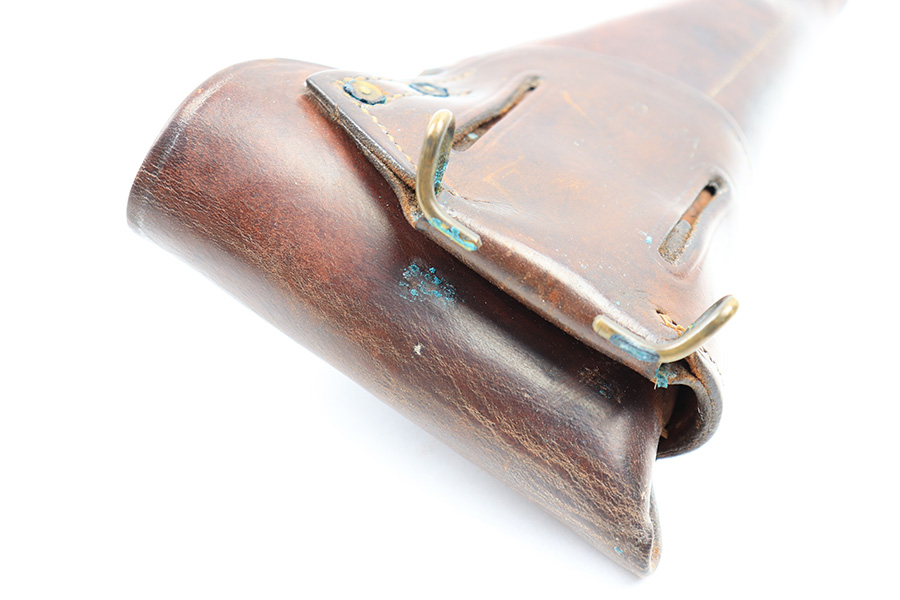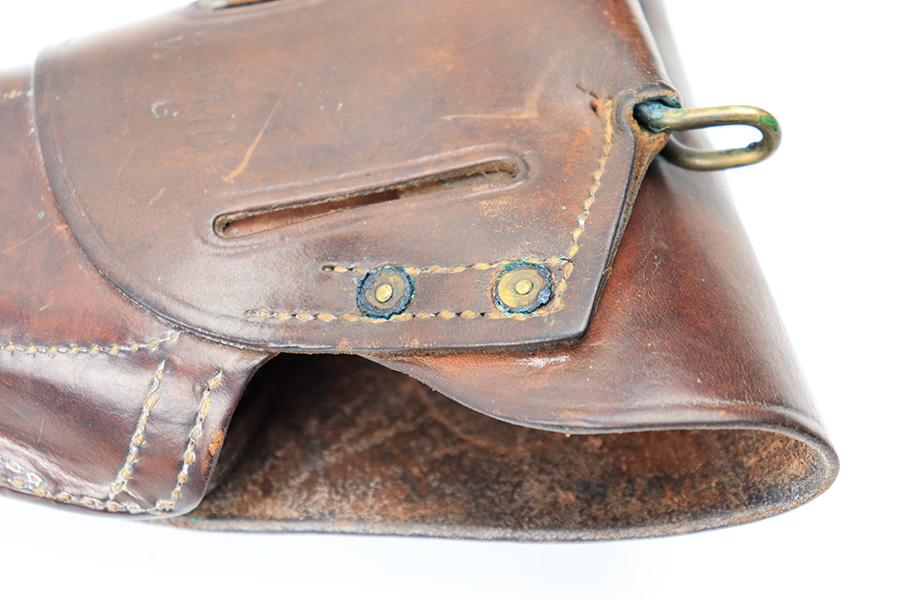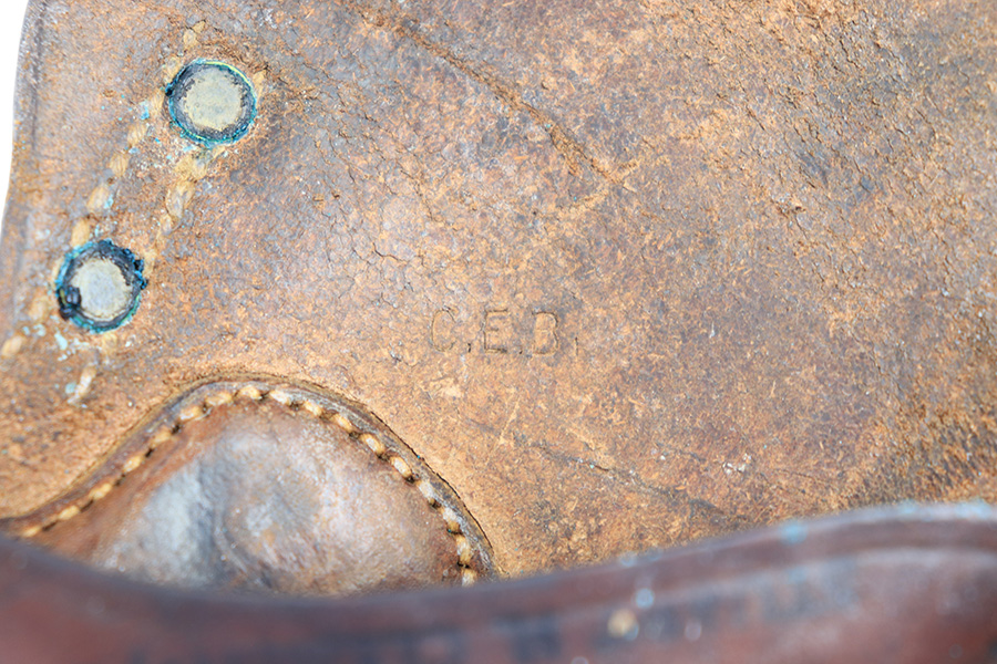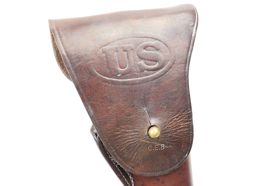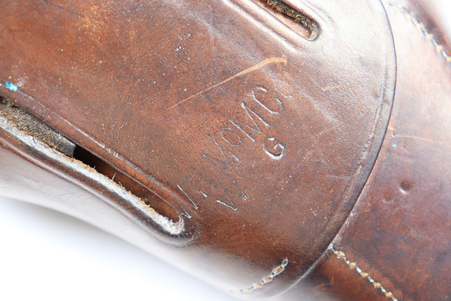 6/23/22 – This is an original m1911 pistol holster by William H McMonies Co. In May of 1918, they received a contract for 25,000 M1916 holsters from the US Government. They also produced scabbards and rifle slings. Given the small size of the contract, these are of the rarest M1916 holsters to find today. This example is in great condition with very nice leather and stitching throughout. No notable stitching flaws and no major issues with the leather. Normal pliability and typical signs of aging and previous use. The back leather is maker stamped “W.H. McM Co.” with initials “W G” underneath. The front leather has inspector initials “C.E.B.”.