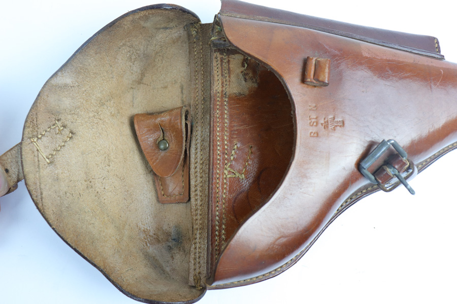 4/24/19 – This is a very interesting and rare WW1 production Luger holster. The holster is stamped on the front body of leather with “B ST N” above the maker stamp from Artillery Work, Munich and 1913 date. Research tells us this B ST N stands for “Bavarian Penitentiary at Nuremberg”. So this was a Nuremberg prison issued holster. Further, the holster is excellent and clean with strong leather and very minimal wear. Amazing for a holster this old! The front leather has a few minor surface scuffs or spots of discoloration but none of this is significant wear. All original stitching as well. A very cool collector’s holster!