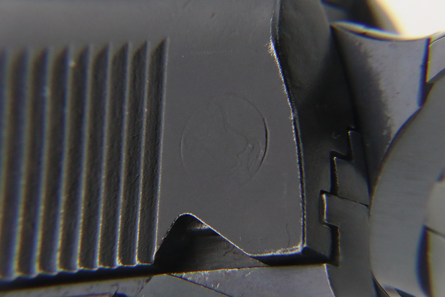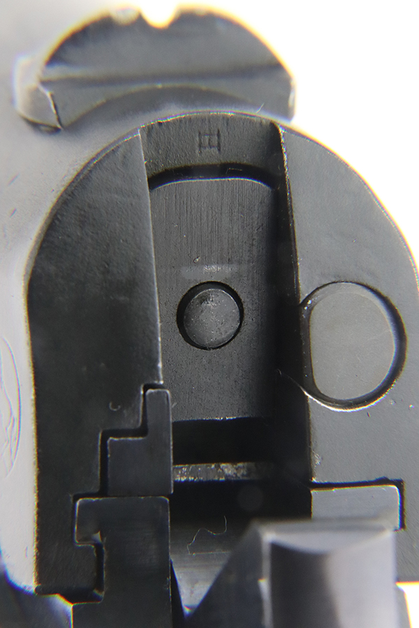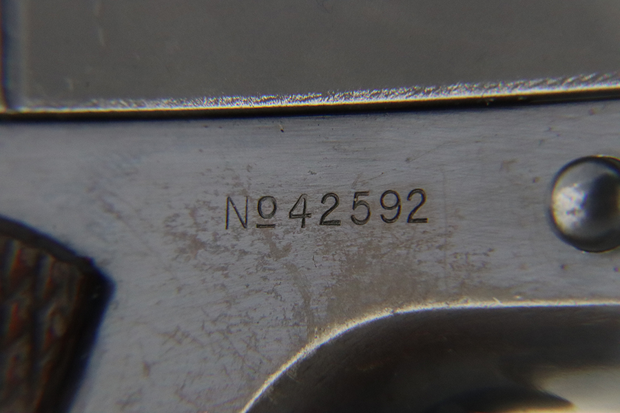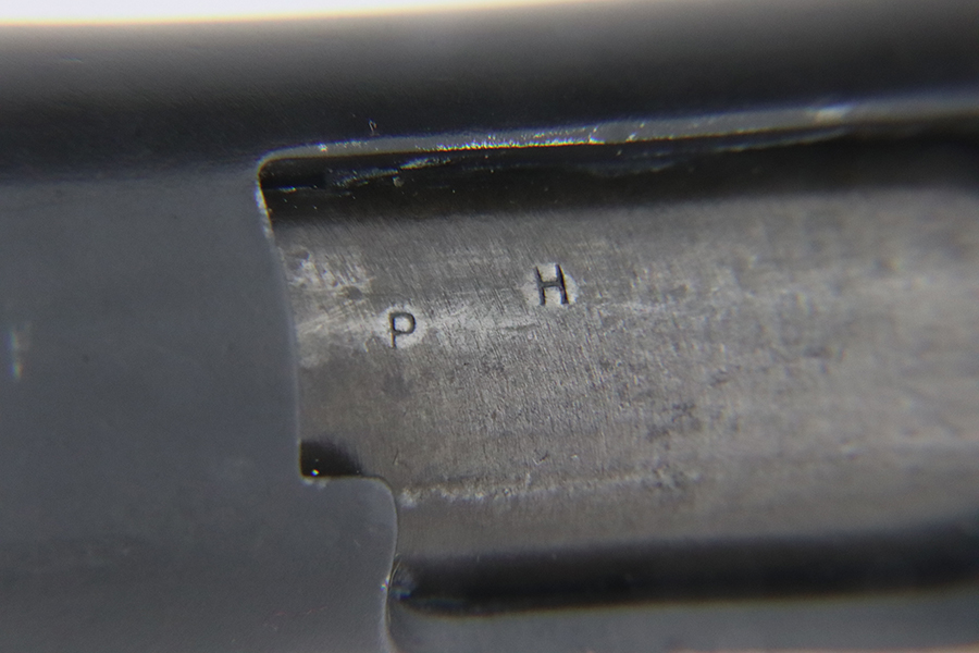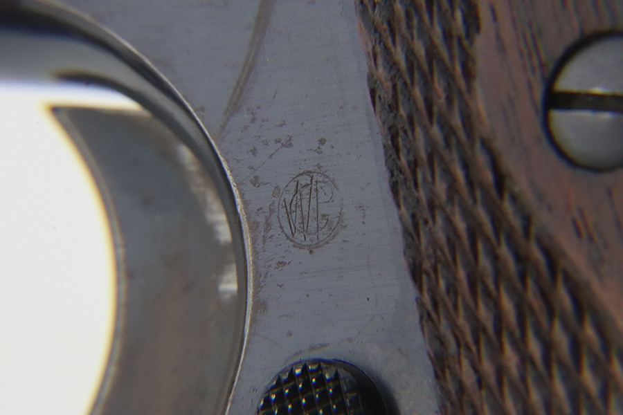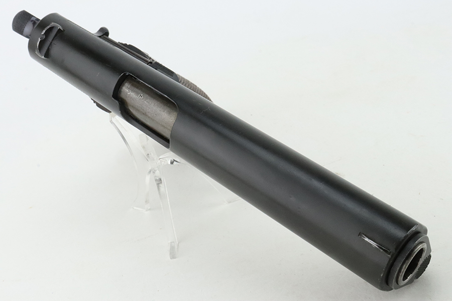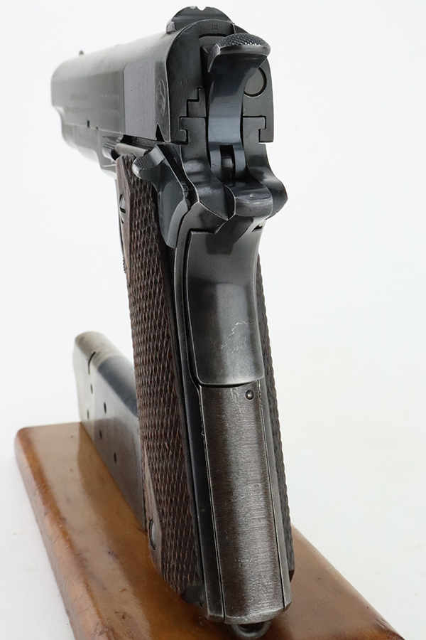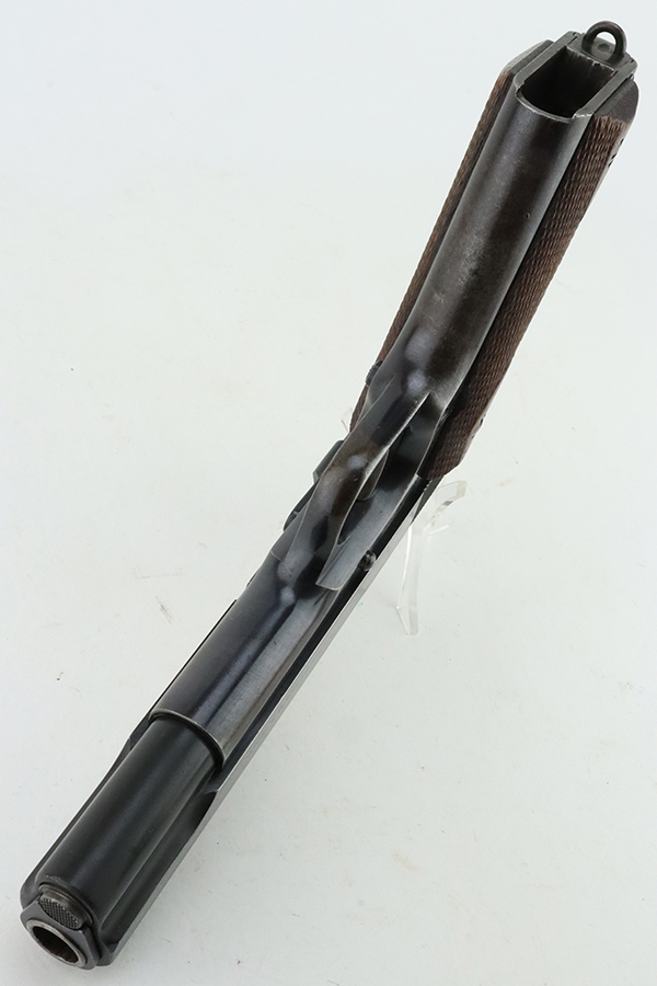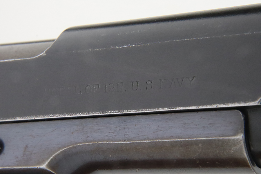 1/29/24 – This is a rare Navy-issued Colt Model 1911 from 1913. It is in the proper serial number range for this variation, has a correct “H P” Colt barrel, and has a proper 1913-pattern Navy slide. Unfortunately, the slide has been refinished – the frame has its original bluing. The majority of the finish loss comes in the form of light scratchy wear and brown patina on the grip straps. Fitted with excellent period-correct wood grips and comes with a proper two-tone magazine. The majority of the bore is very nice, but there is a small area of light surface oxidation around the muzzle end.
