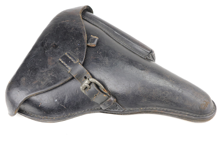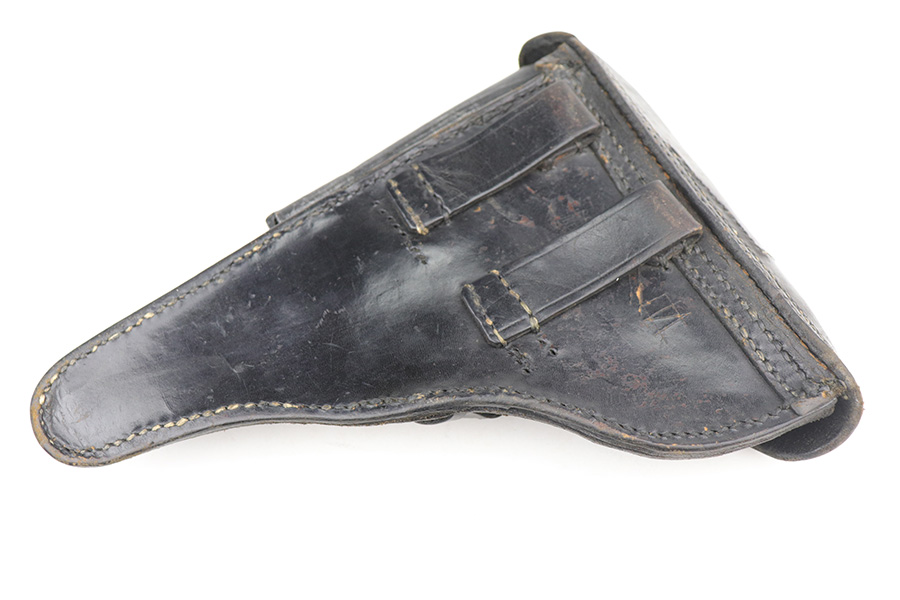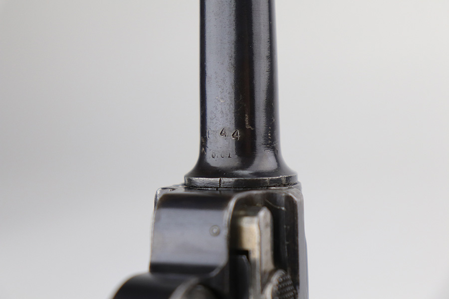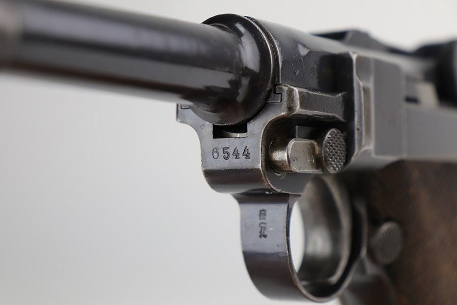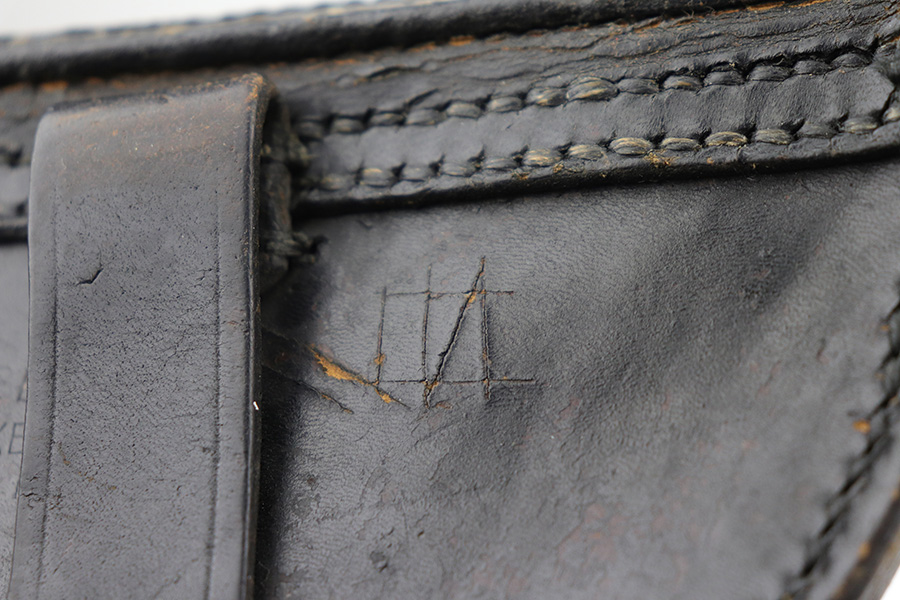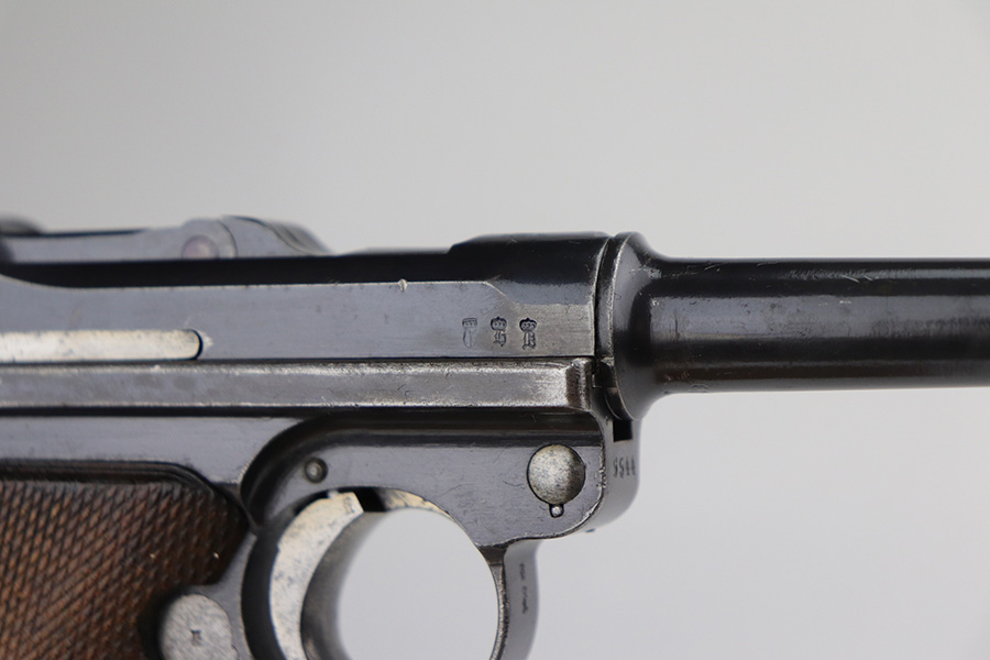 8/26/21 – This is a rare and desirable 1914 Erfurt Luger with Death’s Head unit mark over the chamber, and it also includes a 1916 dated holster that has another Death’s Head marking. The gun was originally made in 1914 for German Army issue (WW1). The Death’s Head marking is thought to be like a unit mark that tank crews and/or the Freikorps Units were known to use. Also, in the K98 world, the similar Death’s Head marking is attributed to early SS units. There is no real consensus on the meaning of these markings, so we will just present this as a Rare Death’s Head marked Luger of unknown origin. The gun has original finish and all matching metal parts. The grips match each other but not the pistol. Magazine is period original but also mismatched. Finish rates at maybe 80% with high edge wear and areas of browning on the straps. Small parts still show some straw. Erfurt proofs throughout, including the grips and grip screws. Bore has good rifling but minor frost throughout. The holster has a fairly large and clear Death’s Head marking externally, and is maker marked on the back.