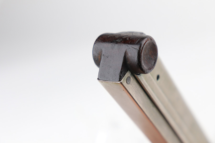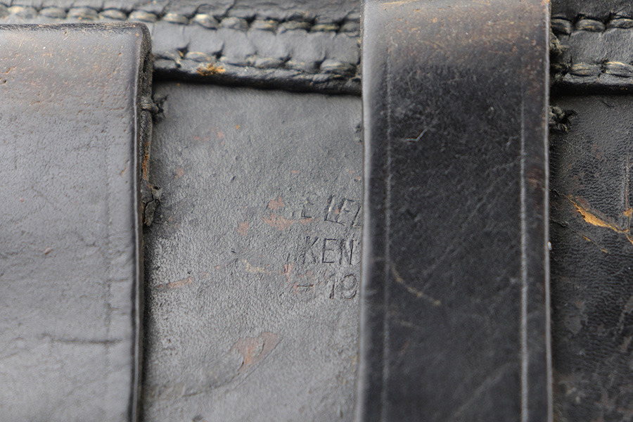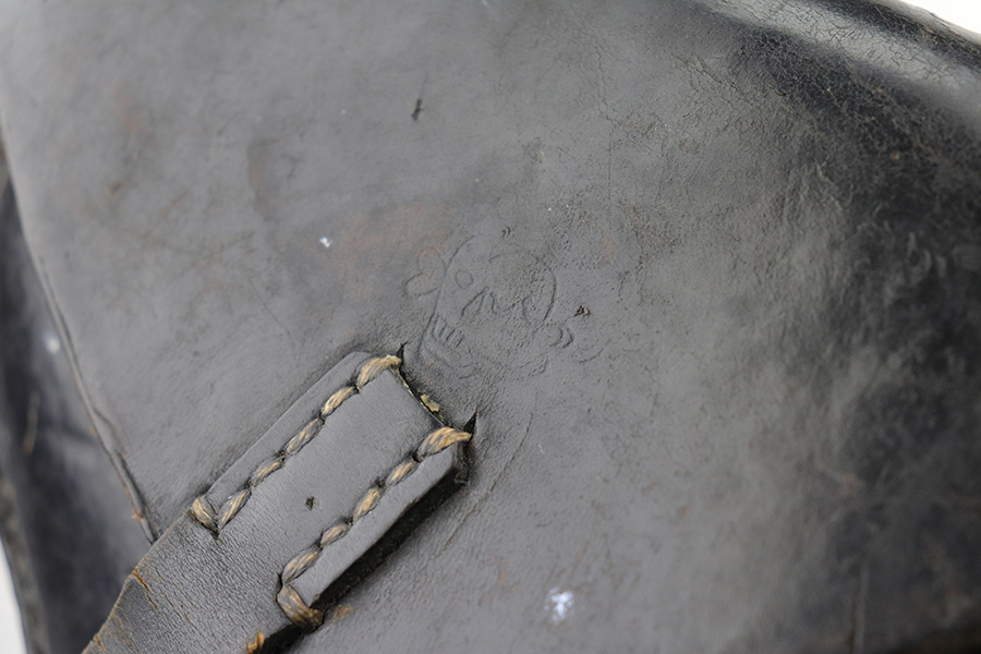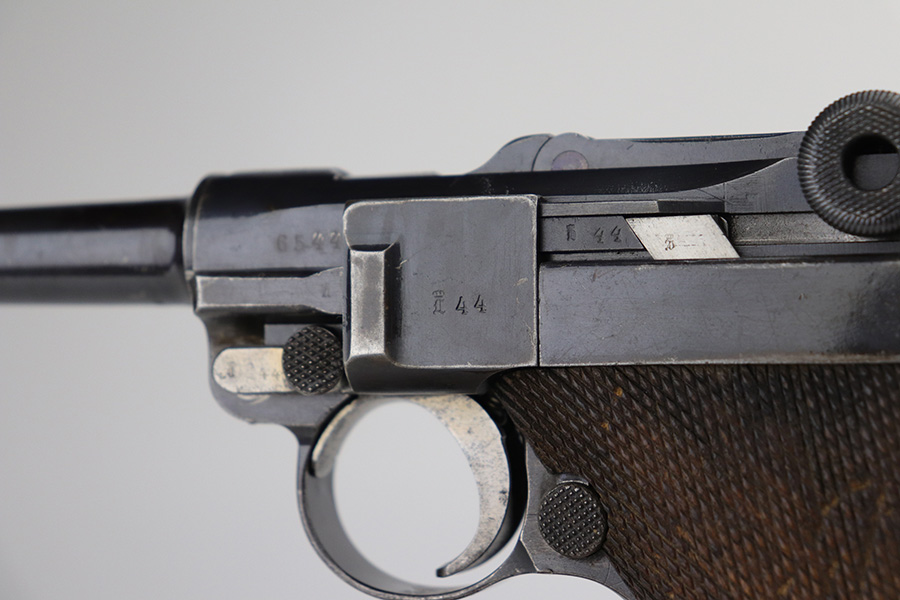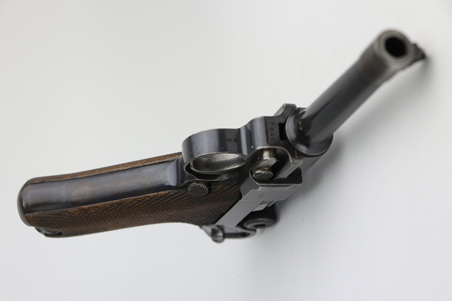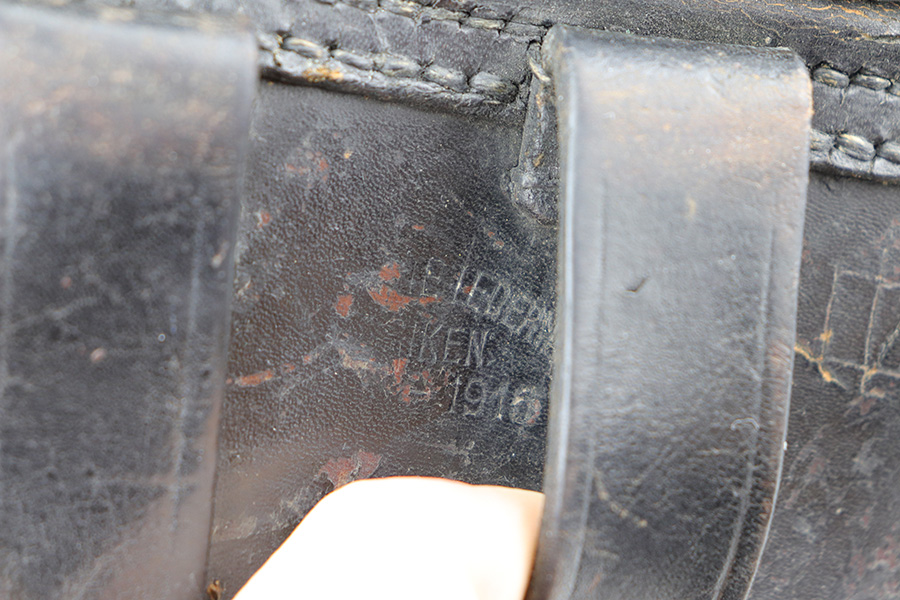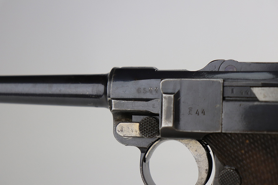 8/26/21 – This is a rare and desirable 1914 Erfurt Luger with Death’s Head unit mark over the chamber, and it also includes a 1916 dated holster that has another Death’s Head marking. The gun was originally made in 1914 for German Army issue (WW1). The Death’s Head marking is thought to be like a unit mark that tank crews and/or the Freikorps Units were known to use. Also, in the K98 world, the similar Death’s Head marking is attributed to early SS units. There is no real consensus on the meaning of these markings, so we will just present this as a Rare Death’s Head marked Luger of unknown origin. The gun has original finish and all matching metal parts. The grips match each other but not the pistol. Magazine is period original but also mismatched. Finish rates at maybe 80% with high edge wear and areas of browning on the straps. Small parts still show some straw. Erfurt proofs throughout, including the grips and grip screws. Bore has good rifling but minor frost throughout. The holster has a fairly large and clear Death’s Head marking externally, and is maker marked on the back.