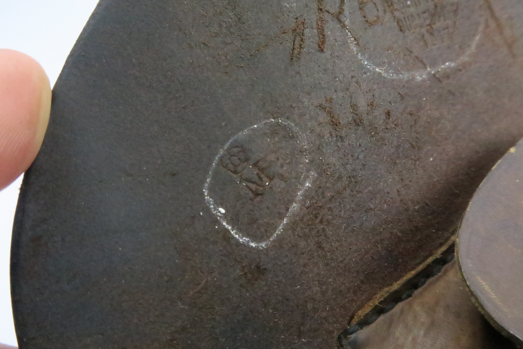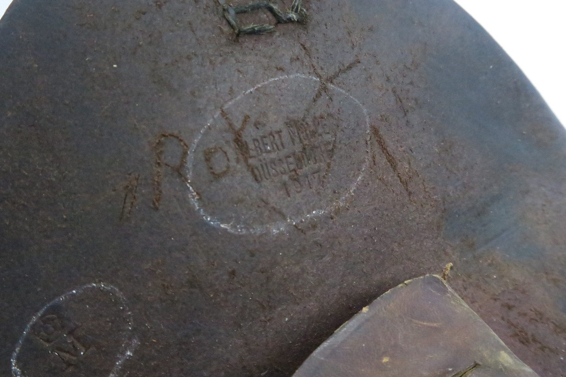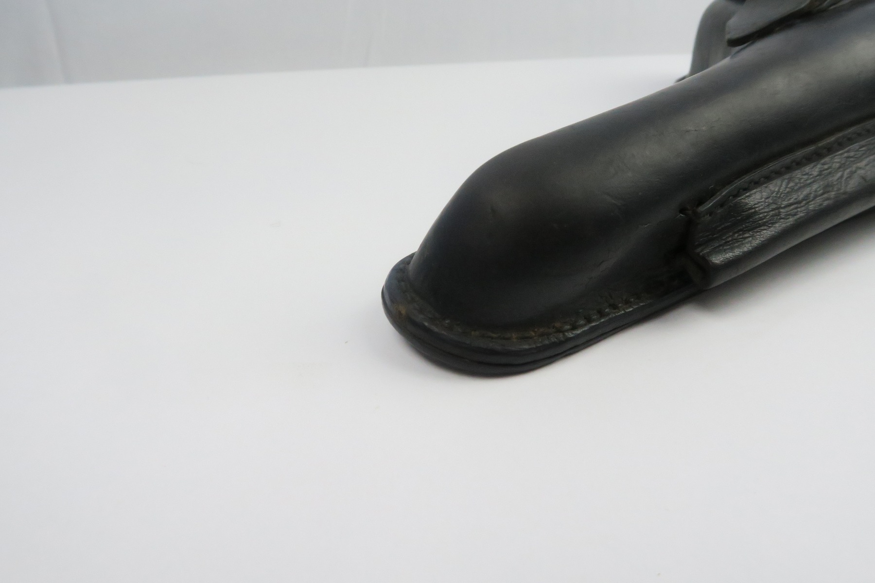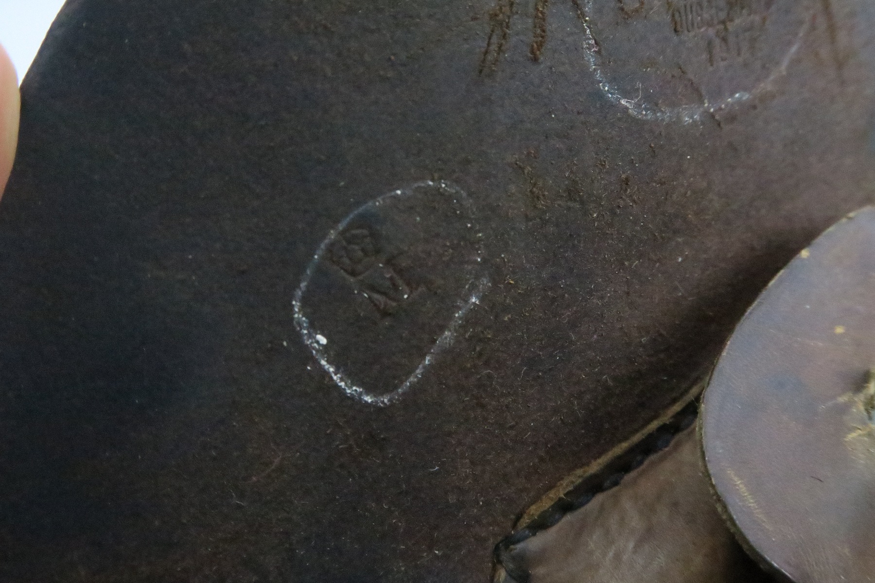 12/19/17 – This is an original WW1 production Navy stamped Luger holster. These are extremely scarce holsters, and it’s remarkable we’ve found one in this condition. The interior lid of the holster is maker stamped by Albert Moller and 1917 dated. Next to this maker and date stamp is a crown/M German Navy proof. These stamps are circled to highlight their location. The black leather is almost flawless with excellent shape and strong overall. The lid has one small spot of wear, and there are a few places of light wrinkling. The stitching is all original and correct though. Guaranteed original.