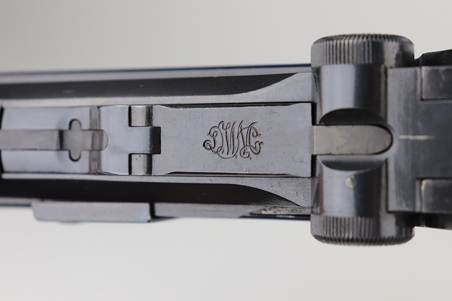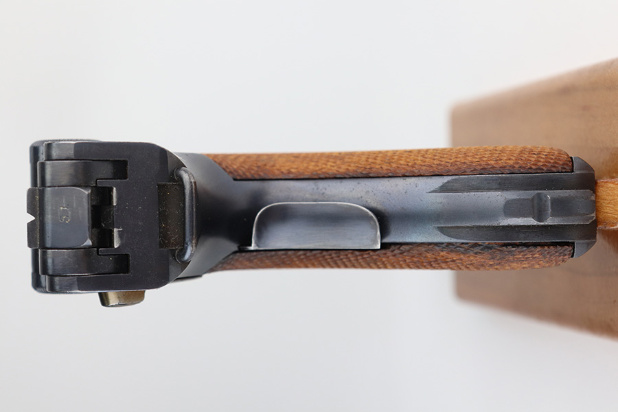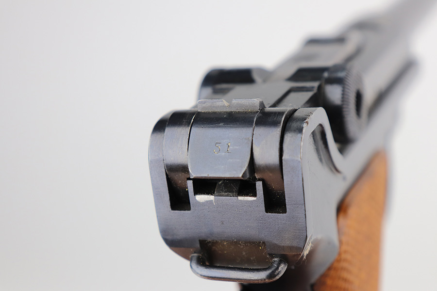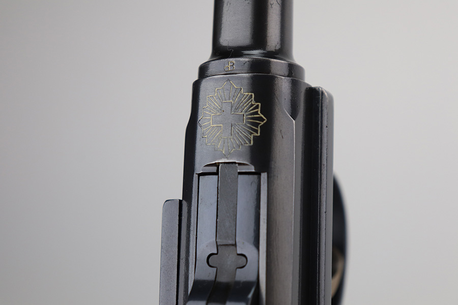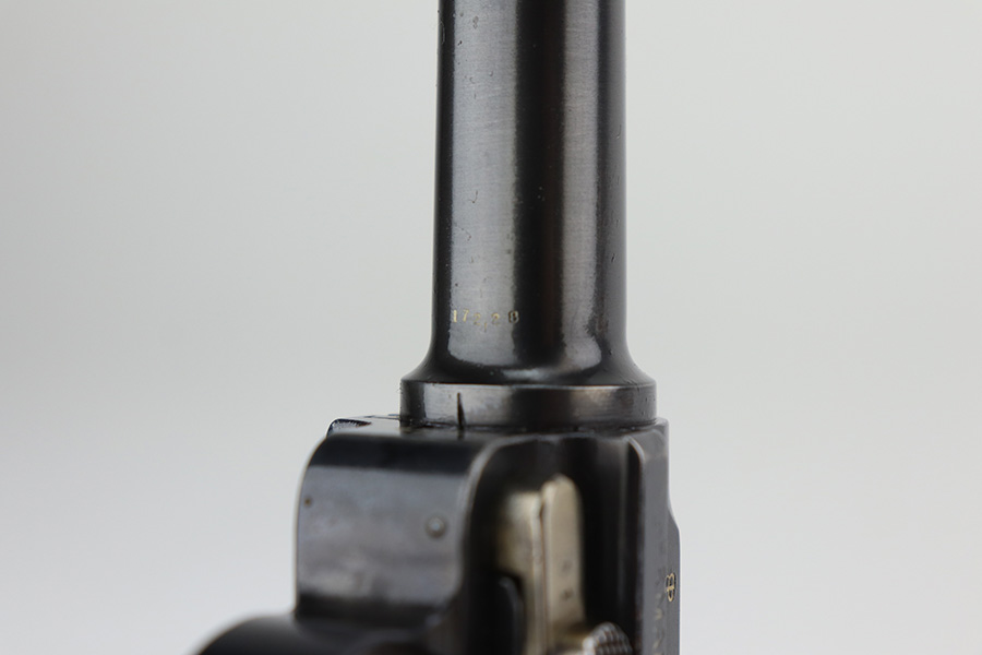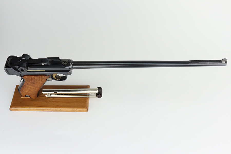 8/17/21 – This is beautiful and very rare Swiss 1920/23 DWM Luger with 12.75 inch barrel. Gorgeous bluing throughout with only minor muzzle and sideplate wear. All matching numbers throughout, including the grips. Beautiful straw on the small parts, as well. Excellent grips with sharp checkering, but there is a small crack in the left panel. Comes with Swiss magazine with plastic base. Bore has strong rifling but frost and minor freckling in the grooves.